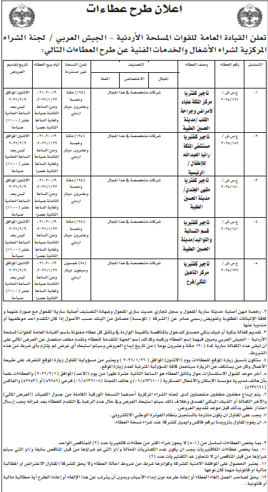 عطاءات صادرة عن القيادة العامة للقوات المسلحة الاردنية