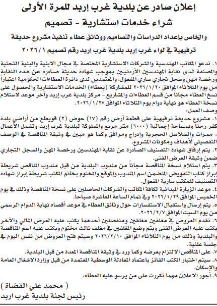 عطاء شراء خدمات استشارية لبلدية غرب اربد