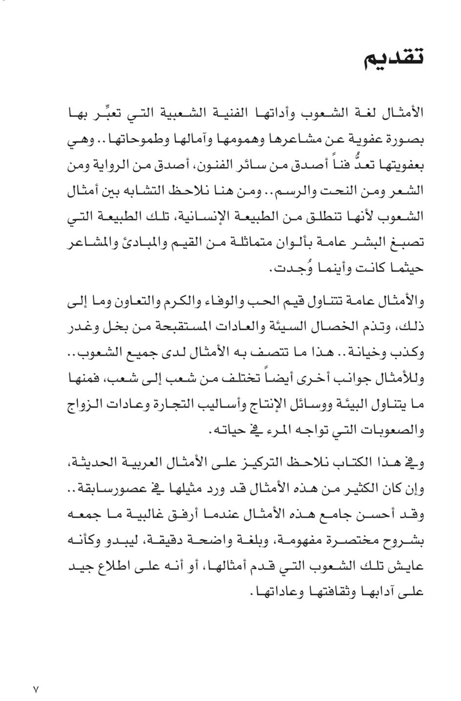 ويوضح المؤلف أن والأمثال عامة تتناول قيم الحب والوفاء والكرم والتعاون وما إلى ذلك، وتذم الخصال السيئة والعادات المستقبحة من بخل وغدر وكذب وخيانة وهو ما تتصف به الأمثال لدى جميع الشعوب، وينوه إلى أن للأمثال جوانب أخرى تختلف من شعب إلى شعب، فمنها ما يتناول البيئة ووسائل الإنتاج وأساليب التجارة وعادات الزواج والصعوبات التي تواجه المرء في حياته.