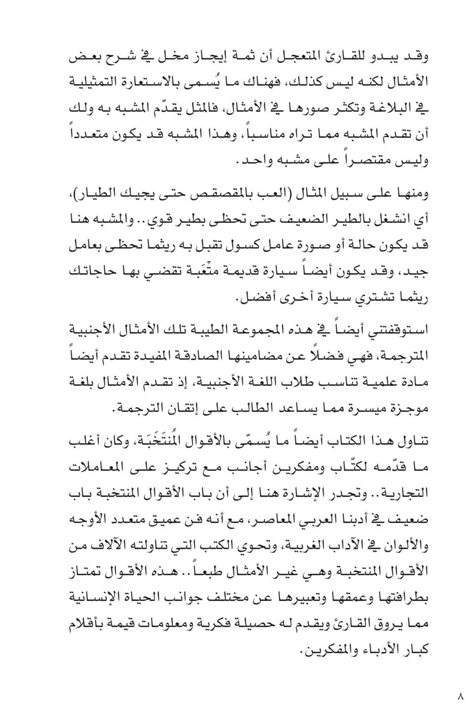 ويركز الكاتب على الأمثال العربية الحديثة وإن كان الكثير من هذه الأمثال قد ورد مثيلها في عصور سابقة. وقد جمع المؤلف هذه الأمثال وأرفق غالبية ما جمعه بشروح مختصرة مفهومة، وبلغة واضحة دقيقة، ليبدو وكأنه عايش تلك الشعوب التي قدم أمثالها ، أو أنه على اطلاع جيد على آدابها وثقافتها وعاداتها.