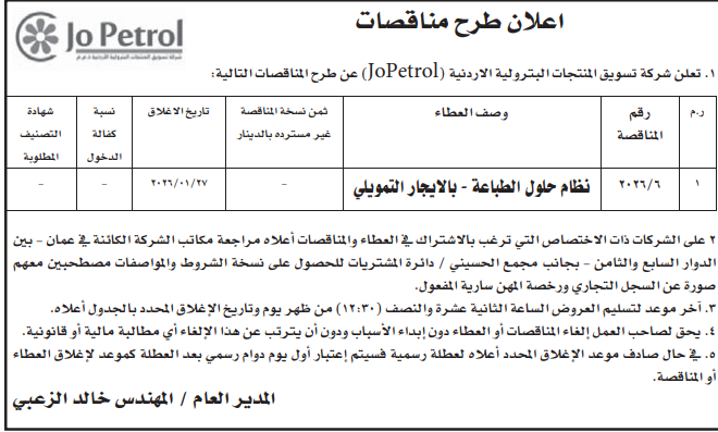 عطاء صادر عن شركة جوبترول