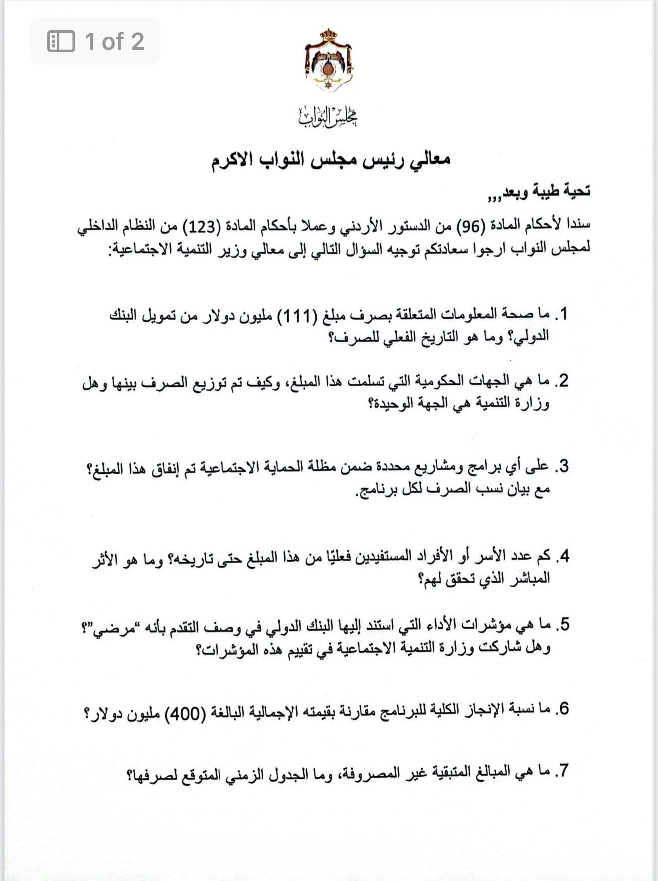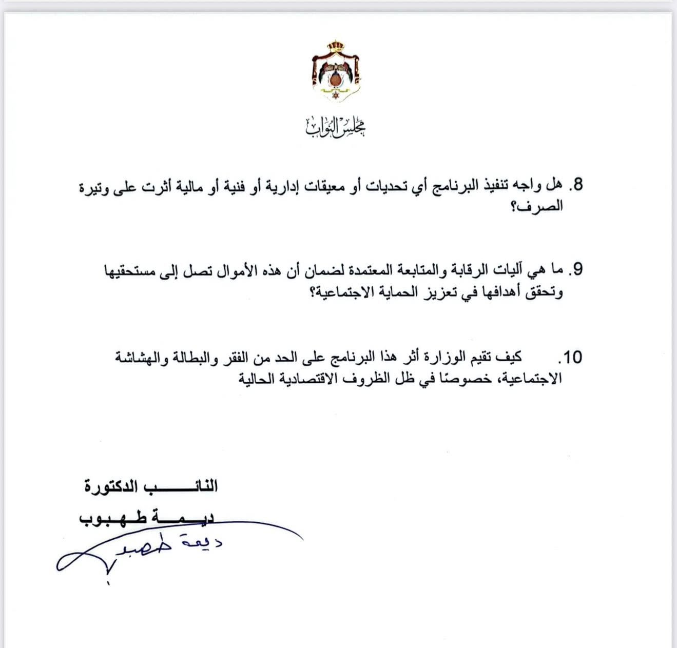وفي هذا السياق، وجهت طهبوب حزمة من الأسئلة النيابية للحكومة، طلبت فيها توضيح صحة المعلومات المتداولة حول صرف المبلغ، وبيان التاريخ الفعلي لعملية الصرف، والجهات الحكومية التي تسلمت التمويل، وآلية توزيع الإنفاق بينها، وما إذا كانت وزارة التنمية الاجتماعية هي الجهة الوحيدة المعنية بتنفيذه.