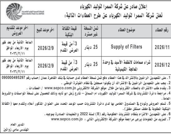 عطاء صادر عن شركة السمرا لتوليد الكهرباء