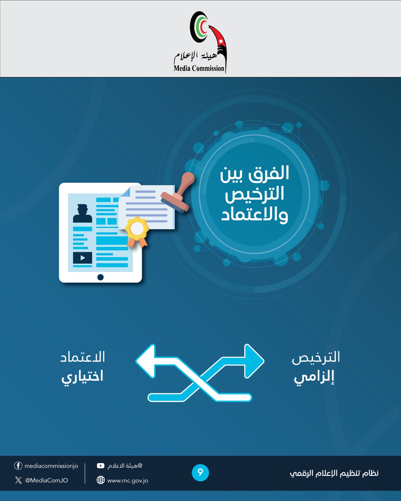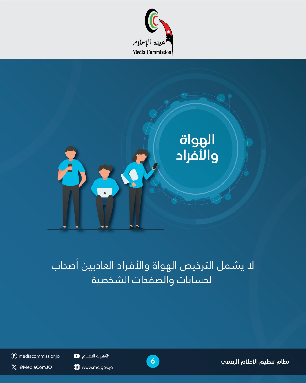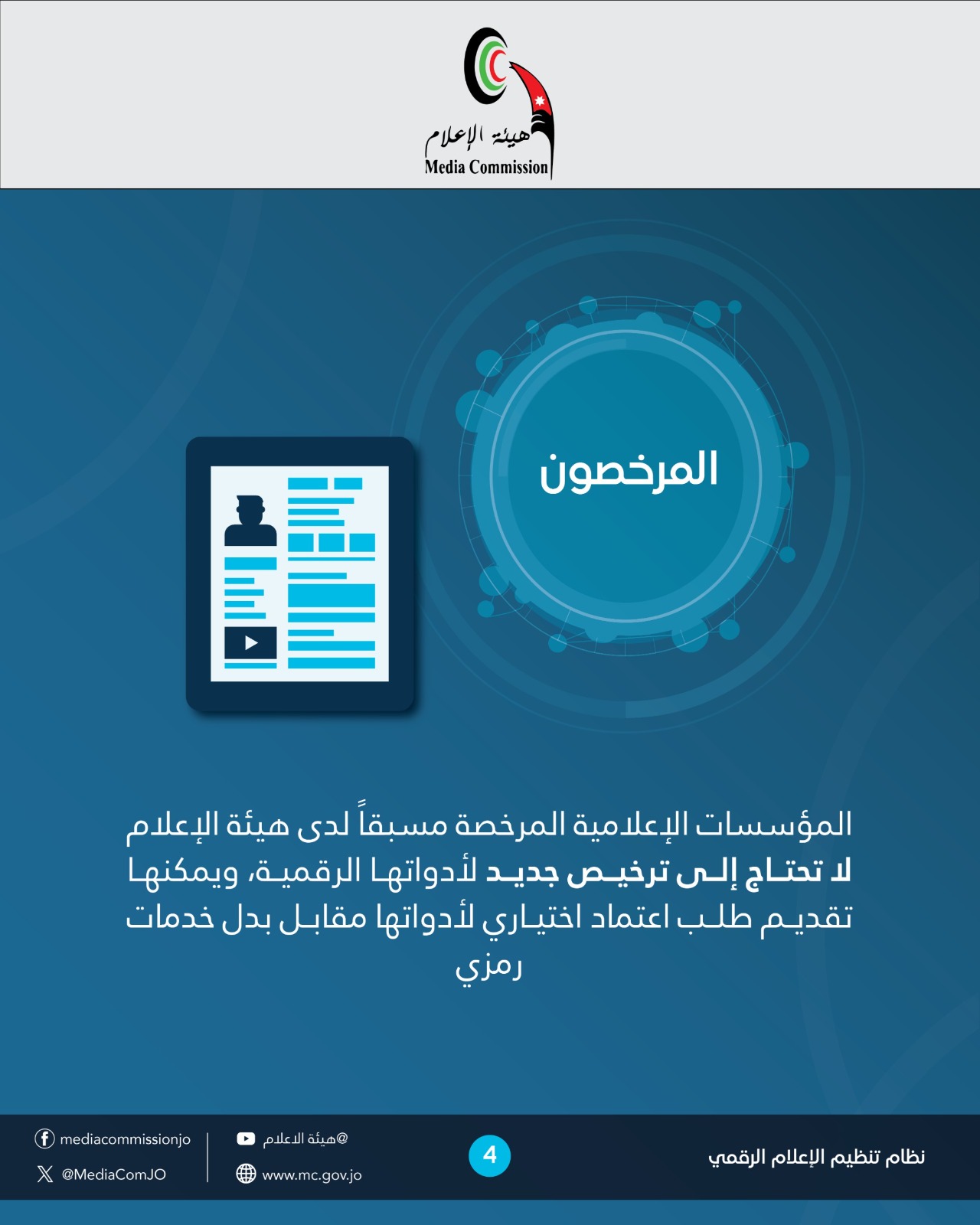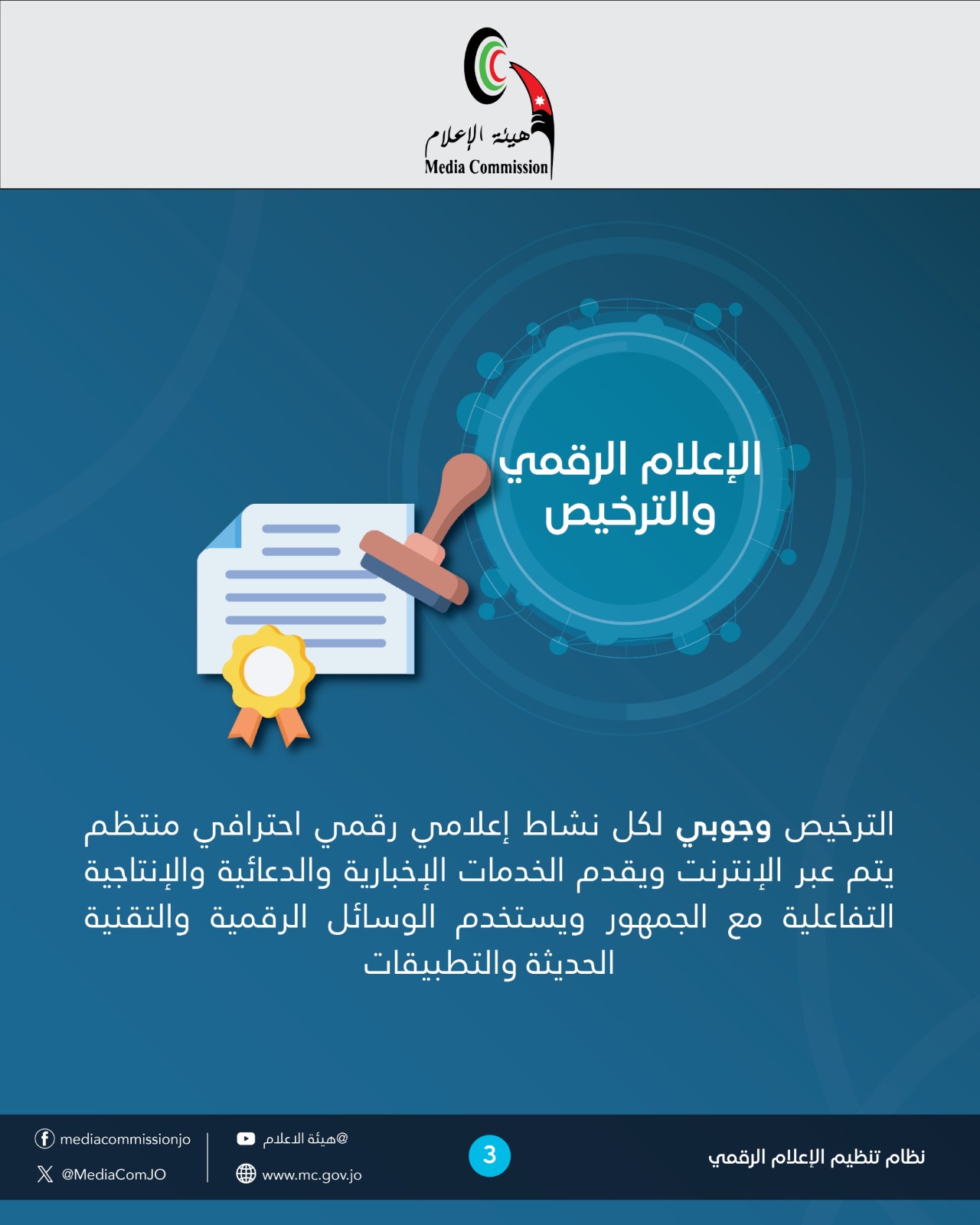 كل من يقوم بنشاط يرخص حاليا لدى هيئة الإعلام في قطاعات مثل: الإذاعات ومحطات التلفزة ودور النشر والتوزيع ومراكز الدراسات والأبحاث وشركات الإنتاج وغيرها مما نصت عليه التشريعات ذات العلاقة هو ملزم بالترخيص في حال قيامه بممارسة هذا النشاط رقميا وبشكل محترف.