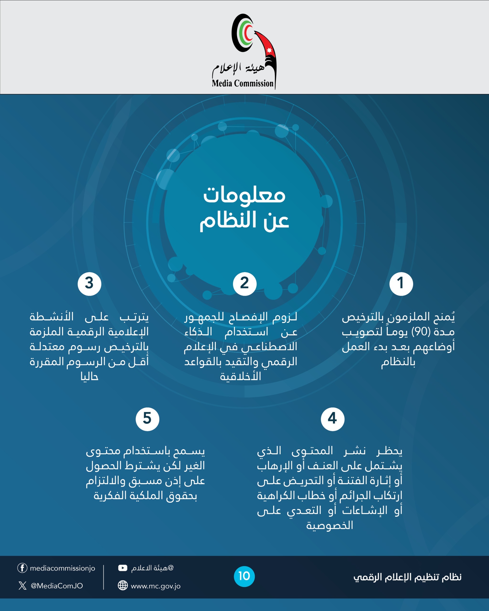 وأكد النظام الالتزام بحقوق الملكية الفكرية، وحظر بث أو نشر أي محتوى يتضمن العنف أو الإرهاب أو خطاب الكراهية أو الأخبار الكاذبة أو المحتوى المضلل، أو ما يمس القيم المجتمعية والآداب العامة، مع منح الهيئة صلاحيات رقابية وإنفاذية واسعة، بما في ذلك الضابطة العدلية.