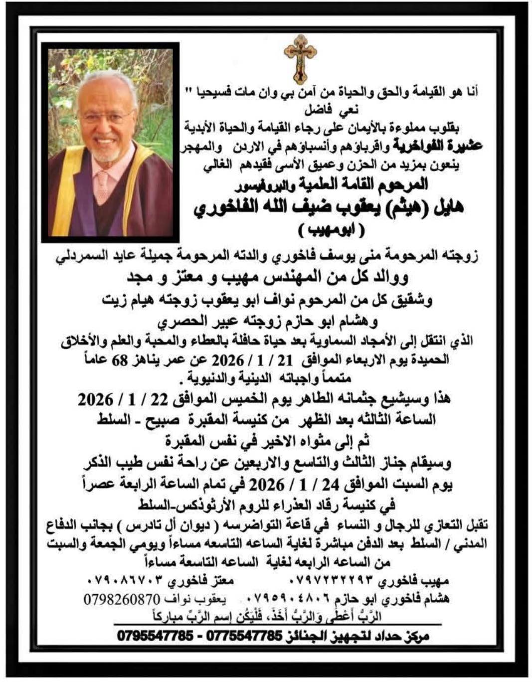 البروفيسور هايل (هيثم) يعقوب الفاخوري في ذمة الله21-01-2026 10:05 PM