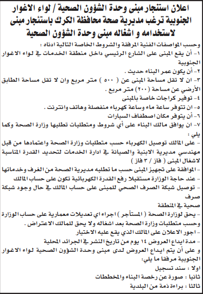 عطاء استئجار مبنى لوحدة الشؤون الصحية/ الاغوار الجنوبية