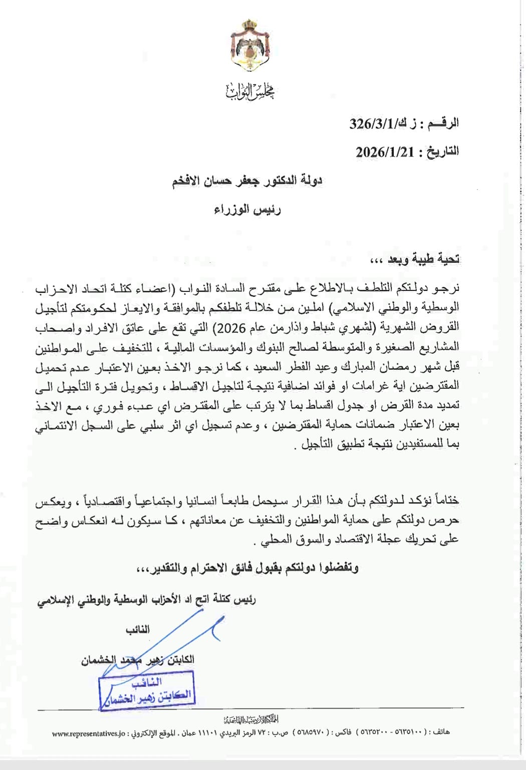 عمون - وجّه رئيس كتلة اتحاد الأحزاب الوسطية والوطني الإسلامي النيابية، النائب زهير الخشمان، مذكرة نيابية إلى دولة رئيس الوزراء الدكتور جعفر حسان، طالب فيها الحكومة بتأجيل الأقساط الشهرية المترتبة على الأفراد وأصحاب المشاريع الصغيرة والمتوسطة لصالح البنوك والمؤسسات المالية، خلال شهري شباط وآذار من عام 2026.