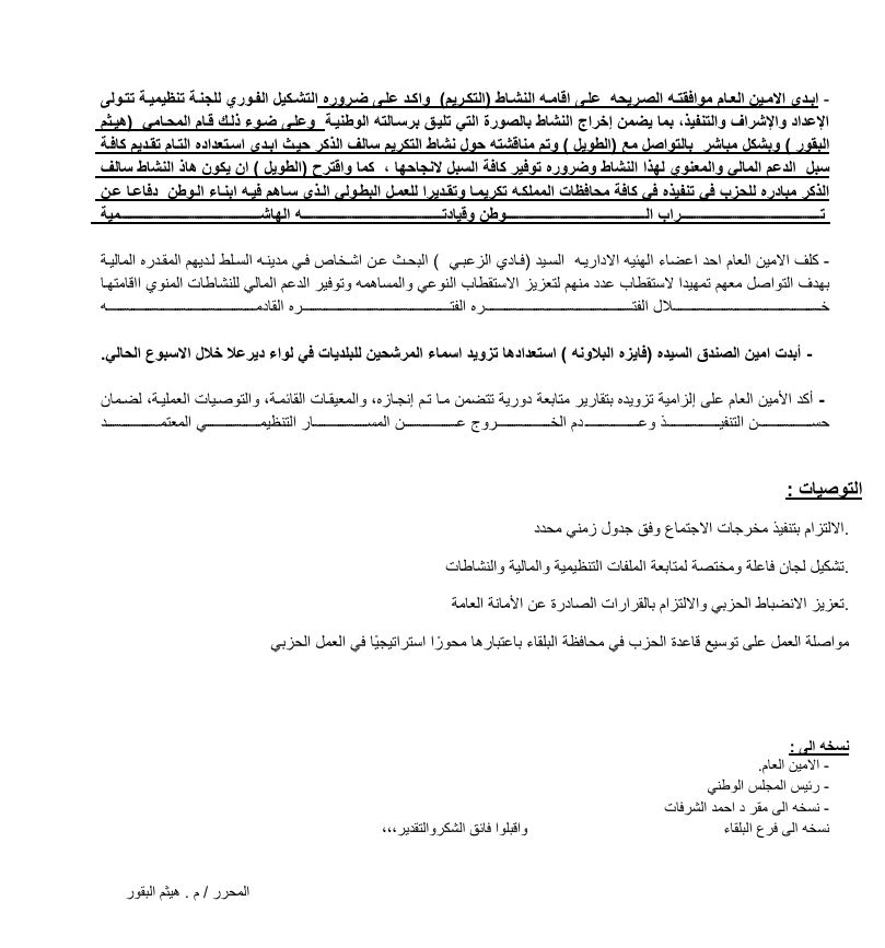 بسم الله، أعلن افتتاح أعمال هذا الاجتماع، متمنياً له التوفيق والنجاح، والخروج بنتائج تخدم الحزب والوطن.