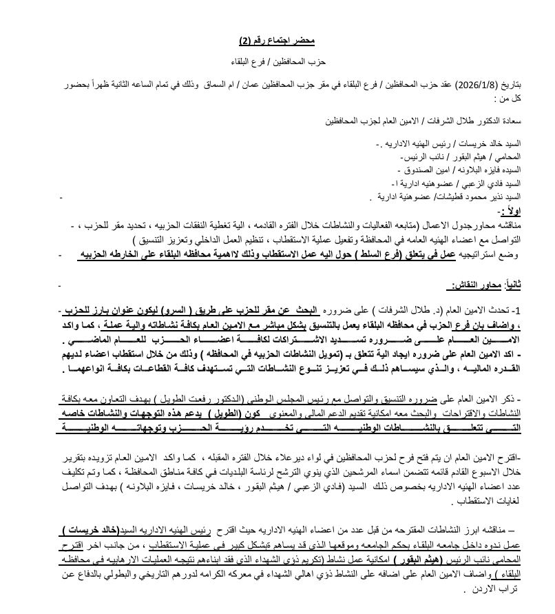 أثق بكم، وبوعيكم، وبحرصكم على مصلحة حزب المحافظين الأردني، وبقدرتنا معاً على تعزيز حضورنا كحزب وطني مسؤول، راسخ في هويته، ومنسجم مع الرؤية الملكية، وقريب من الناس.