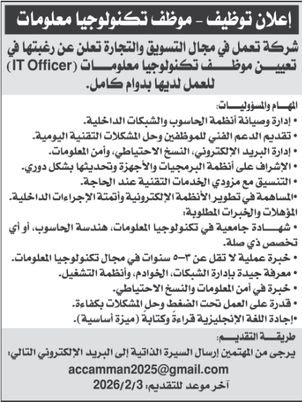 مطلوب موظف تكنولوجيا معلومات
