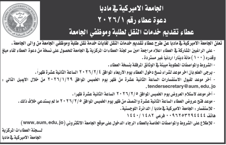 عطاء تقديم خدمات نقل طلاب وموظفي الجامعة الامريكية في مادبا