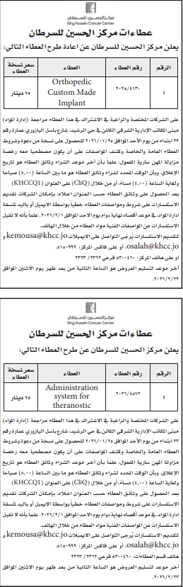 عطاءات صادرة عن مركز الحسين للسرطان