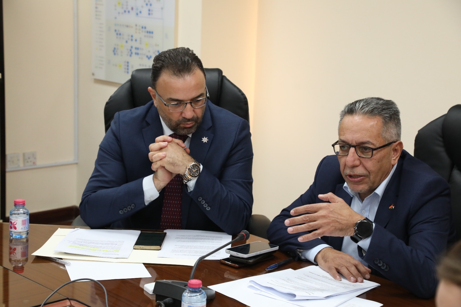 وتناول اللقاء اهم التحديات التي تواجه قطاع المياه والاجراءات التي تتخذها الوزاره للحد منها ومنها مواجهة التغير المناخي داعيا الى الاستفادة من الخبرات التقنية الألمانية في إدارة المصادر المائية وتقليل الفاقد المائي حيث تم مناقشة الآثار المباشرة للتغيرات المناخية على الواقع المائي وضرورة تبني حلول مبتكرة للتكيف مع الجفاف وتذبذب الأمطار. واهم المشاريع التي تنفذها وزارة المياه ومنها الناقل الوطني الذي سيوفر 300 م.م3 من المياه سنويا .