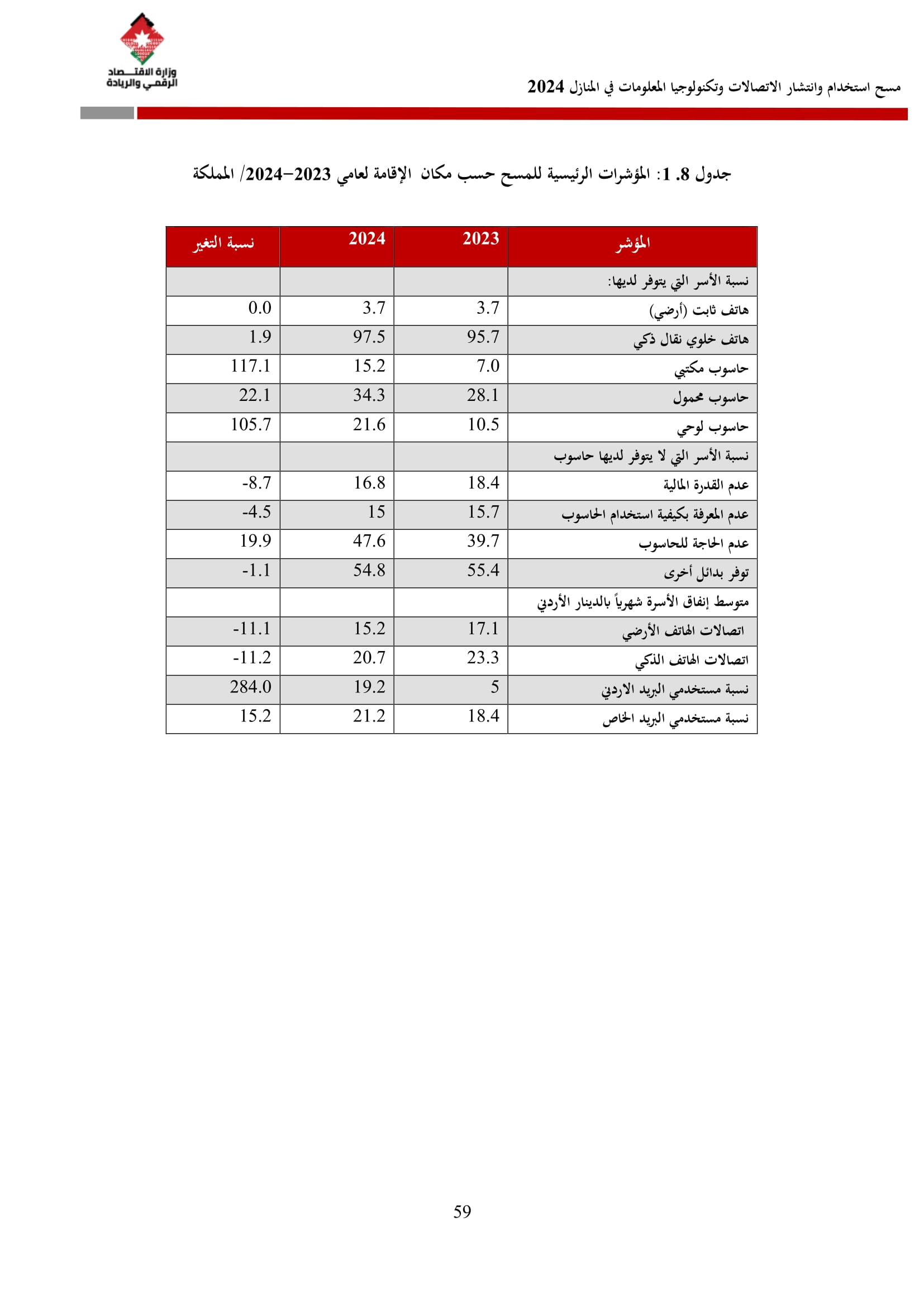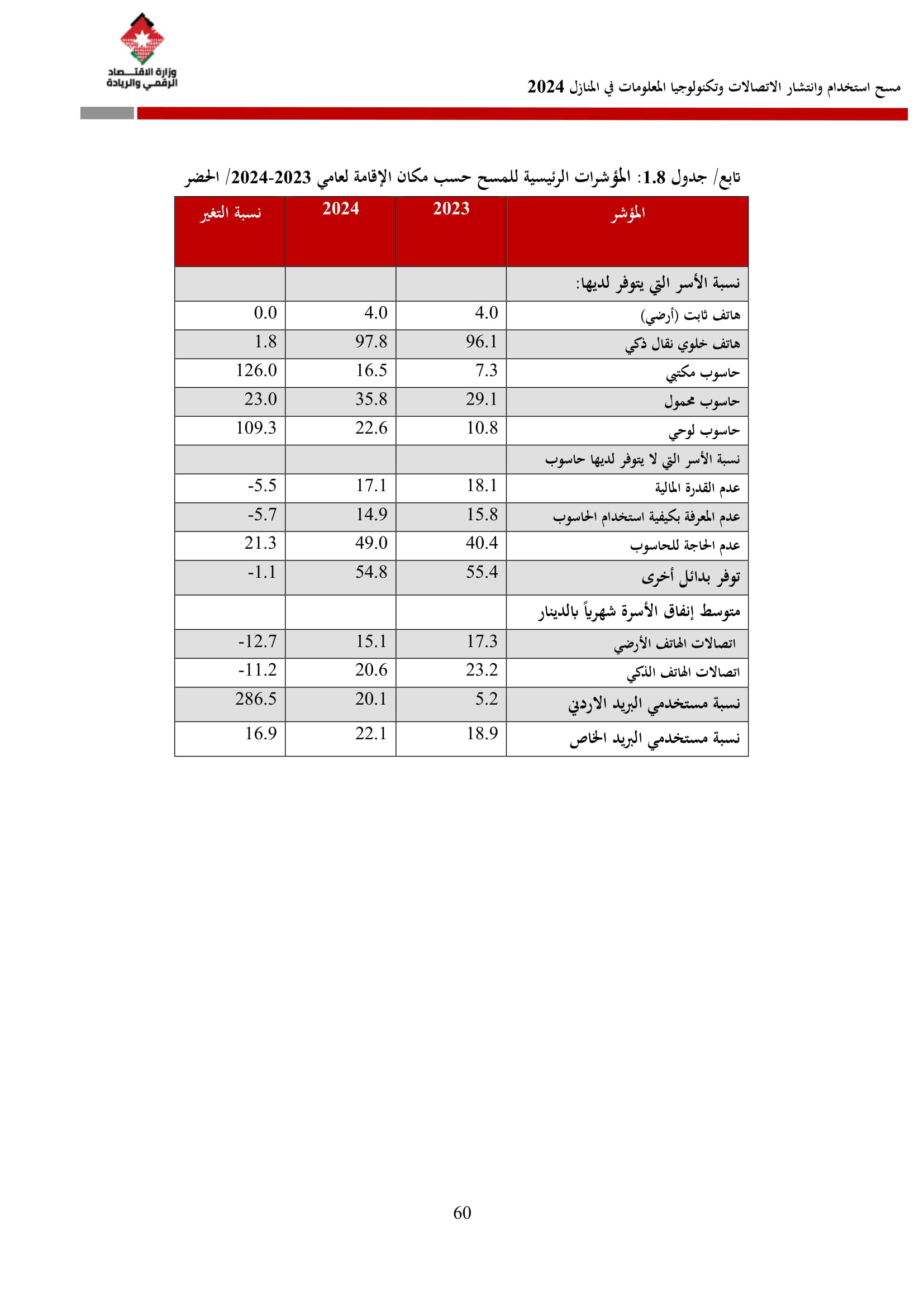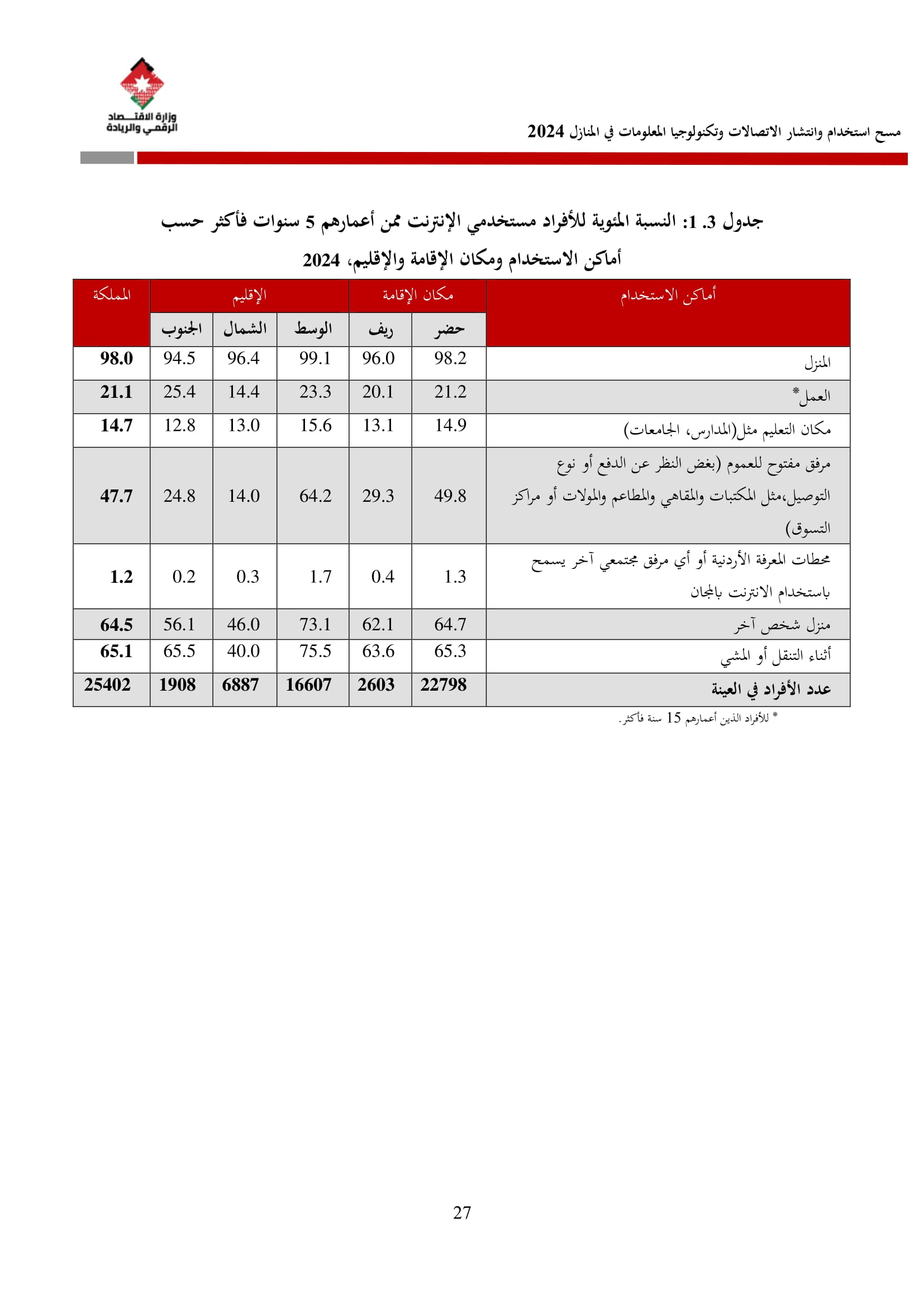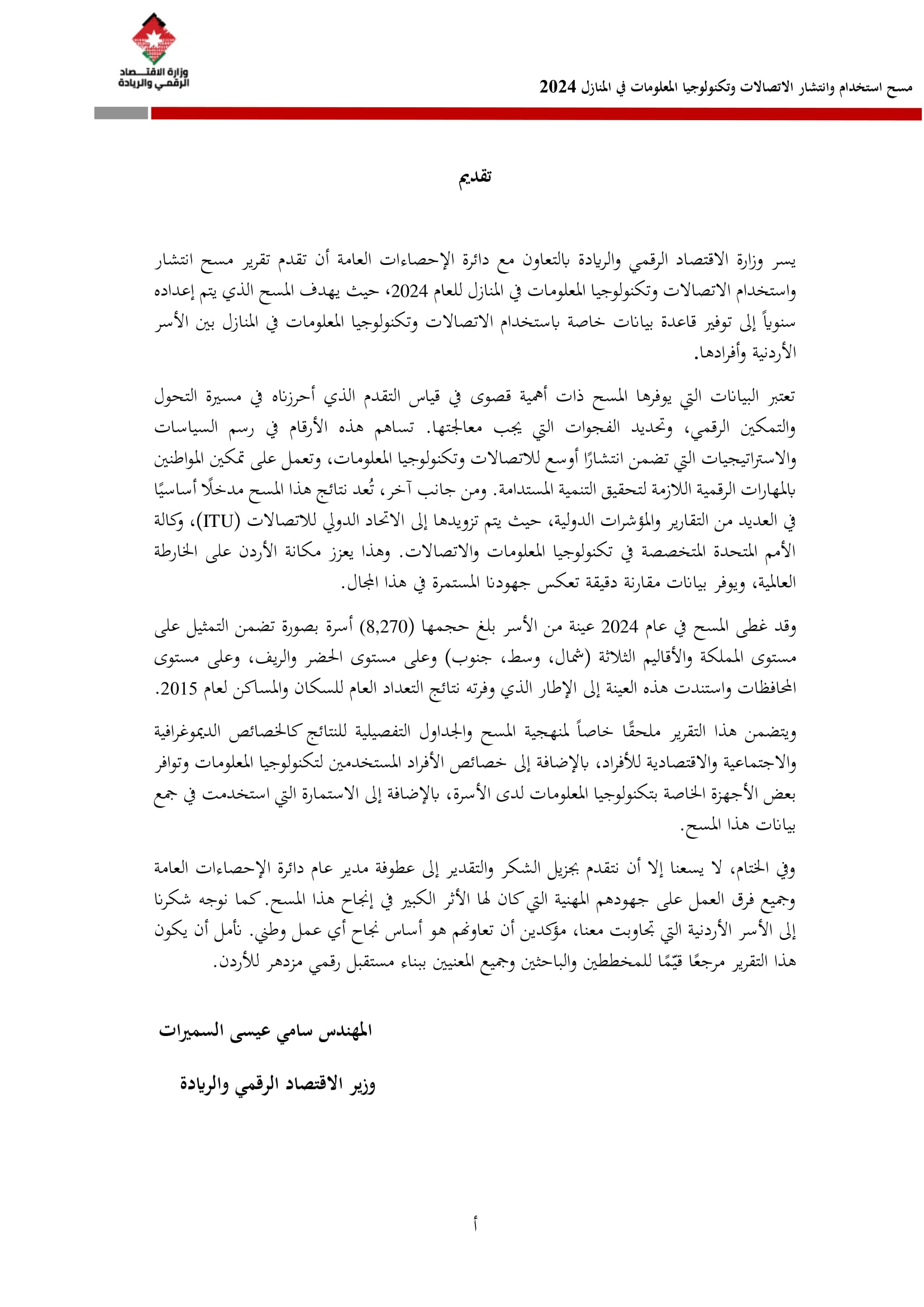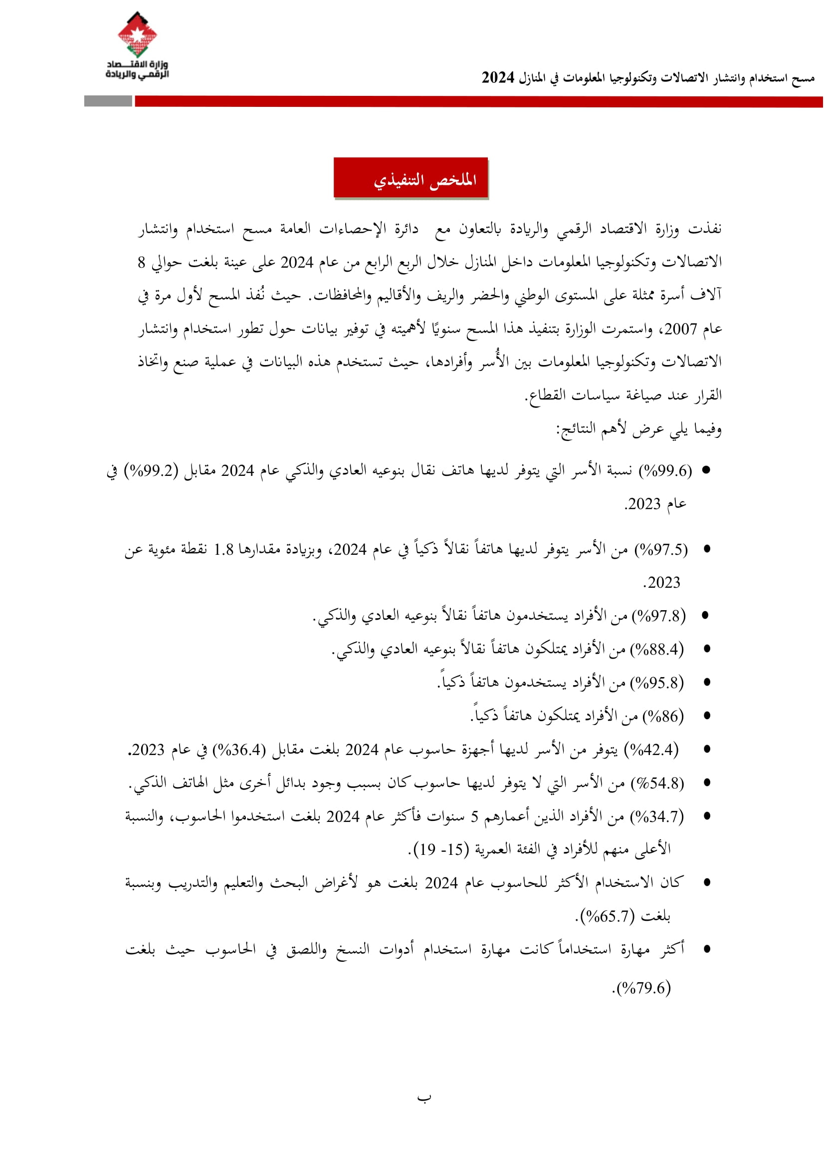 وتسهم النتائج في رسم السياسات والاستراتيجيات التي تعزز الانتشار الرقمي وتزويد المواطنين بالمهارات اللازمة لتحقيق التنمية المستدامة، إضافة إلى ذلك، تُعد هذه المؤشرات مدخلًا رئيسيًا للتقارير الدولية مثل تقارير الاتحاد الدولي للاتصالات، بما يُعزّز مكانة الأردن عالميًا ويعكس جهوده المستمرة في المجال الرقمي.