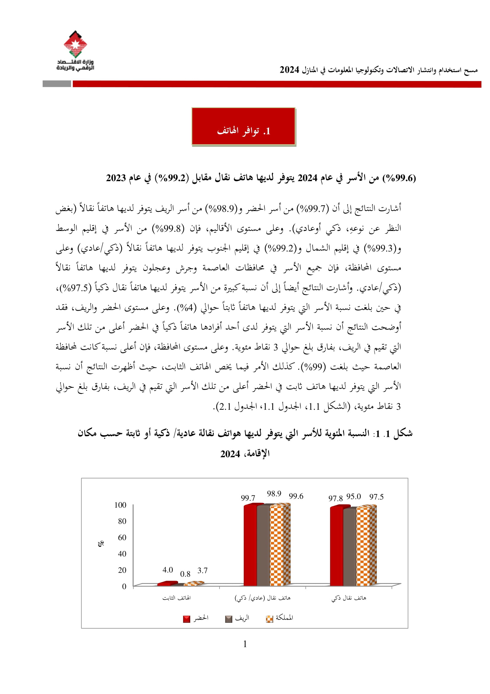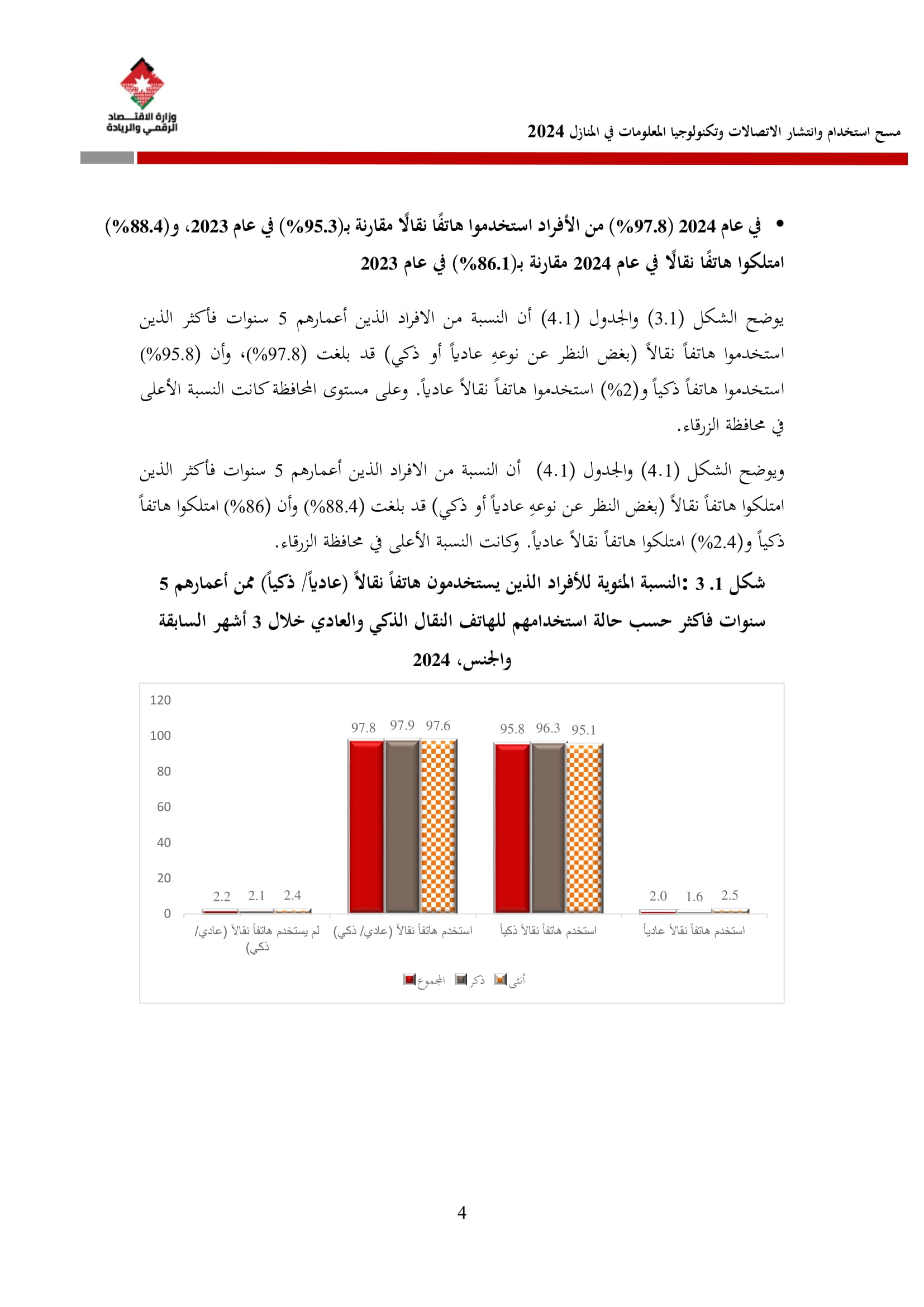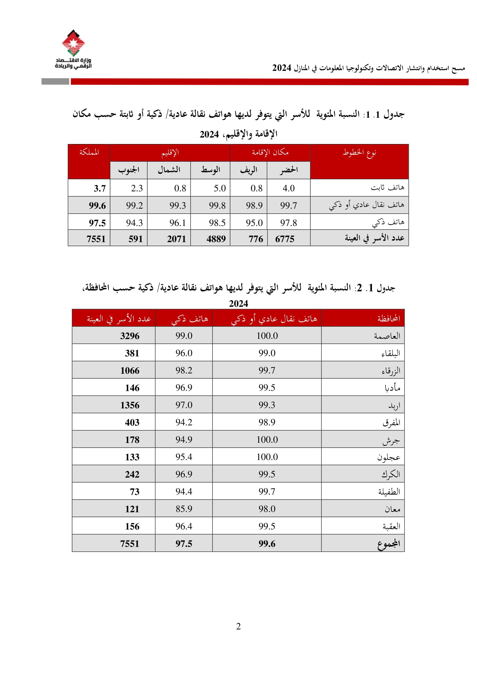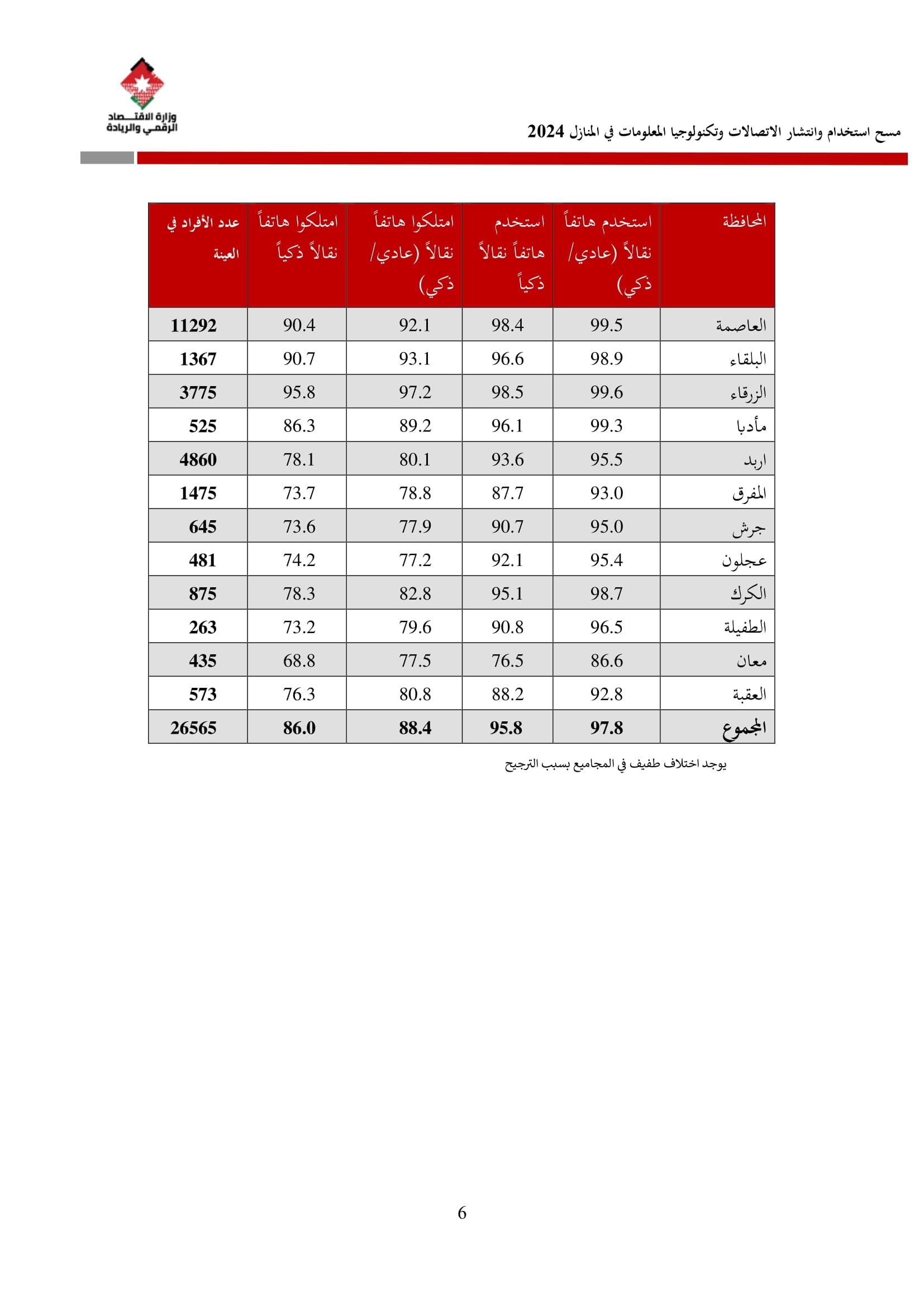 وكشف المسح عن أن نسبة الأسر التي تمتلك هاتفًا نقالًا ذكيًا بلغت 97.5% في عام 2024، مقارنة بـ 95.7% في عام 2023. وعلى مستوى المحافظات، فقد بلغت نسبة توفر الهاتف الذكي في عمّان ما نسبته 99%، والتي شكل أعلى نسبة بين المحافظات، كما بلغ متوسط الإنفاق الشهري للأسرة على الهاتف الثابت 15.2 دينارًا، وعلى الهاتف النقال 21.2 دينارًا، مقارنة بمتوسطات عام 2023 التي بلغت 17.1 دينارًا للهاتف الثابت و22.6 دينارًا للهاتف النقال.