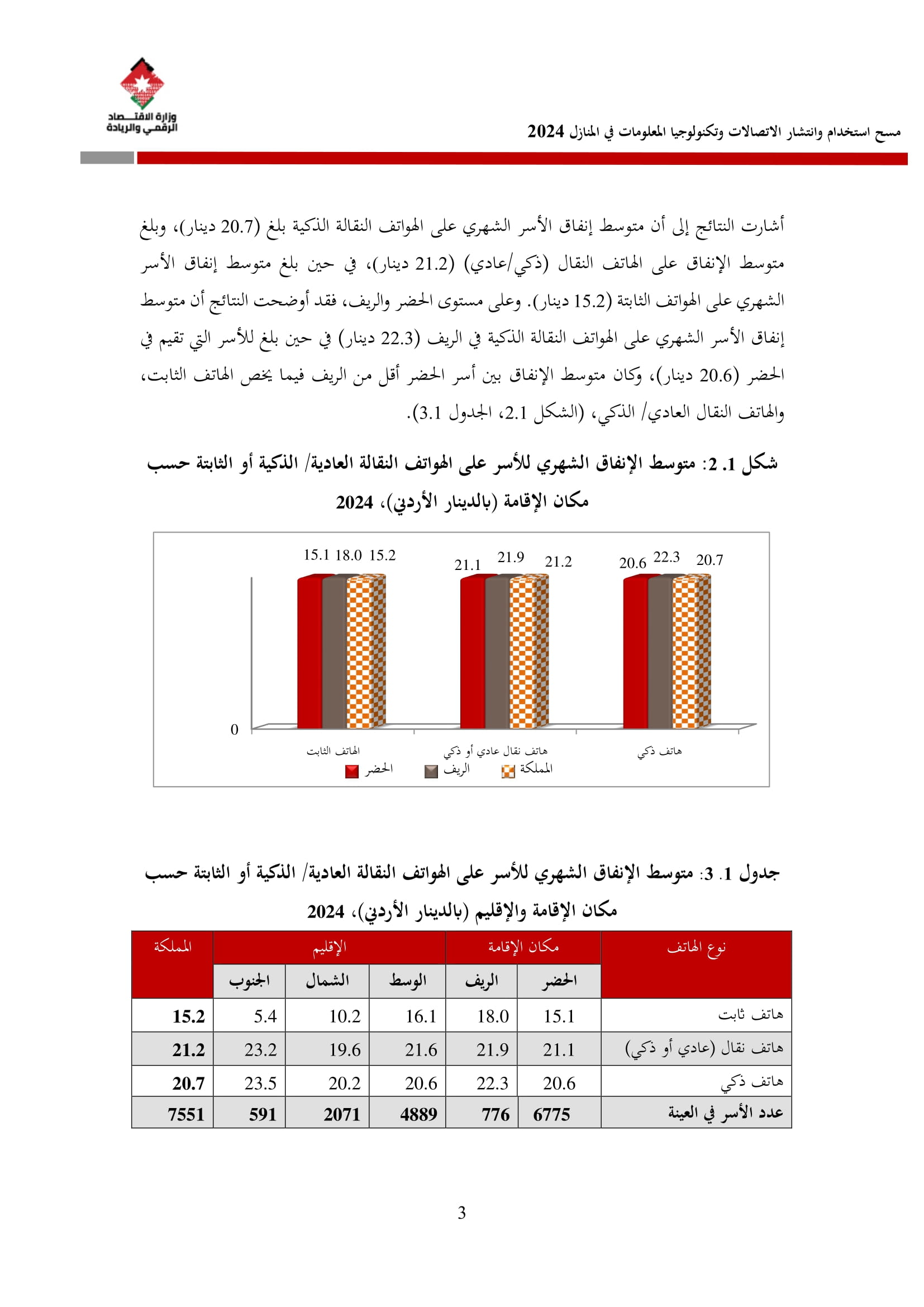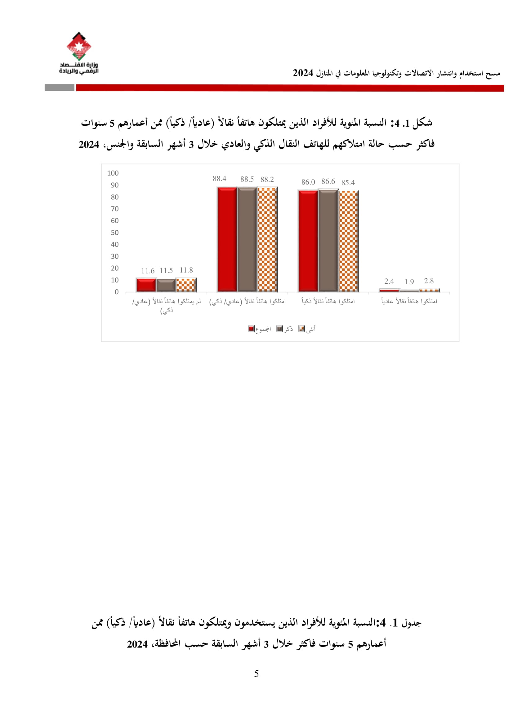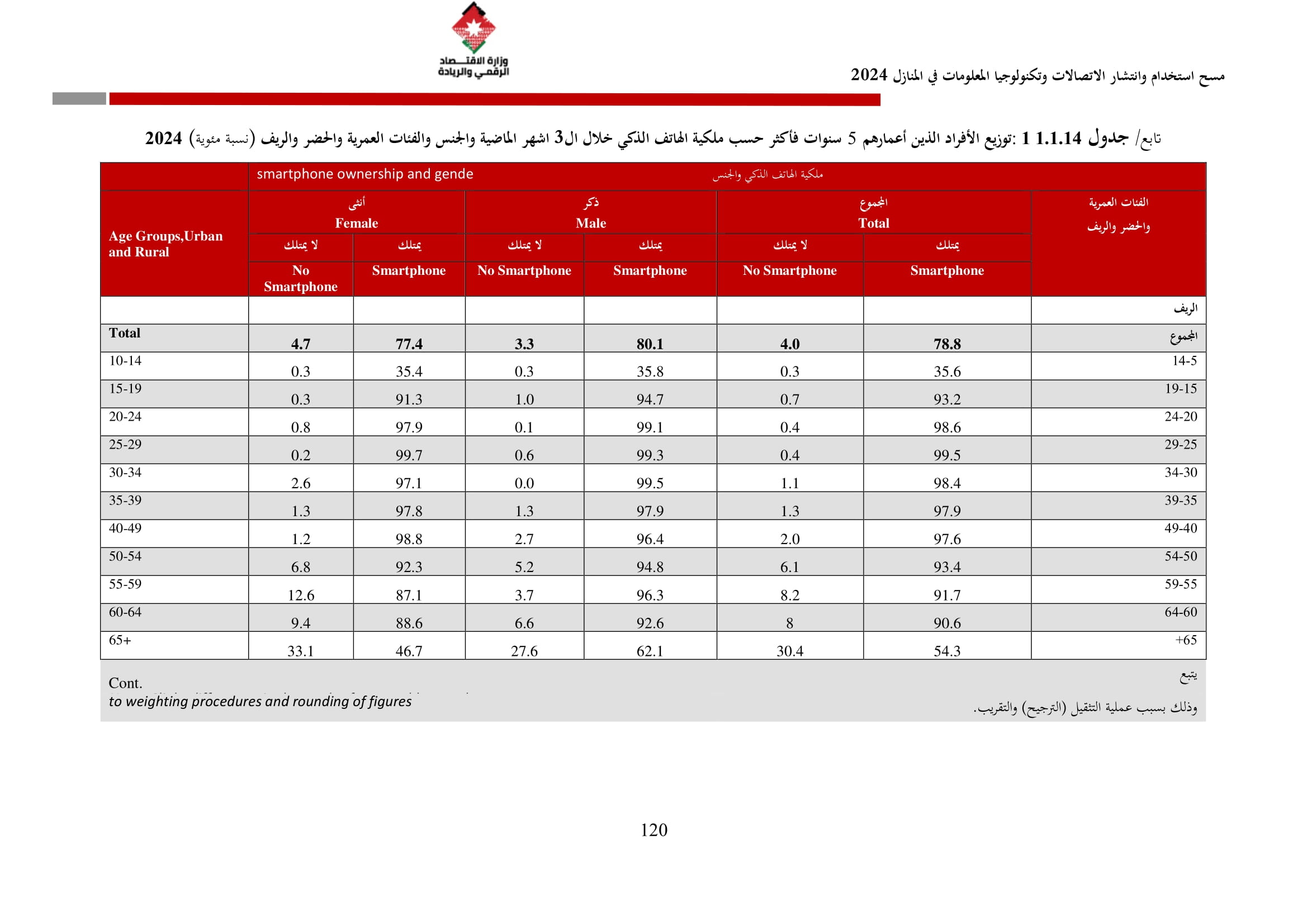 وكشف المسح عن أن نسبة الأسر التي تمتلك هاتفًا نقالًا ذكيًا بلغت 97.5% في عام 2024، مقارنة بـ 95.7% في عام 2023. وعلى مستوى المحافظات، فقد بلغت نسبة توفر الهاتف الذكي في عمّان ما نسبته 99%، والتي شكل أعلى نسبة بين المحافظات، كما بلغ متوسط الإنفاق الشهري للأسرة على الهاتف الثابت 15.2 دينارًا، وعلى الهاتف النقال 21.2 دينارًا، مقارنة بمتوسطات عام 2023 التي بلغت 17.1 دينارًا للهاتف الثابت و22.6 دينارًا للهاتف النقال.