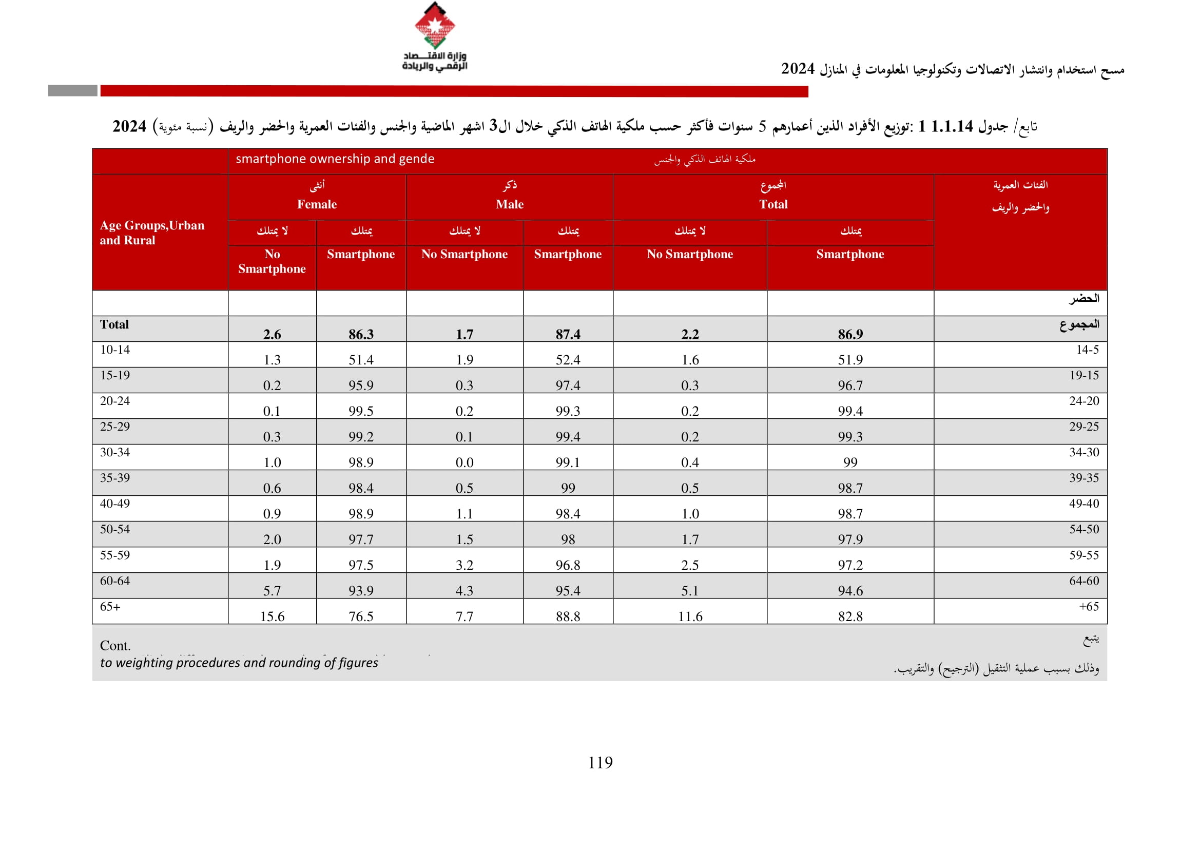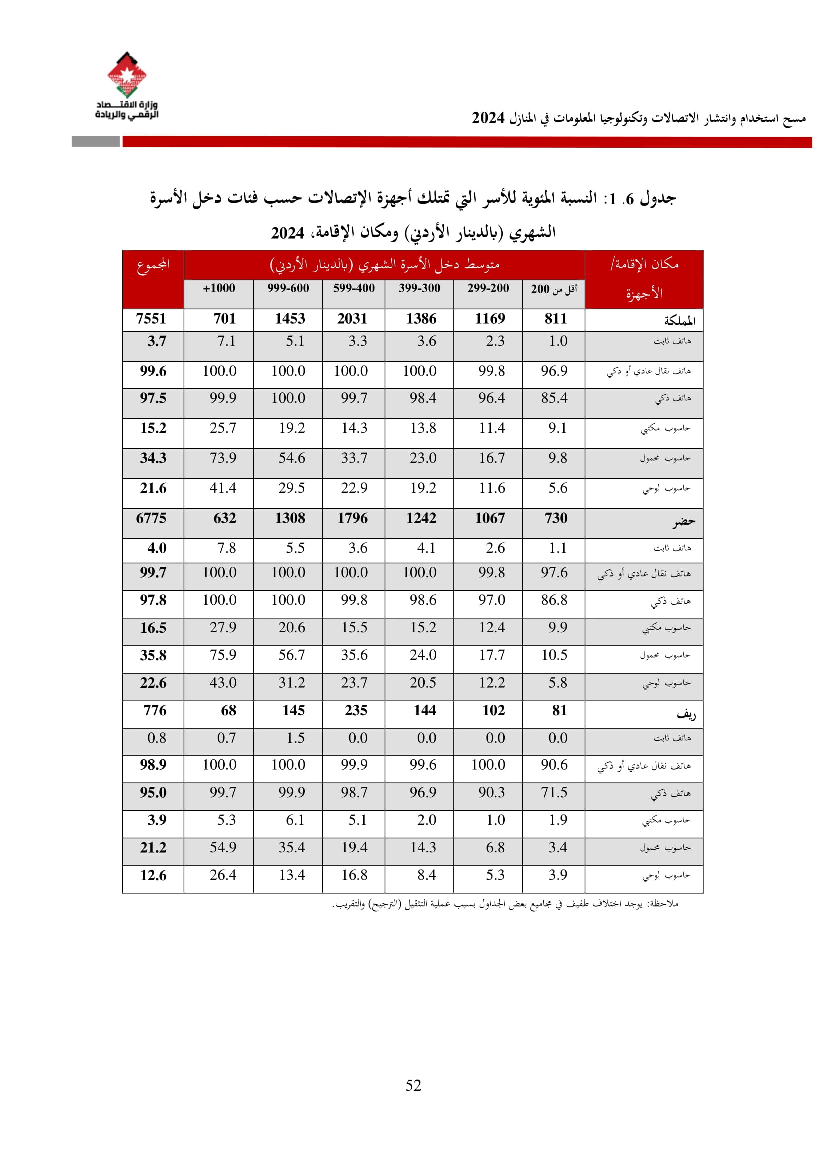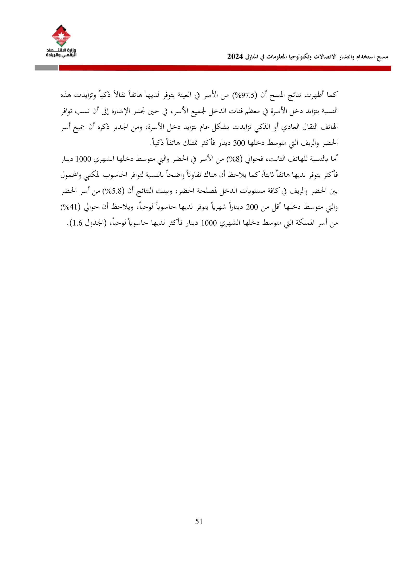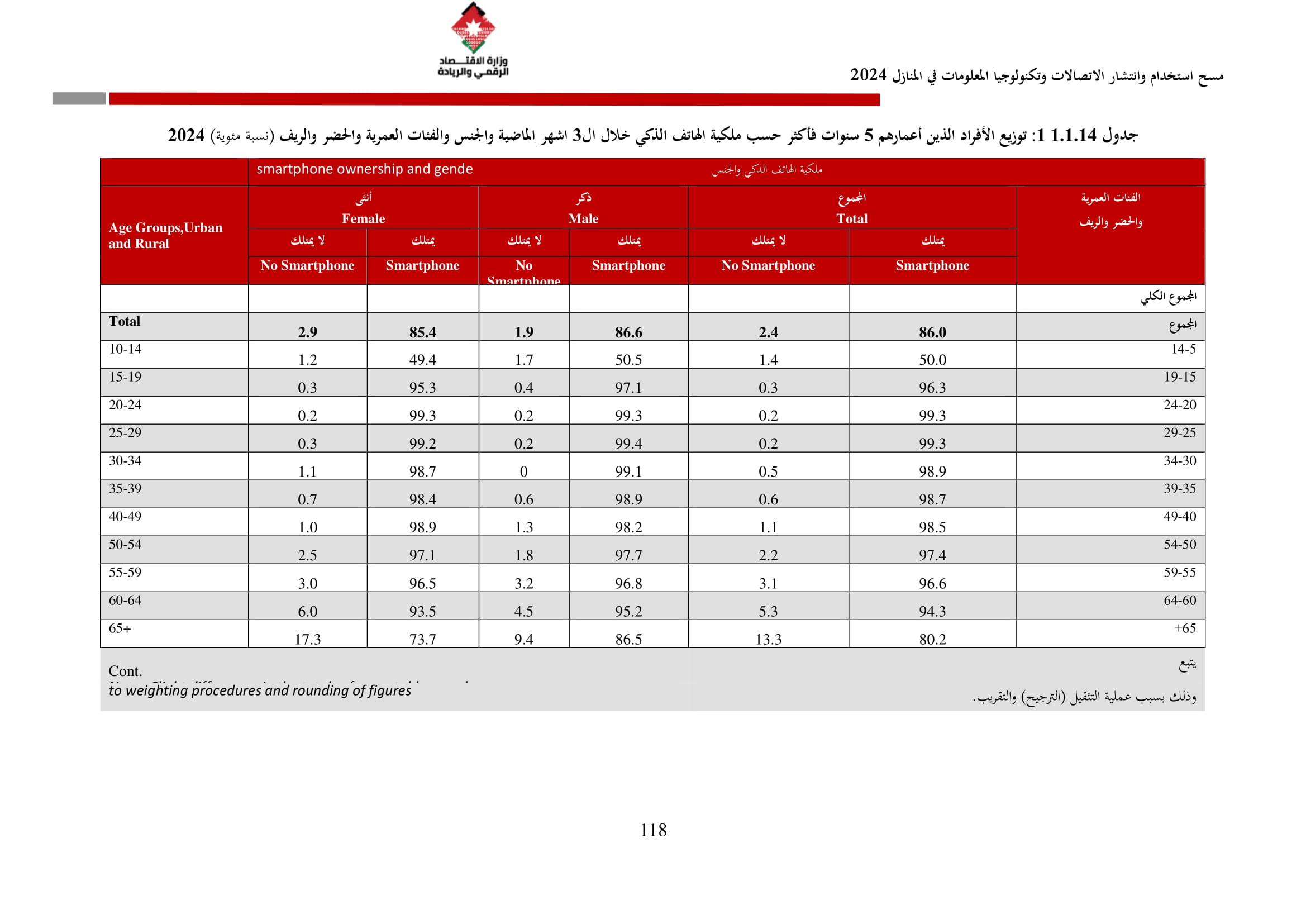 وكشف المسح عن أن نسبة الأسر التي تمتلك هاتفًا نقالًا ذكيًا بلغت 97.5% في عام 2024، مقارنة بـ 95.7% في عام 2023. وعلى مستوى المحافظات، فقد بلغت نسبة توفر الهاتف الذكي في عمّان ما نسبته 99%، والتي شكل أعلى نسبة بين المحافظات، كما بلغ متوسط الإنفاق الشهري للأسرة على الهاتف الثابت 15.2 دينارًا، وعلى الهاتف النقال 21.2 دينارًا، مقارنة بمتوسطات عام 2023 التي بلغت 17.1 دينارًا للهاتف الثابت و22.6 دينارًا للهاتف النقال.