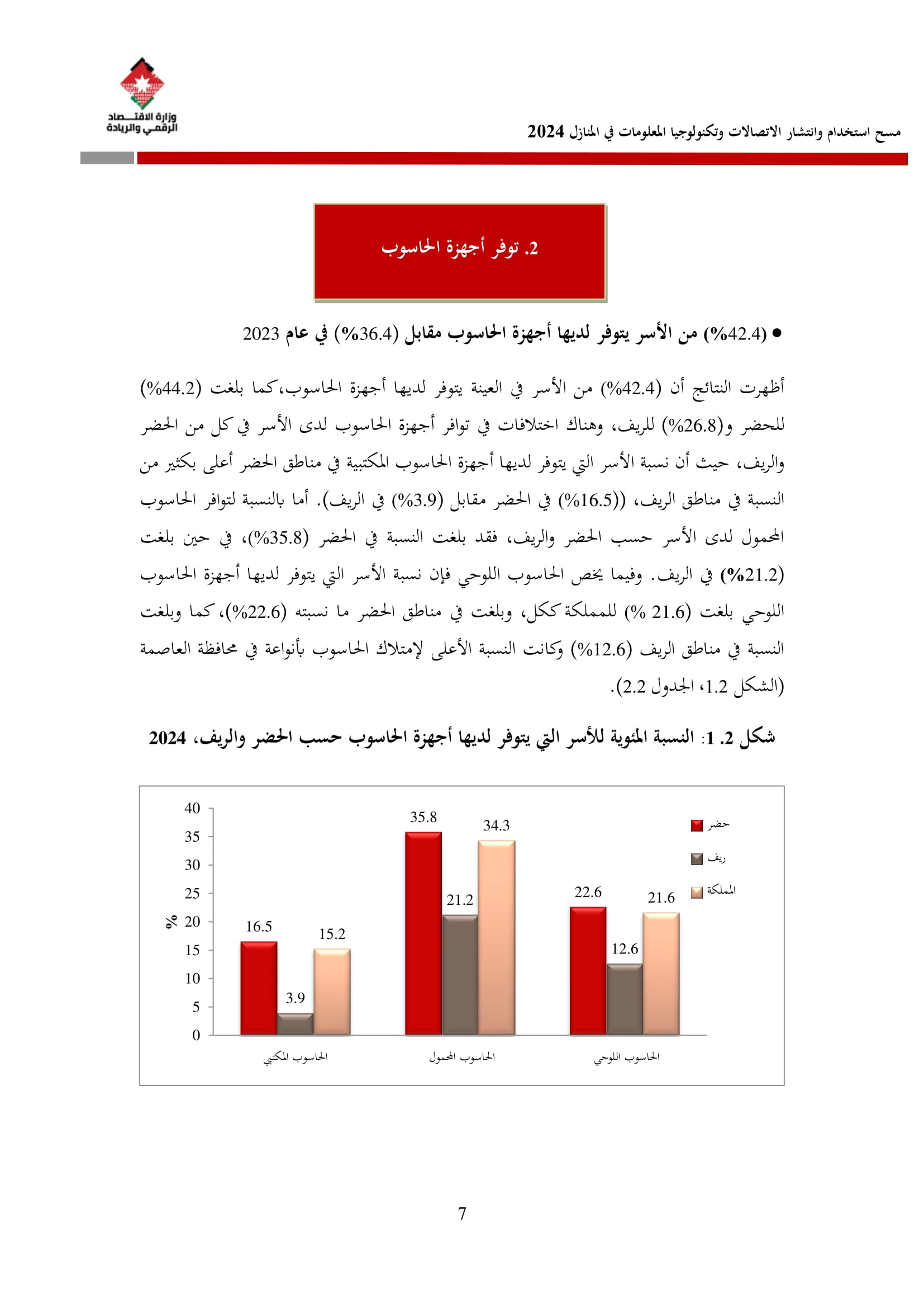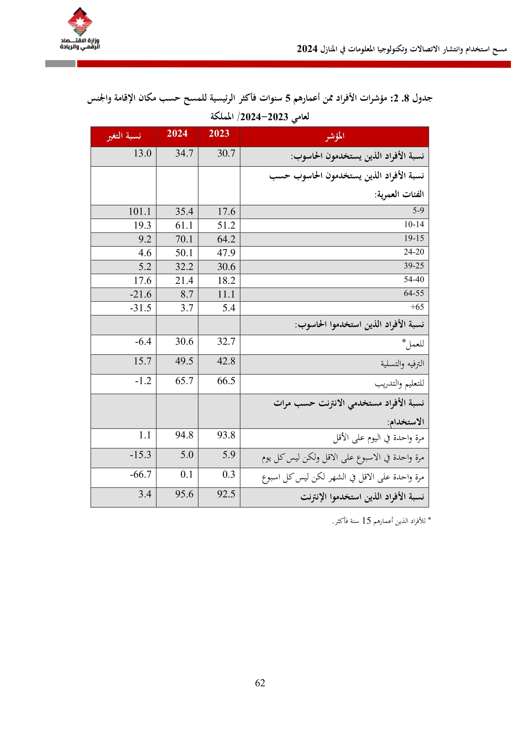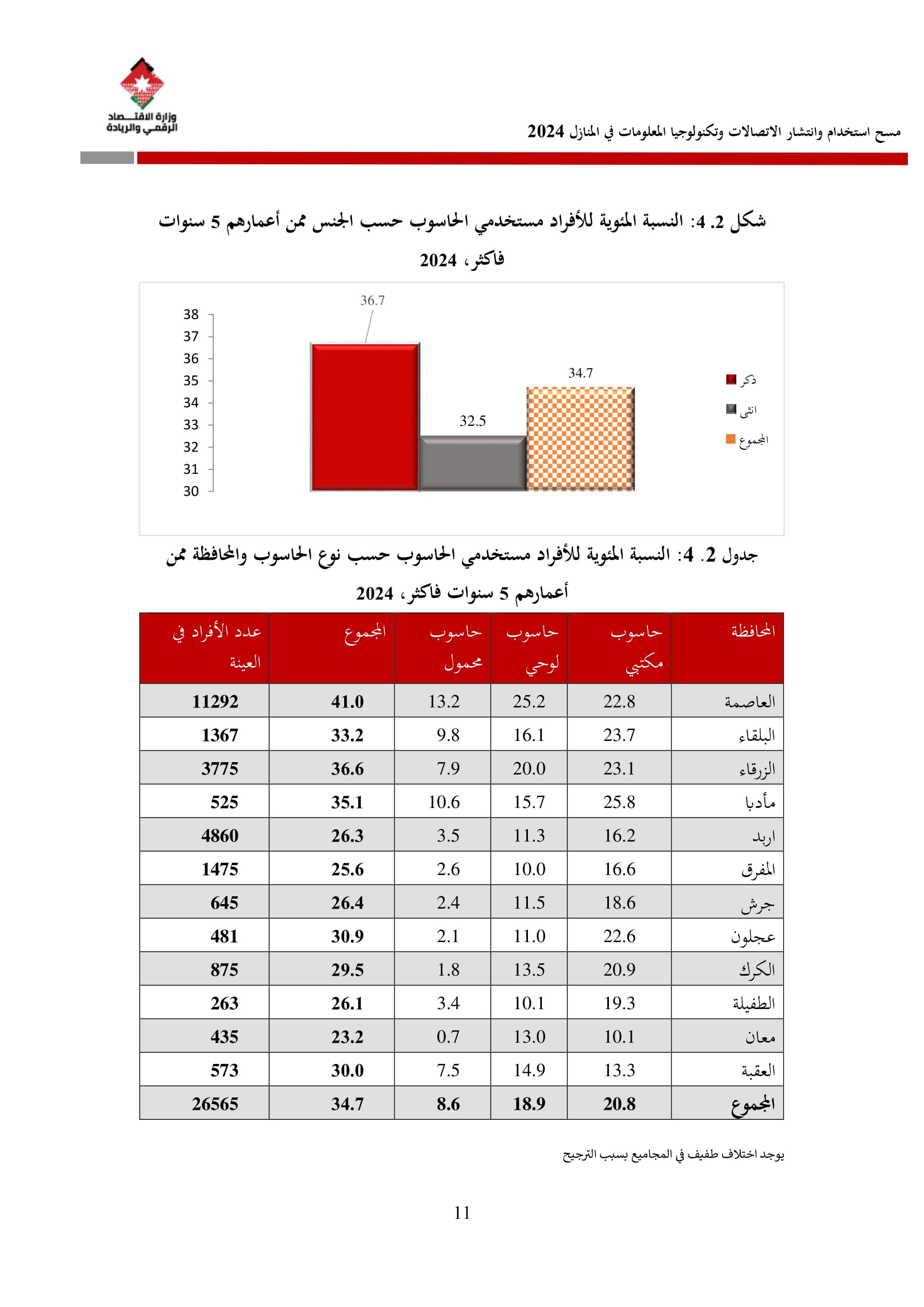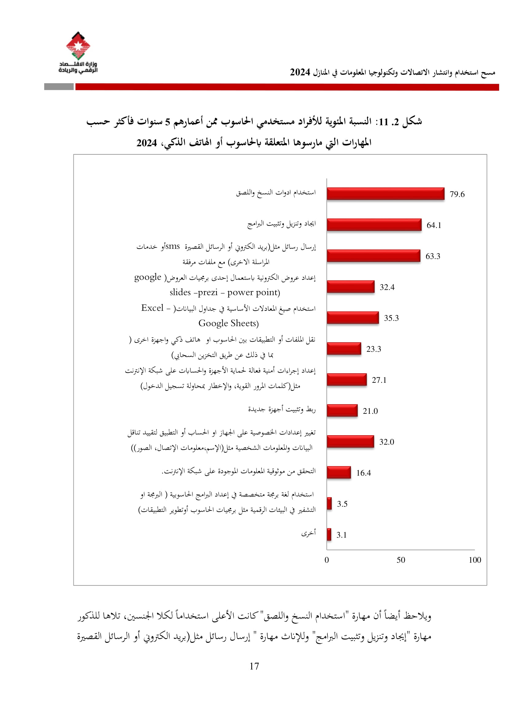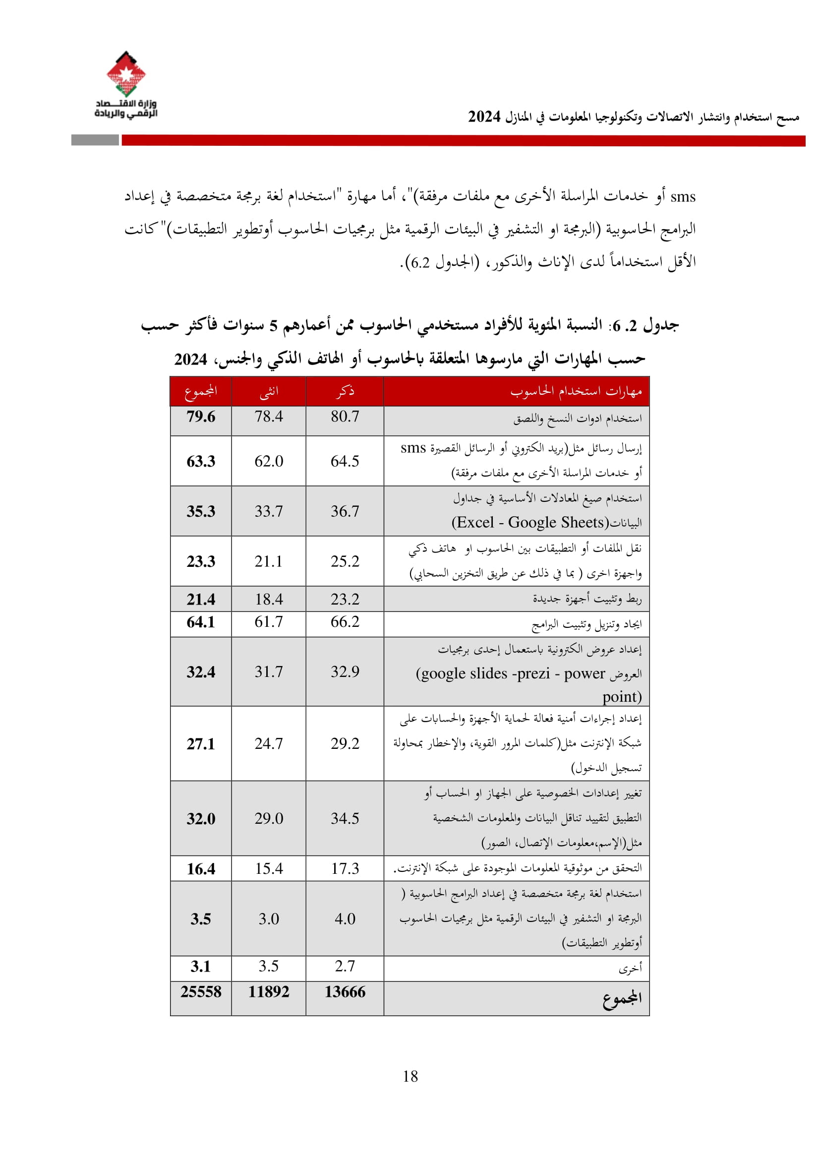 وأظهرت نتائج المسح زيادة في نسبة الأسر التي تمتلك حاسوبًا لتصل إلى 42.4% مقارنة بـ 36.4% في عام 2023، وتوزعت بين الحواسيب المحمولة (34.3%)، والأجهزة اللوحية (21.6%)، والحواسيب المكتبية (15.2%). أما على مستوى استخدام الحواسيب، فقد بلغت نسبة الأفراد المستخدمين للحواسيب 34.7%، وكانت أبرز المهارات الرقمية الشائعة هي النسخ واللصق (79.6%)، وتنزيل البرامج (64.1%)، وإعداد العروض الإلكترونية (324%).