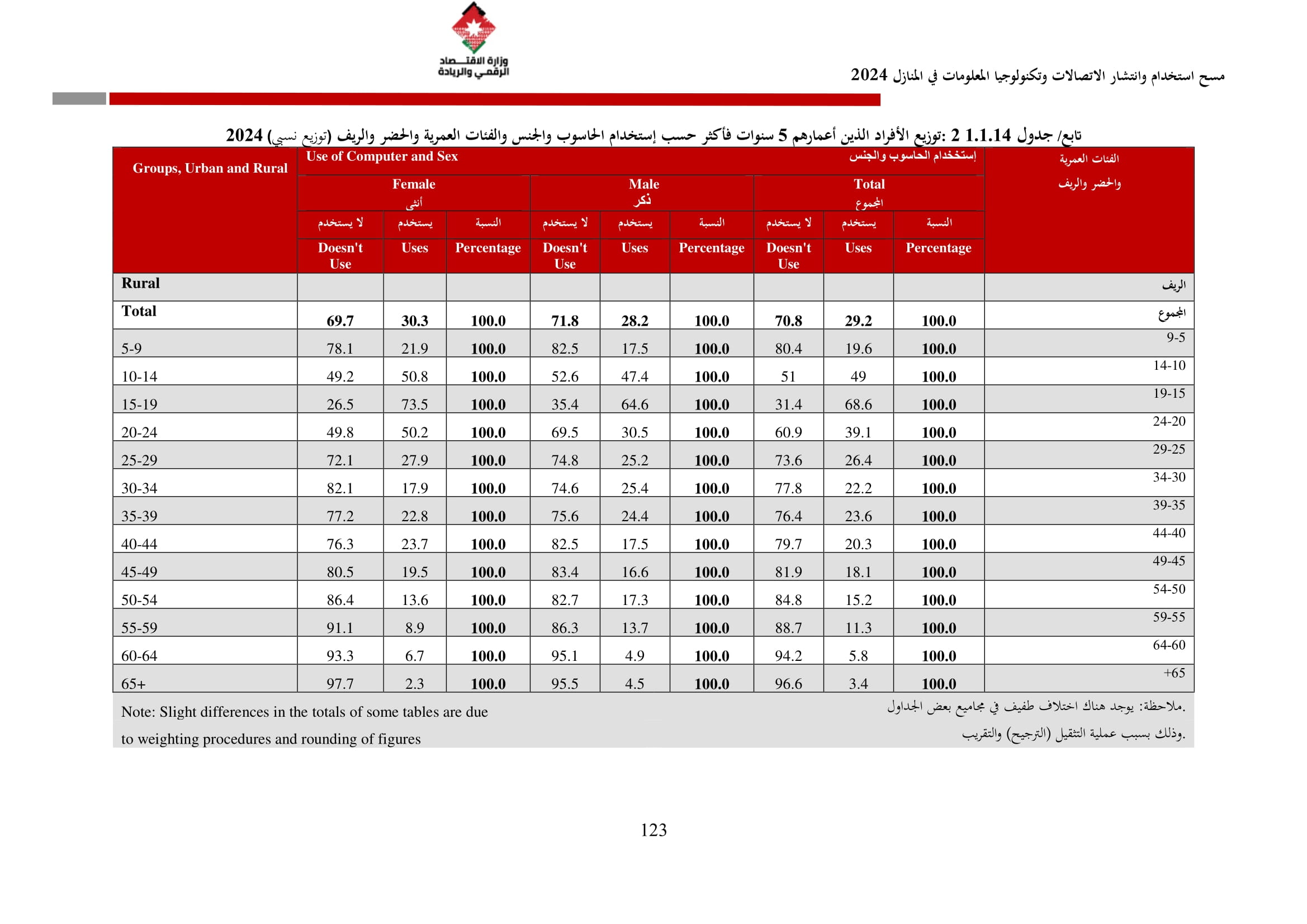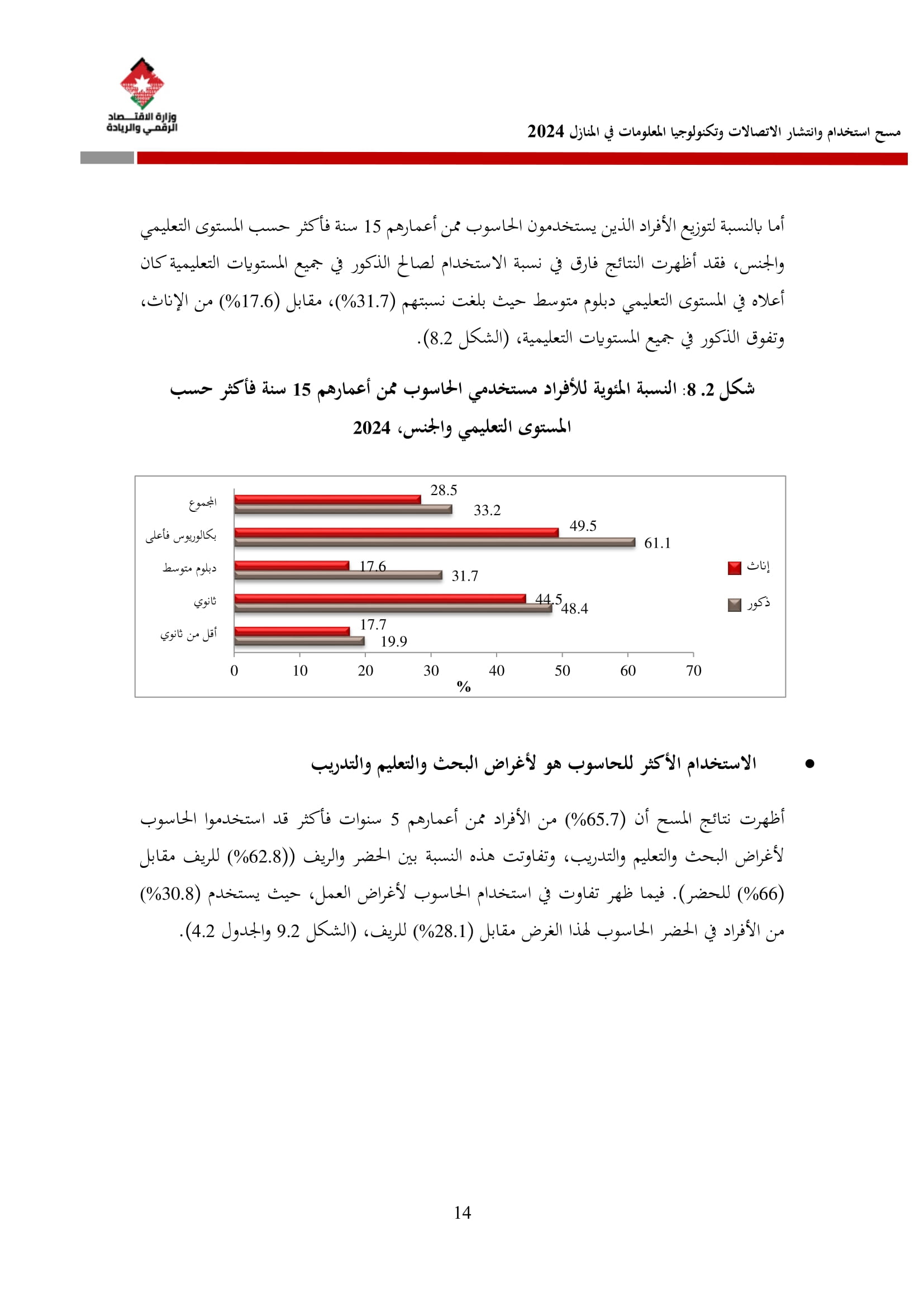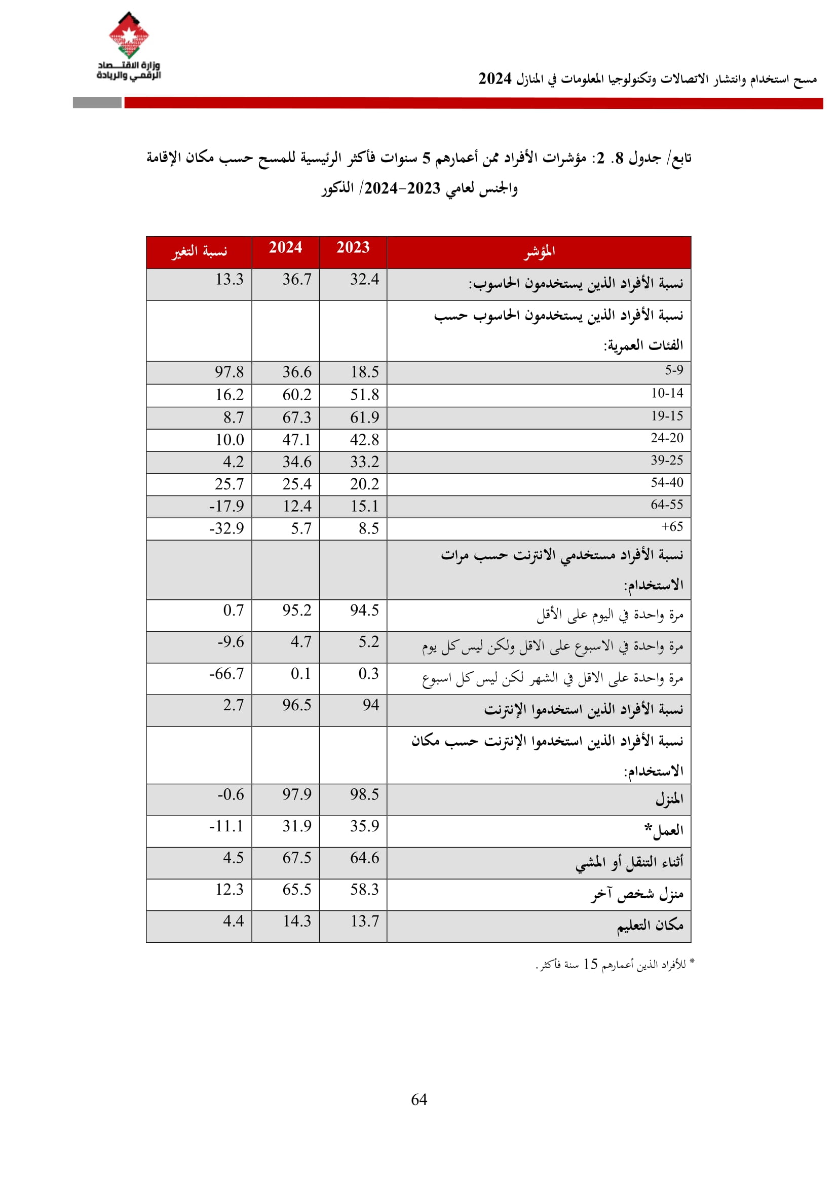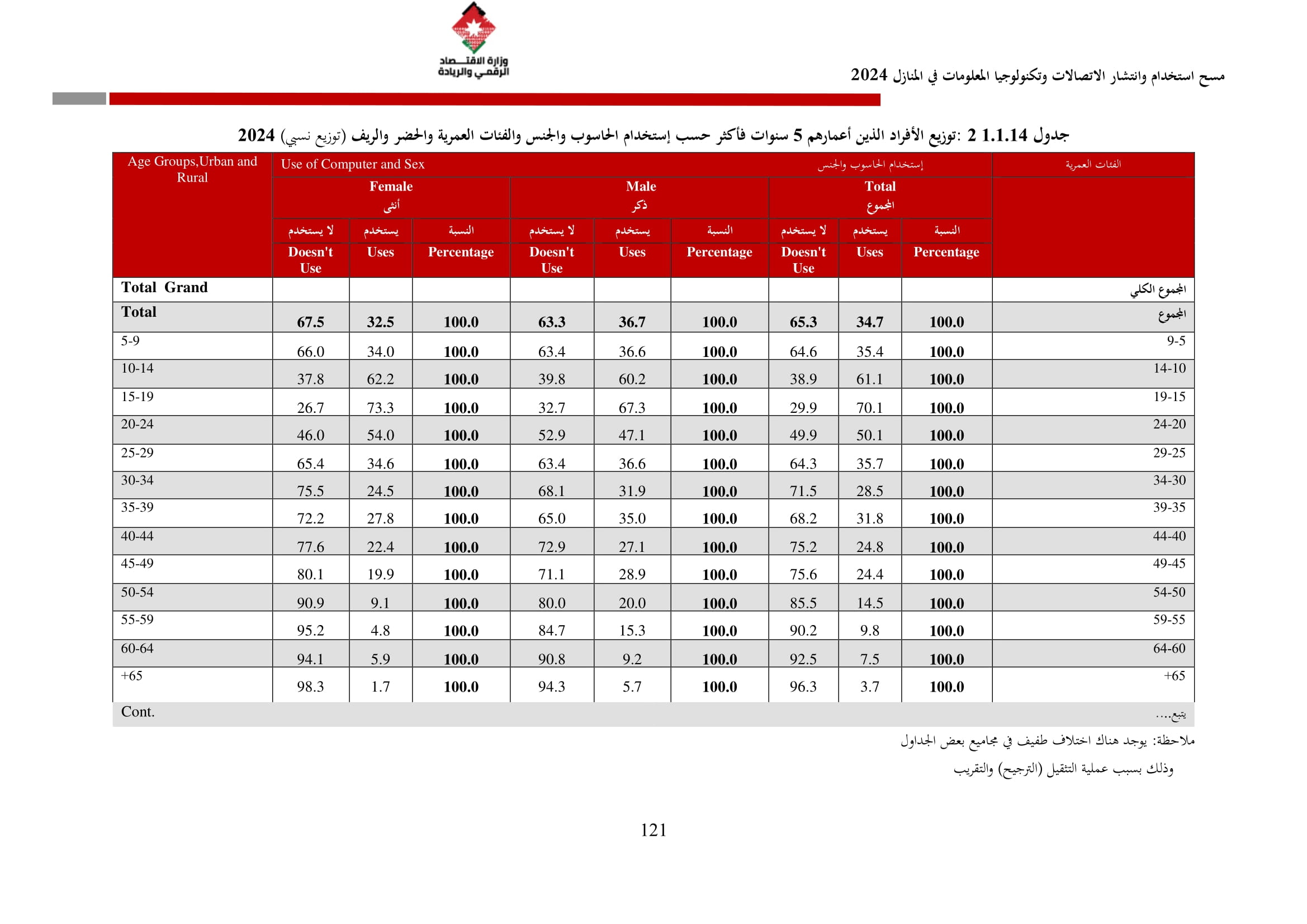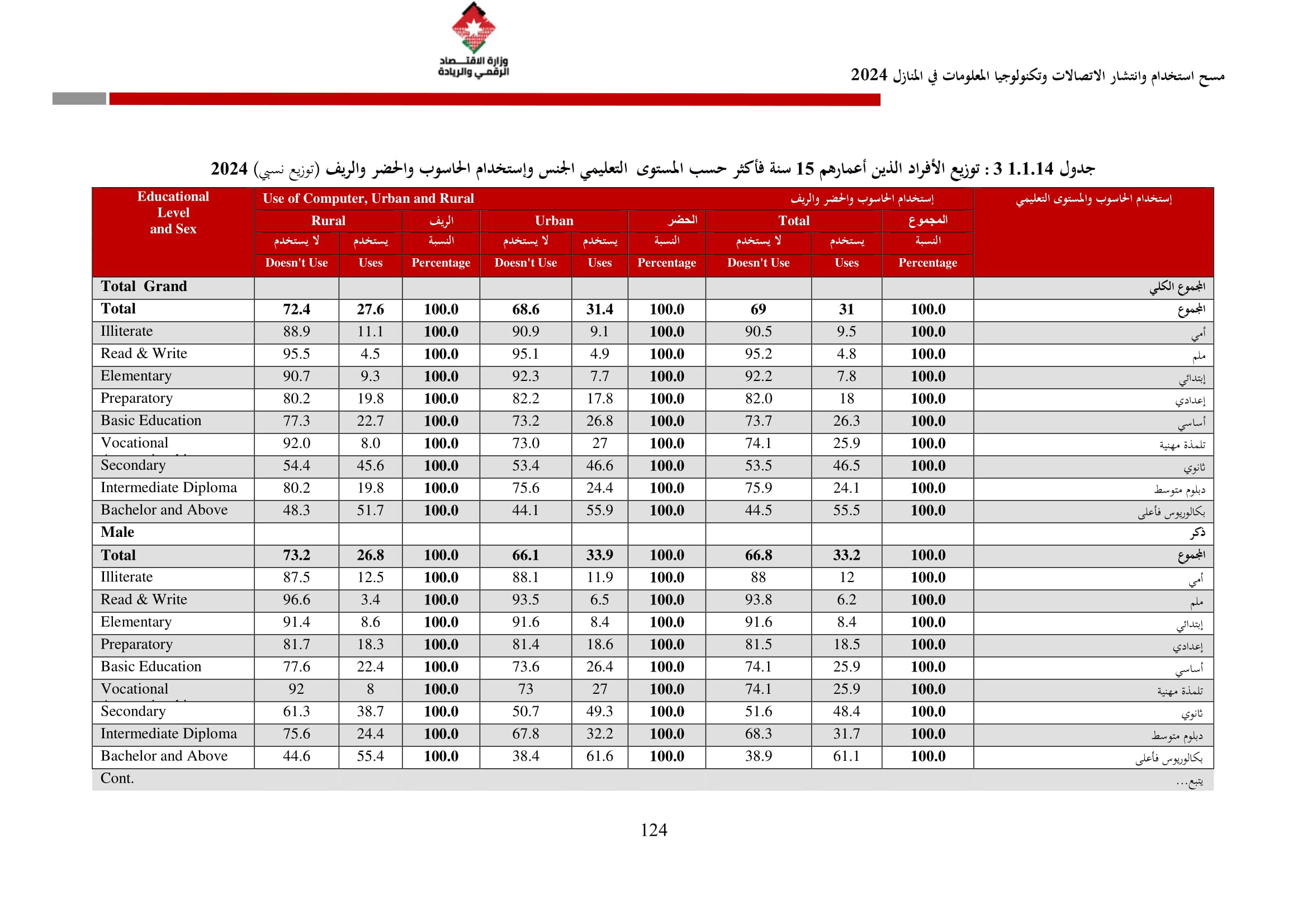 وأظهرت نتائج المسح زيادة في نسبة الأسر التي تمتلك حاسوبًا لتصل إلى 42.4% مقارنة بـ 36.4% في عام 2023، وتوزعت بين الحواسيب المحمولة (34.3%)، والأجهزة اللوحية (21.6%)، والحواسيب المكتبية (15.2%). أما على مستوى استخدام الحواسيب، فقد بلغت نسبة الأفراد المستخدمين للحواسيب 34.7%، وكانت أبرز المهارات الرقمية الشائعة هي النسخ واللصق (79.6%)، وتنزيل البرامج (64.1%)، وإعداد العروض الإلكترونية (324%).