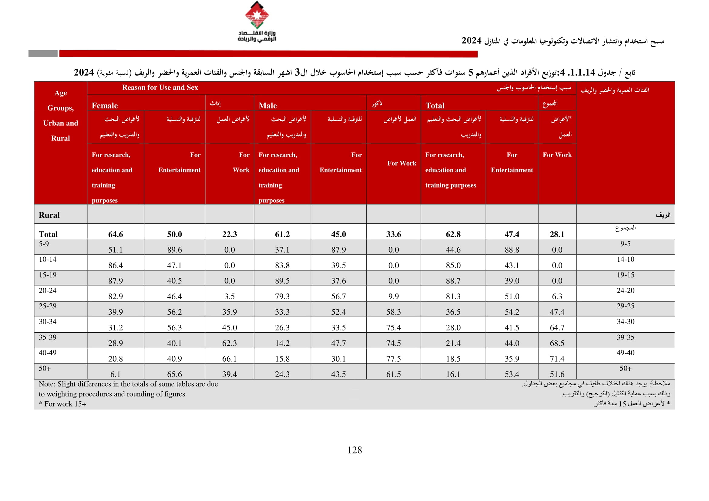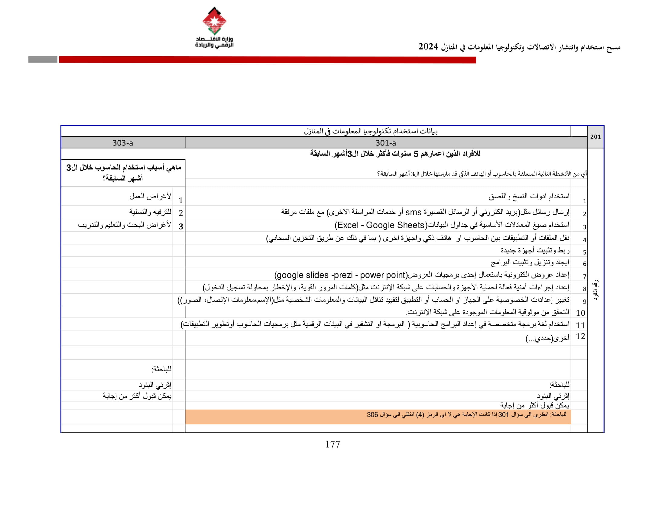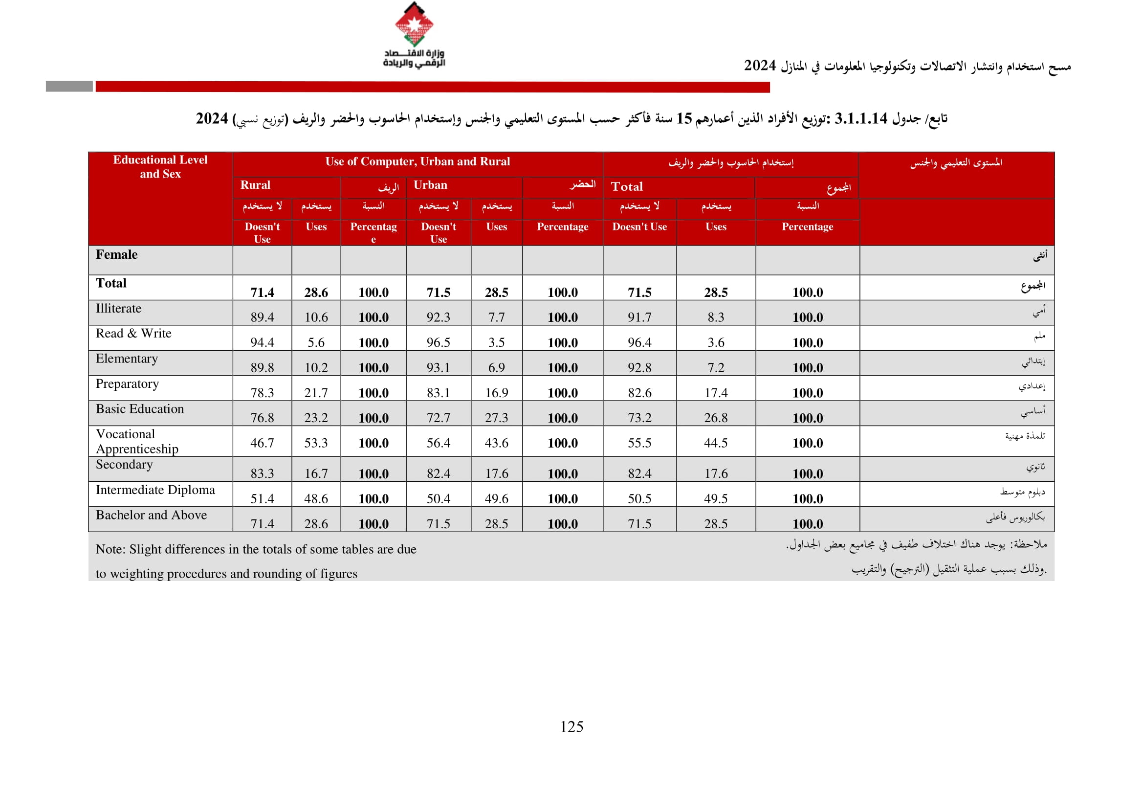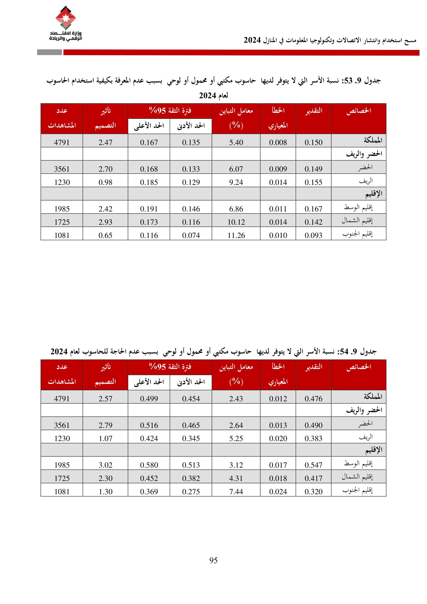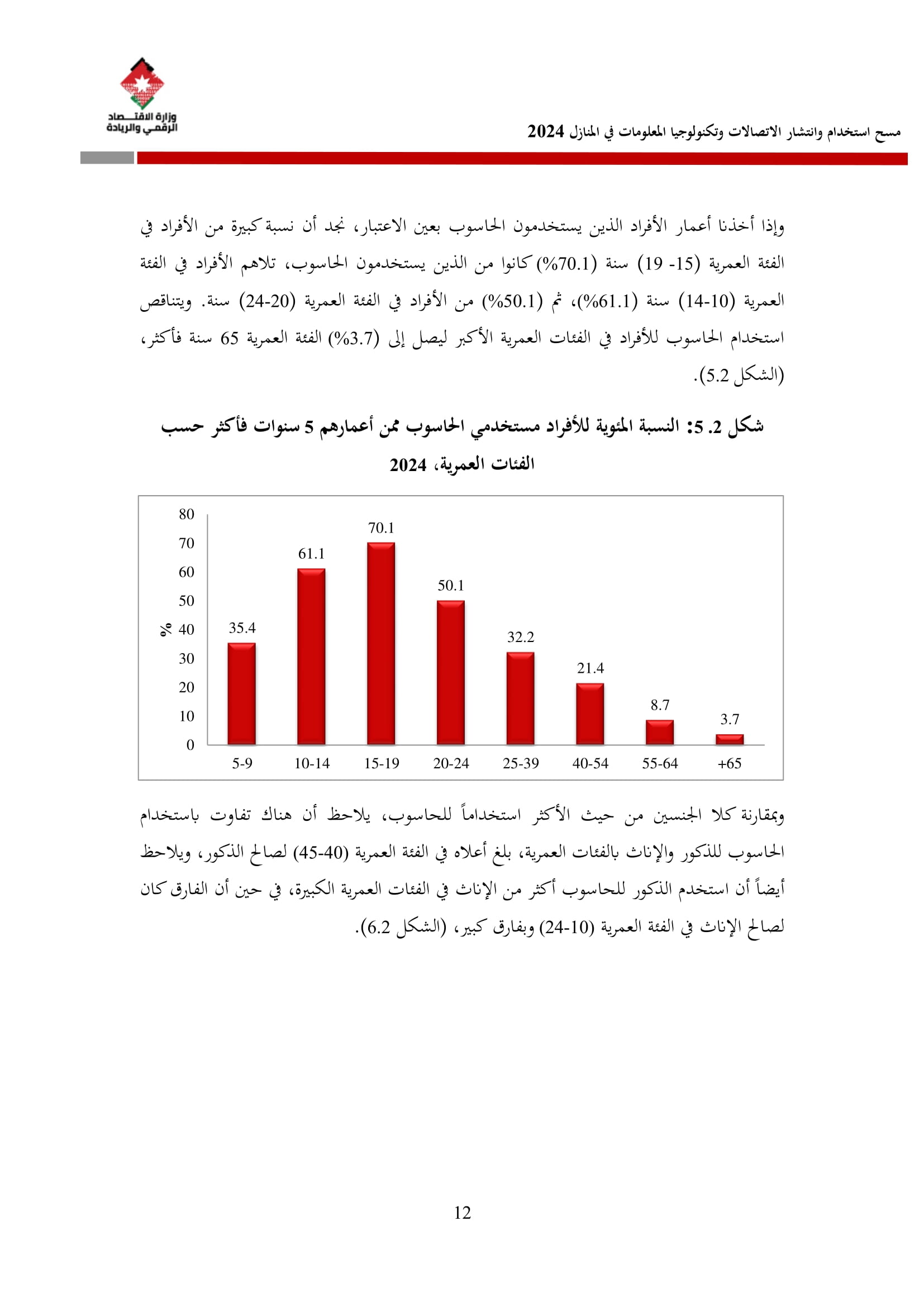 وأظهرت نتائج المسح زيادة في نسبة الأسر التي تمتلك حاسوبًا لتصل إلى 42.4% مقارنة بـ 36.4% في عام 2023، وتوزعت بين الحواسيب المحمولة (34.3%)، والأجهزة اللوحية (21.6%)، والحواسيب المكتبية (15.2%). أما على مستوى استخدام الحواسيب، فقد بلغت نسبة الأفراد المستخدمين للحواسيب 34.7%، وكانت أبرز المهارات الرقمية الشائعة هي النسخ واللصق (79.6%)، وتنزيل البرامج (64.1%)، وإعداد العروض الإلكترونية (324%).