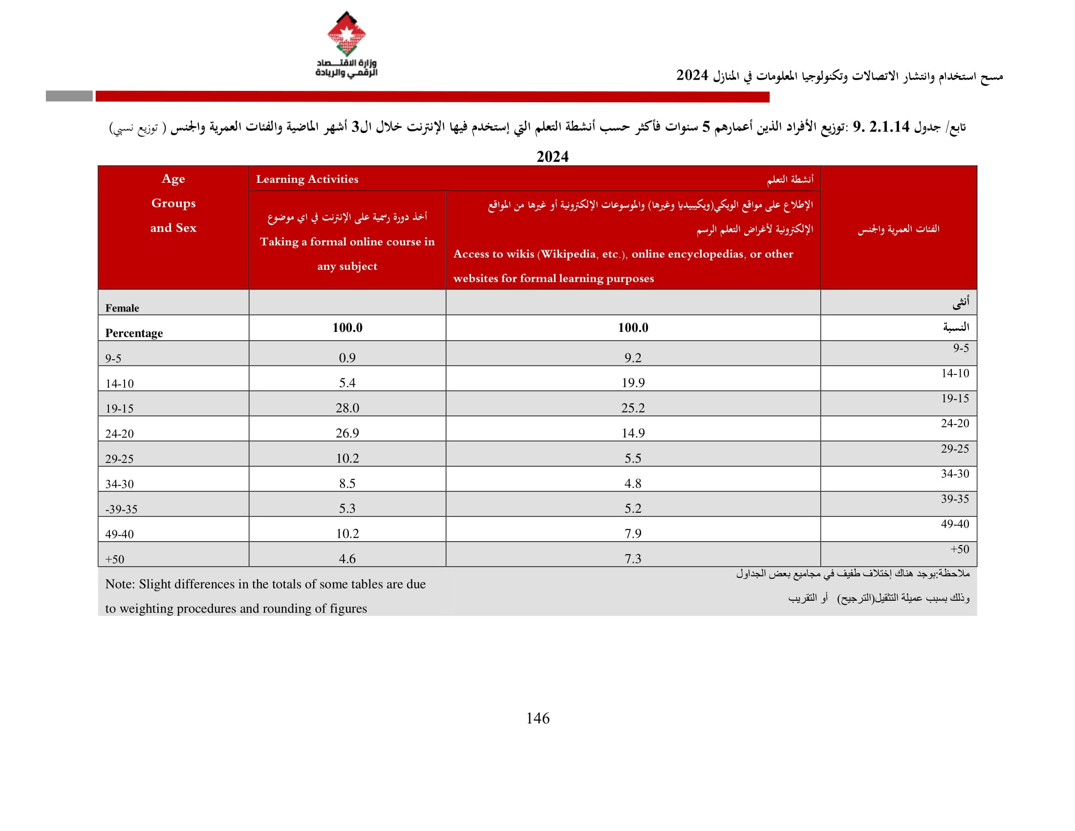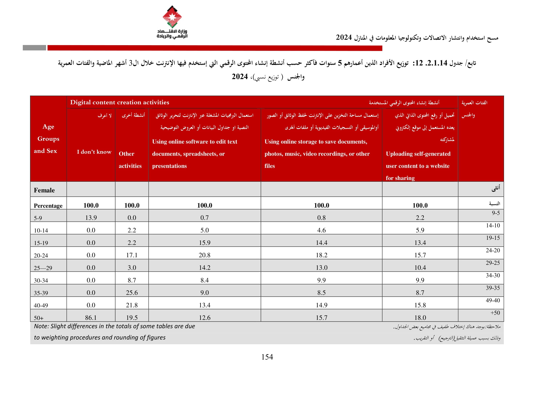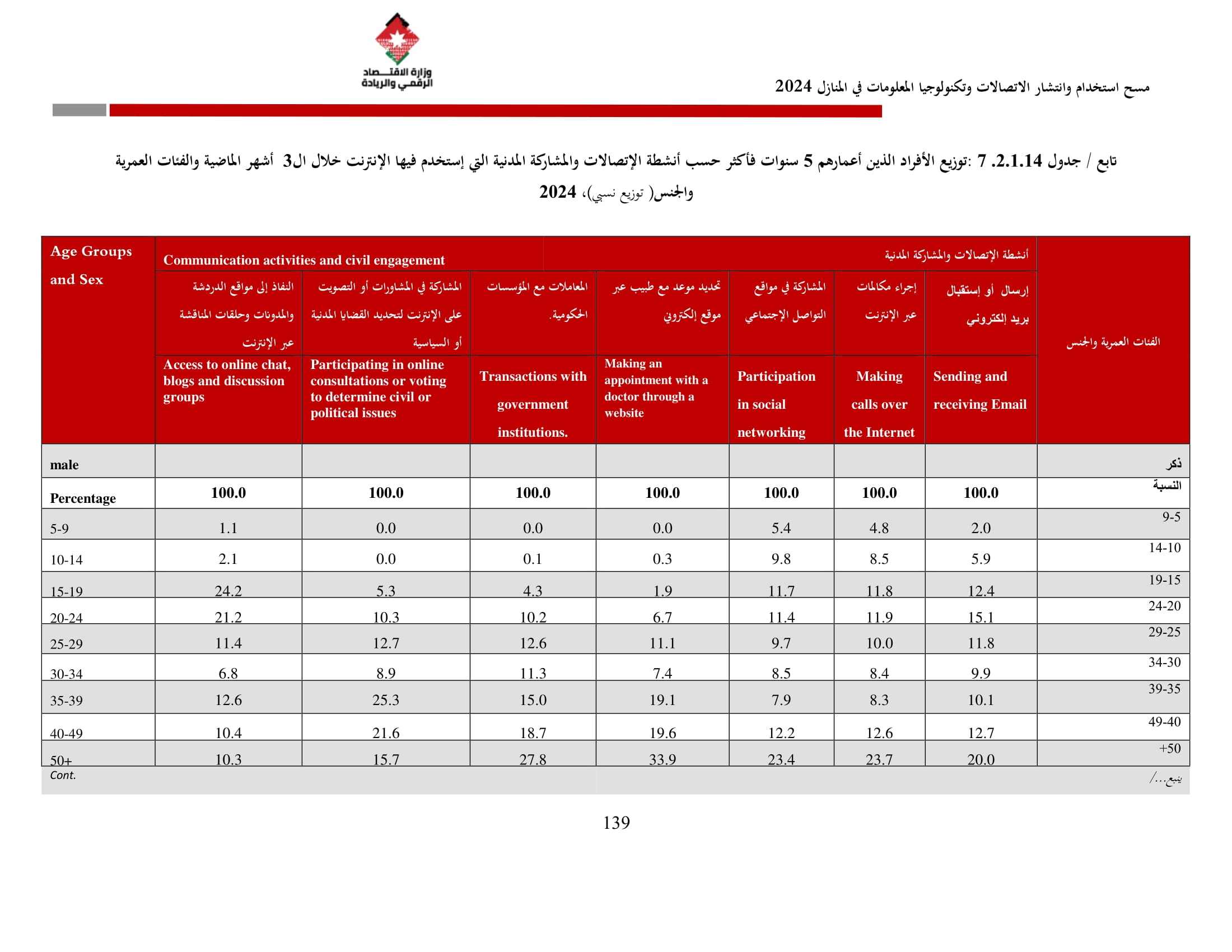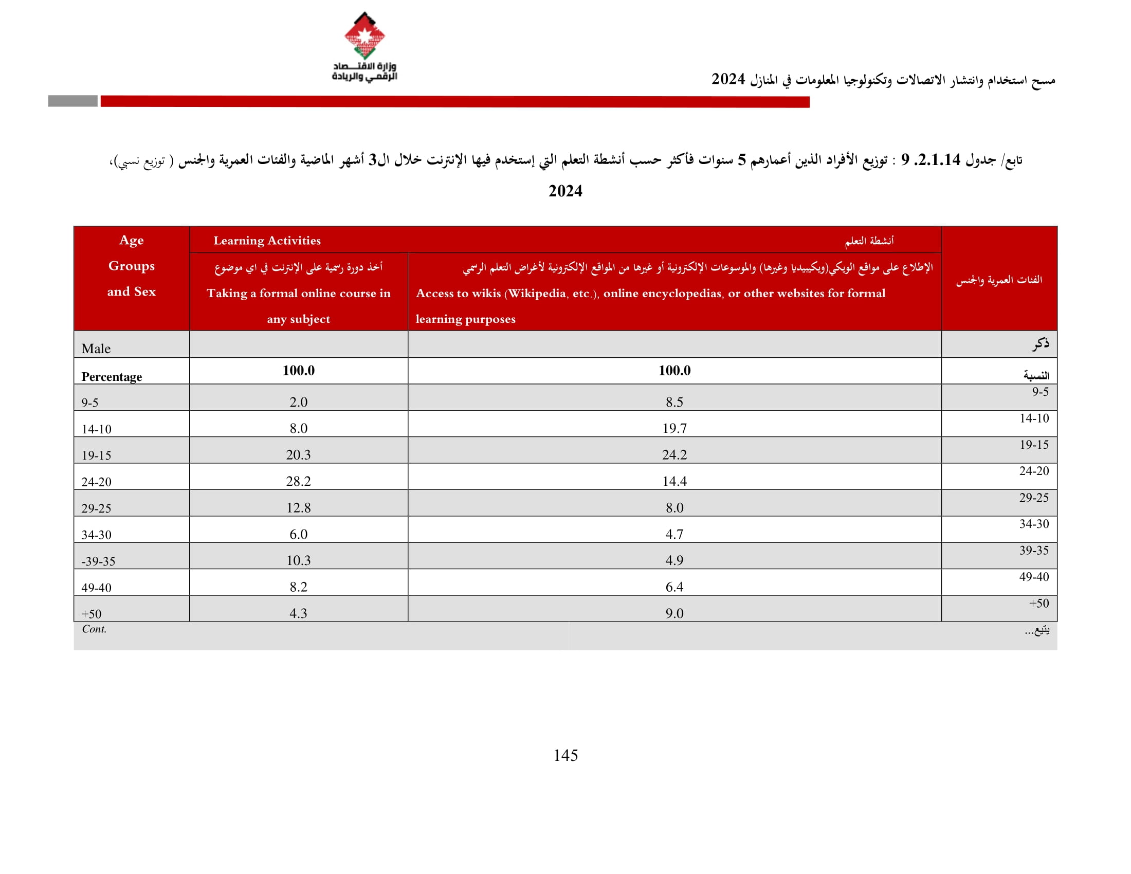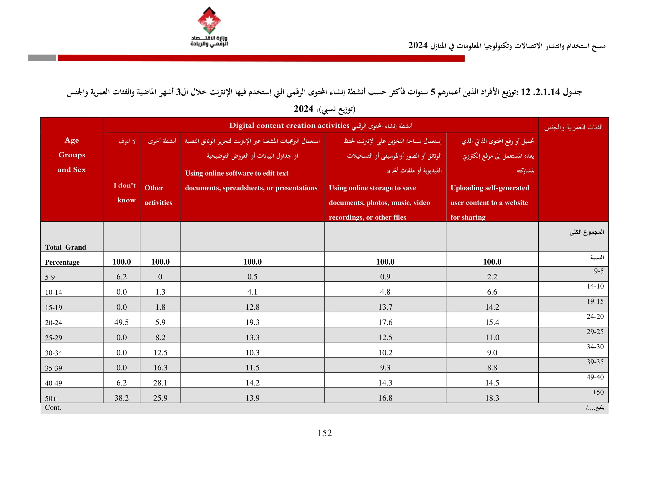 وأظهرت نتائج المسح زيادة في نسبة الأسر التي تمتلك حاسوبًا لتصل إلى 42.4% مقارنة بـ 36.4% في عام 2023، وتوزعت بين الحواسيب المحمولة (34.3%)، والأجهزة اللوحية (21.6%)، والحواسيب المكتبية (15.2%). أما على مستوى استخدام الحواسيب، فقد بلغت نسبة الأفراد المستخدمين للحواسيب 34.7%، وكانت أبرز المهارات الرقمية الشائعة هي النسخ واللصق (79.6%)، وتنزيل البرامج (64.1%)، وإعداد العروض الإلكترونية (324%).