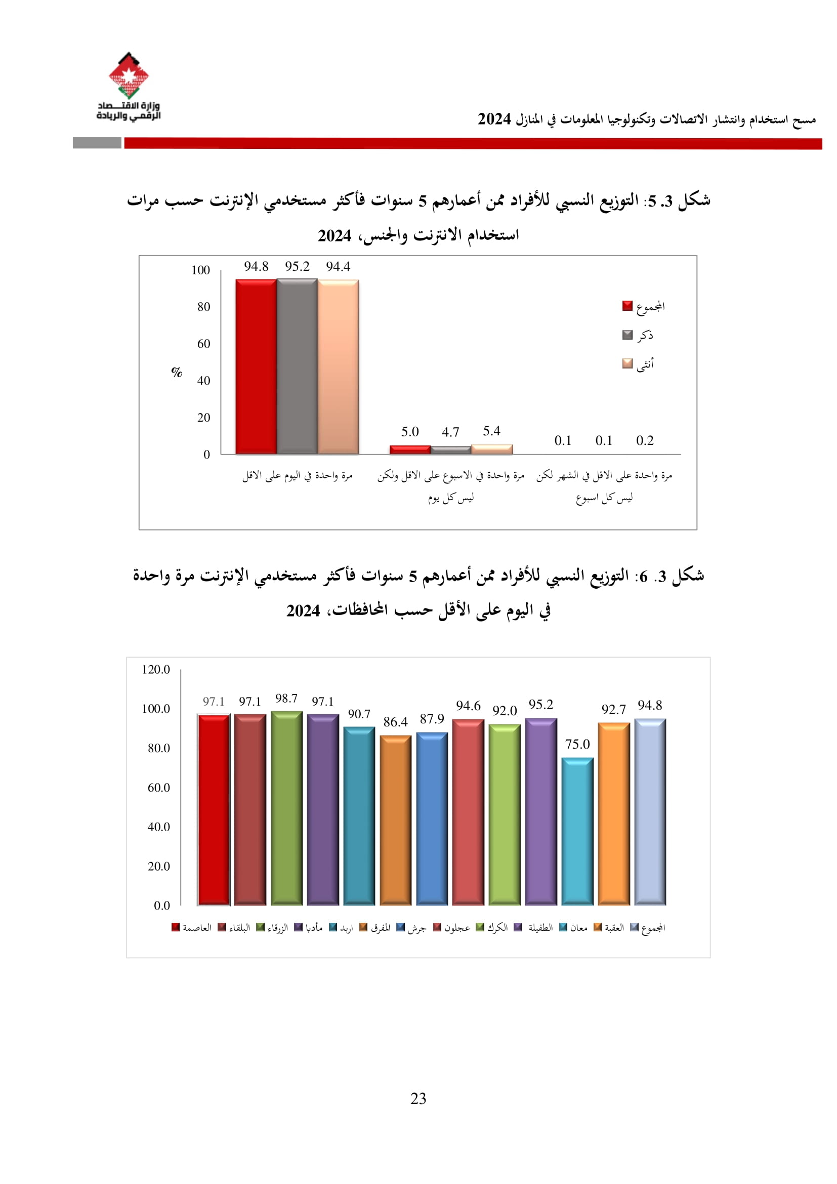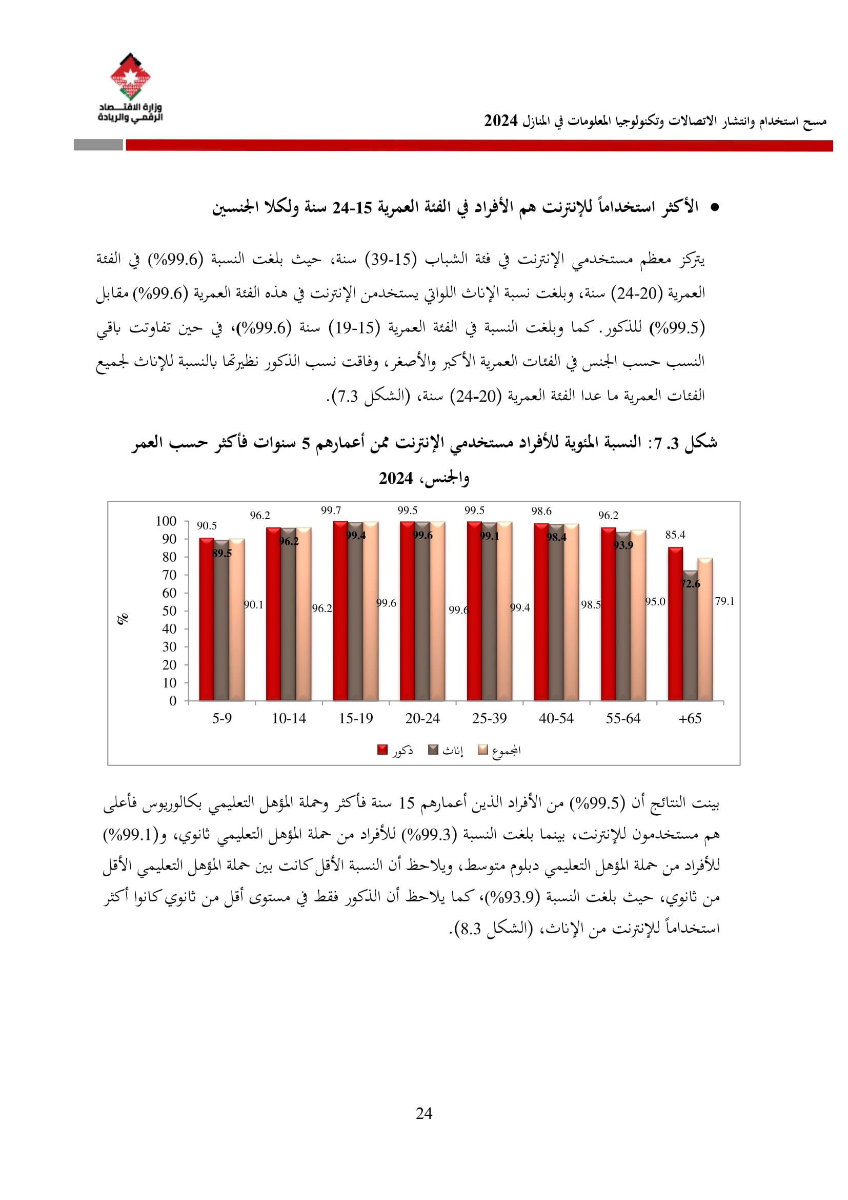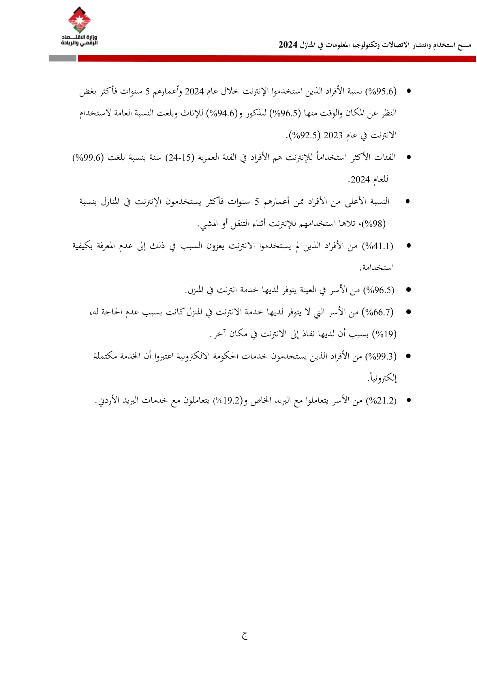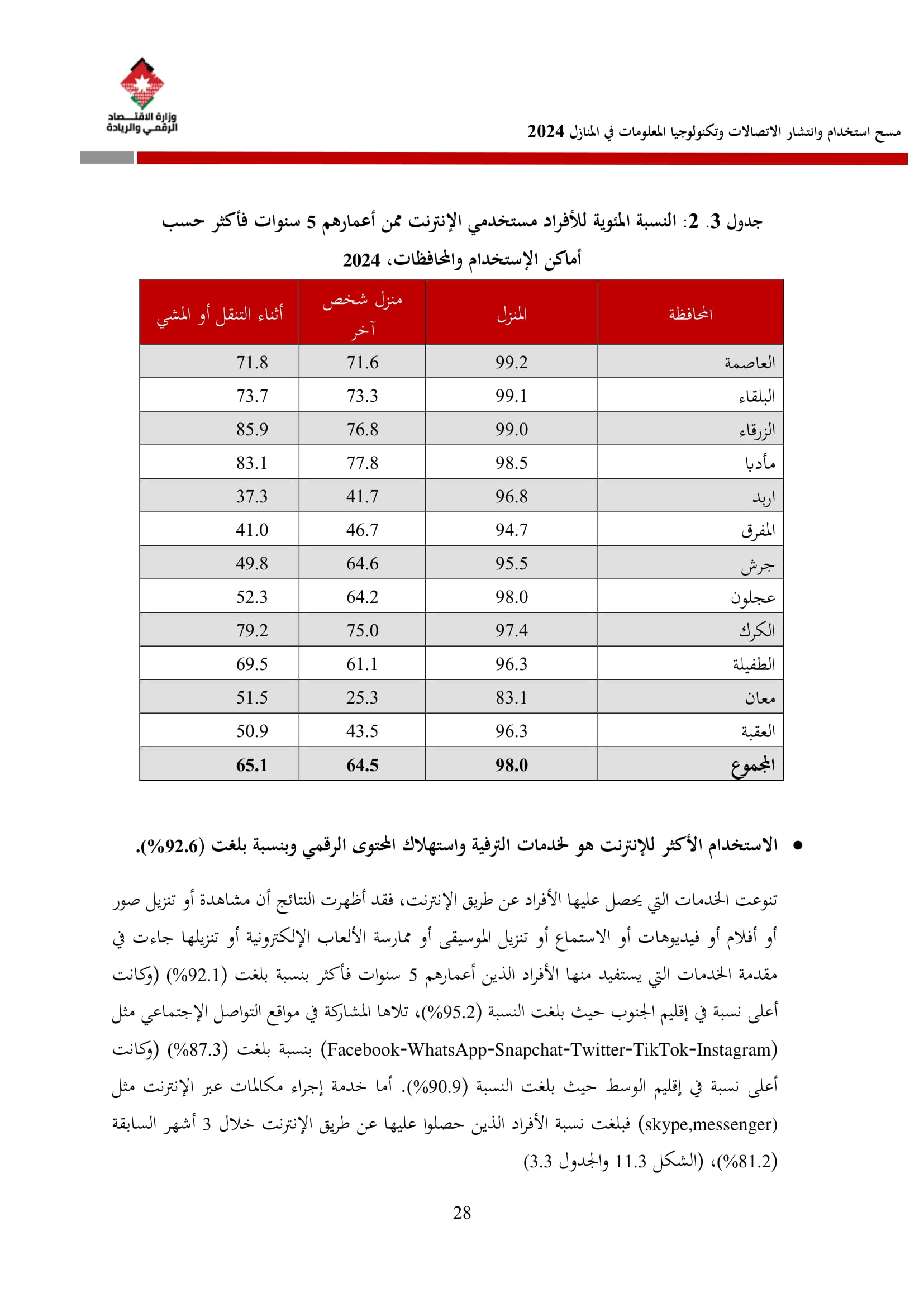 وتُظهر نتائج المسح أن الأُسر الأُردنية وأفرادها أكثر اتصالًا من أي وقت مضى، حيث بلغت نسبة الأُسر الأُردنية التي يتوفر لديها خدمة إنترنت في المنازل 96.5%، متجاوزةً هذه النسبة في محافظة العاصمة حاجز 98%، فيما ارتفعت نسبة الأفراد الذين استخدموا الانترنت من 92.5% عام 2023 إلى 95.6% عام 2024، متجاوزةً بذلك المتوسط العالمي البالغ 67.6%، والمتوسط للمنطقة العربية البالغ 69.6%. وأظهر المسح أن 94.8% من الأفراد يستخدمون الإنترنت بشكل يومي.