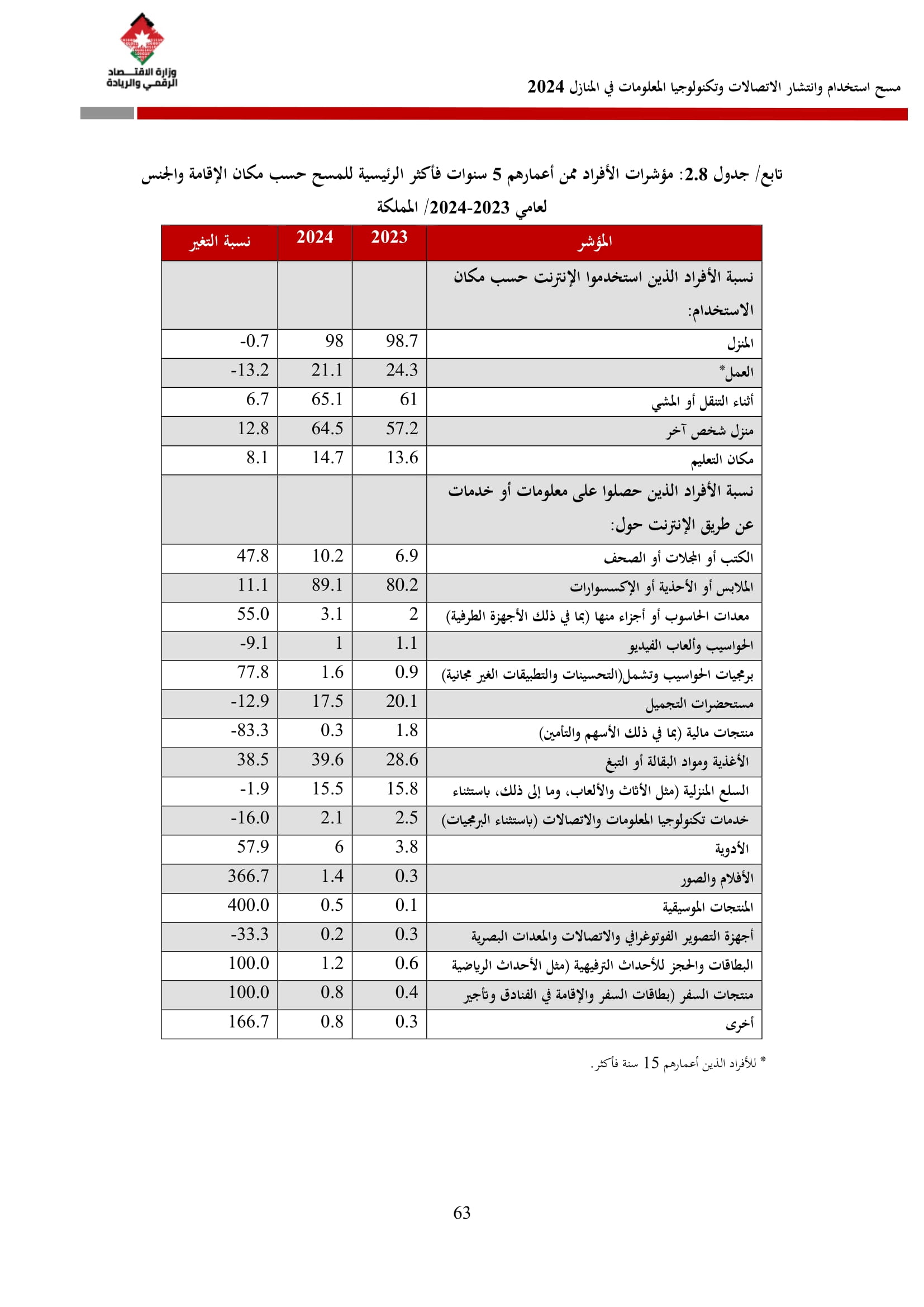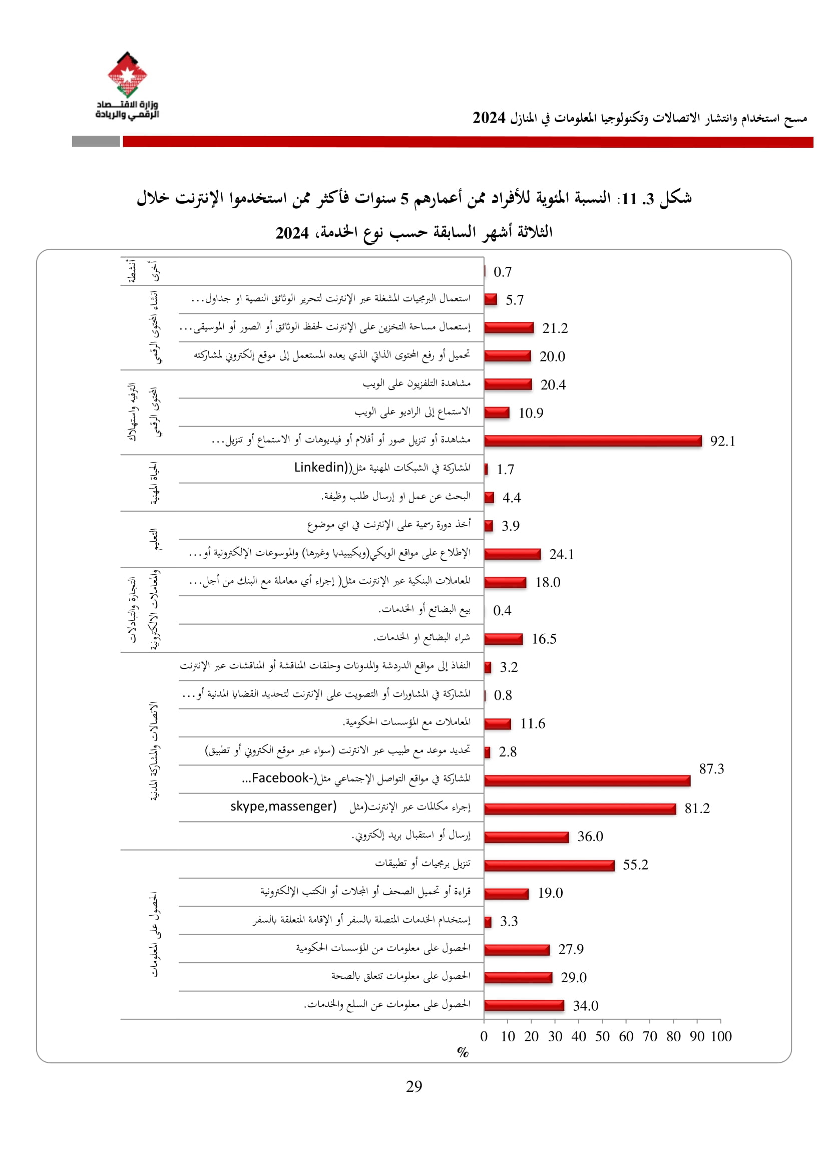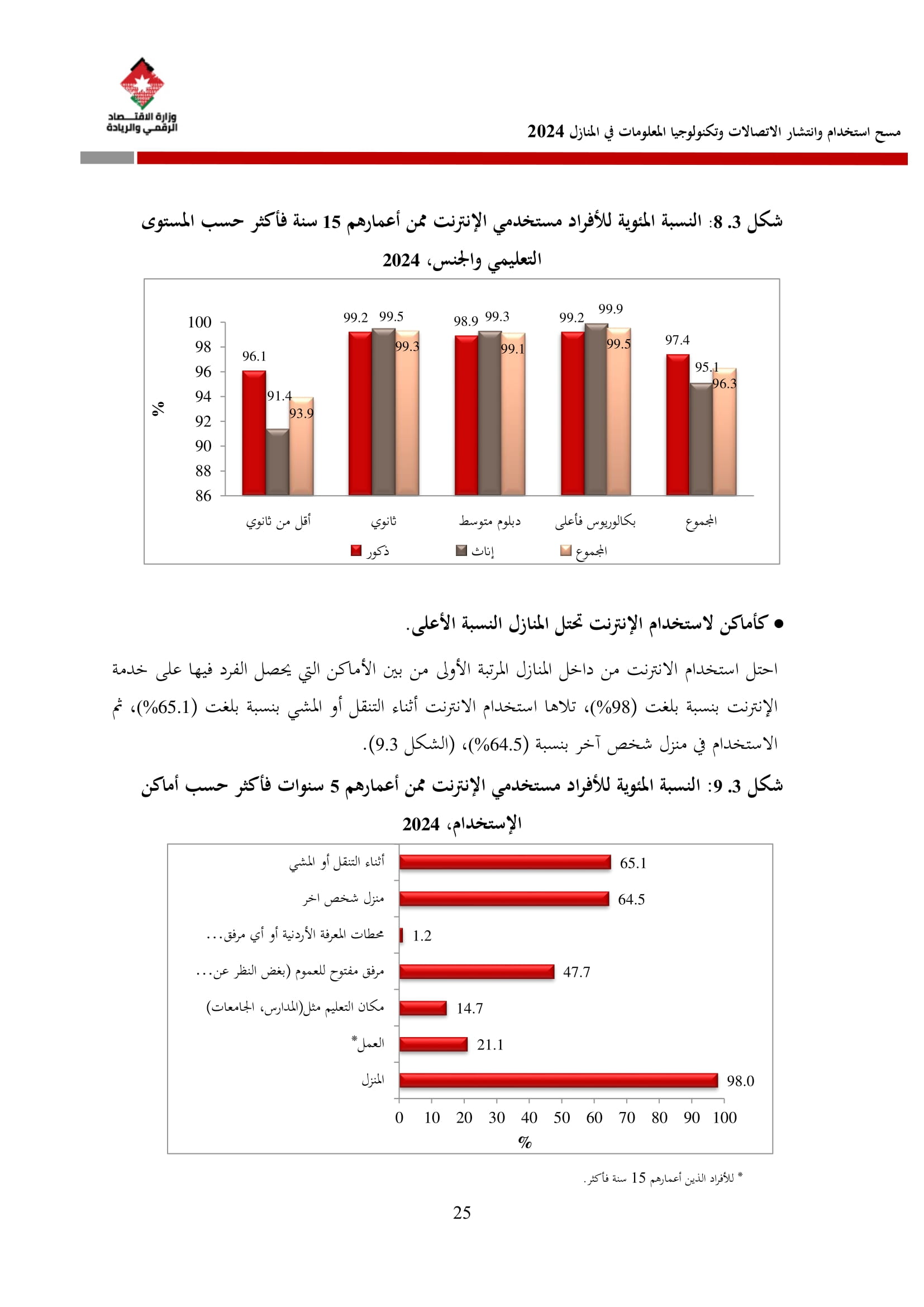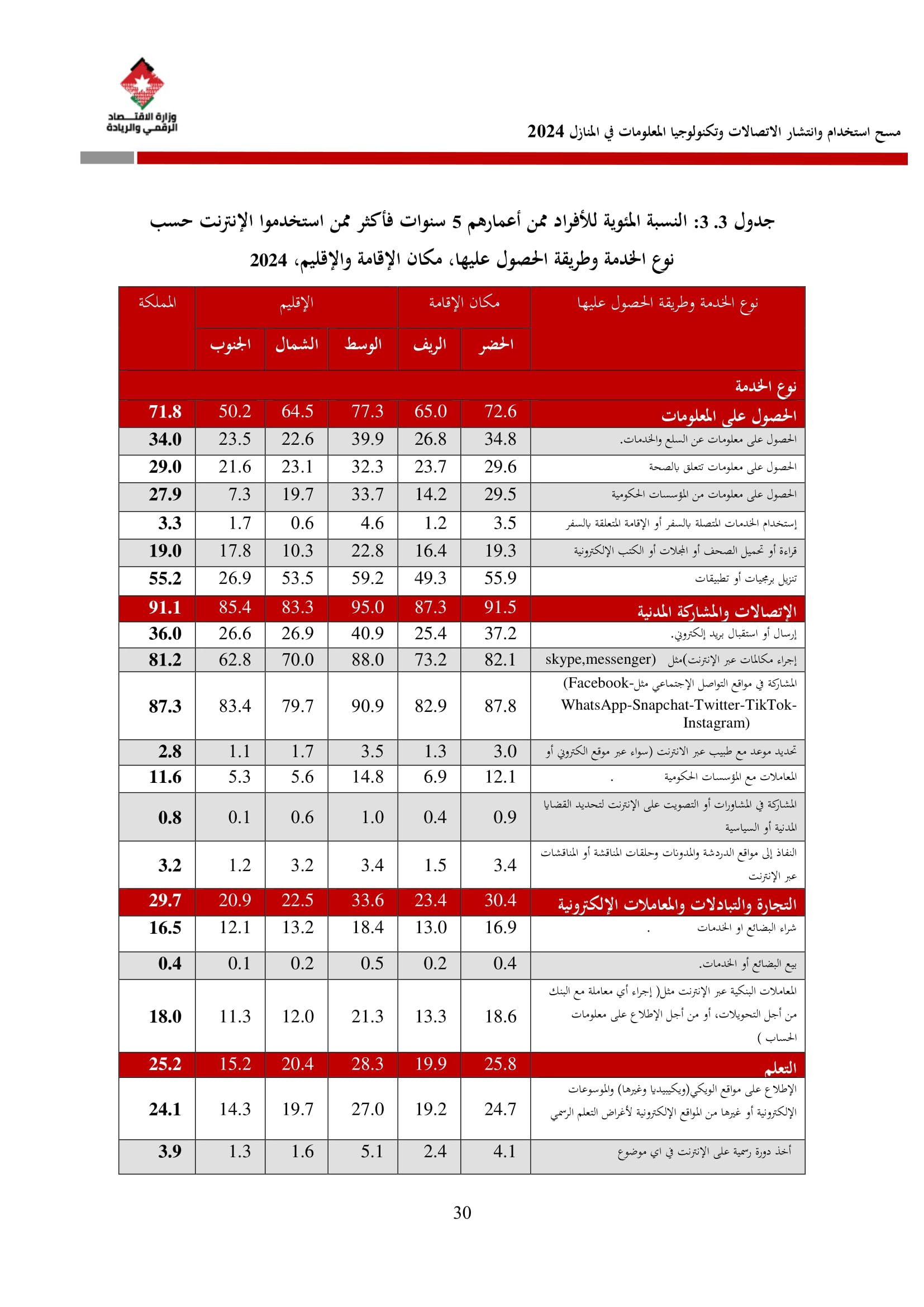 وتُظهر نتائج المسح أن الأُسر الأُردنية وأفرادها أكثر اتصالًا من أي وقت مضى، حيث بلغت نسبة الأُسر الأُردنية التي يتوفر لديها خدمة إنترنت في المنازل 96.5%، متجاوزةً هذه النسبة في محافظة العاصمة حاجز 98%، فيما ارتفعت نسبة الأفراد الذين استخدموا الانترنت من 92.5% عام 2023 إلى 95.6% عام 2024، متجاوزةً بذلك المتوسط العالمي البالغ 67.6%، والمتوسط للمنطقة العربية البالغ 69.6%. وأظهر المسح أن 94.8% من الأفراد يستخدمون الإنترنت بشكل يومي.