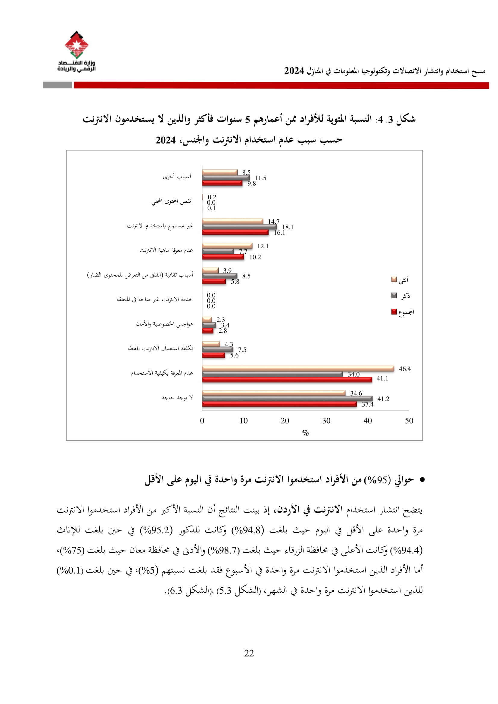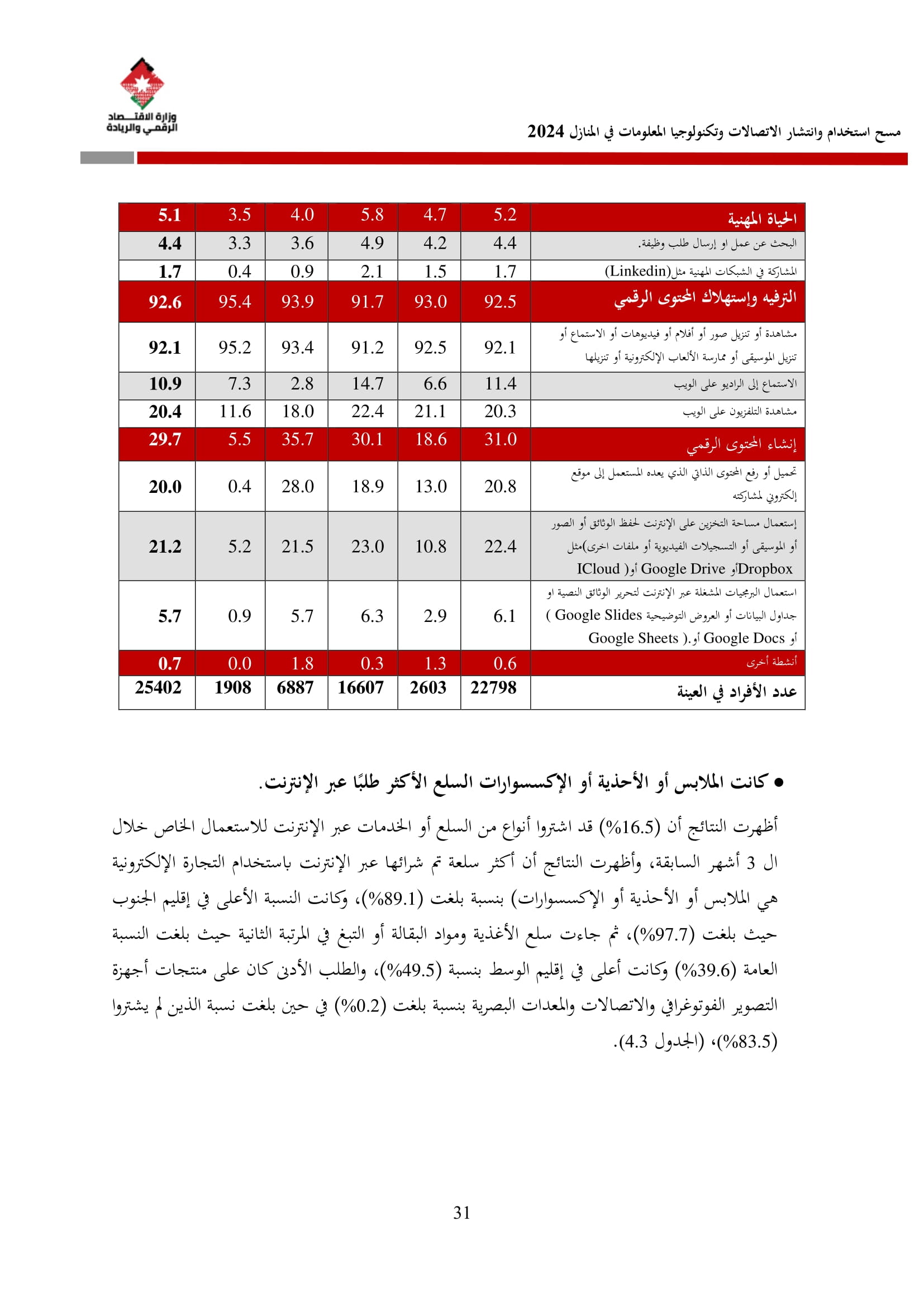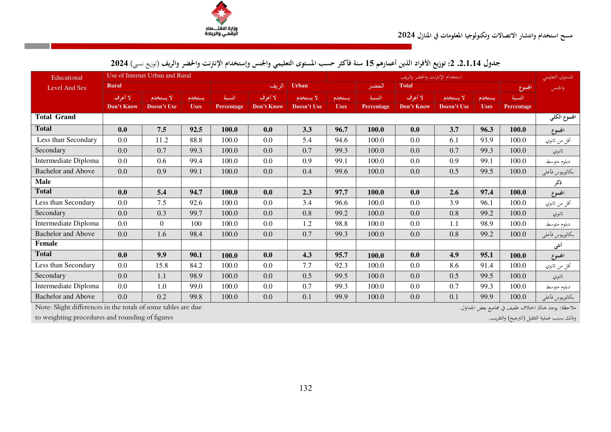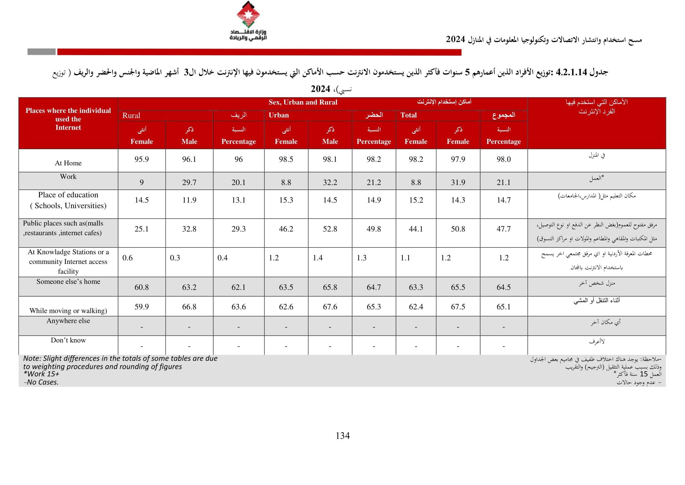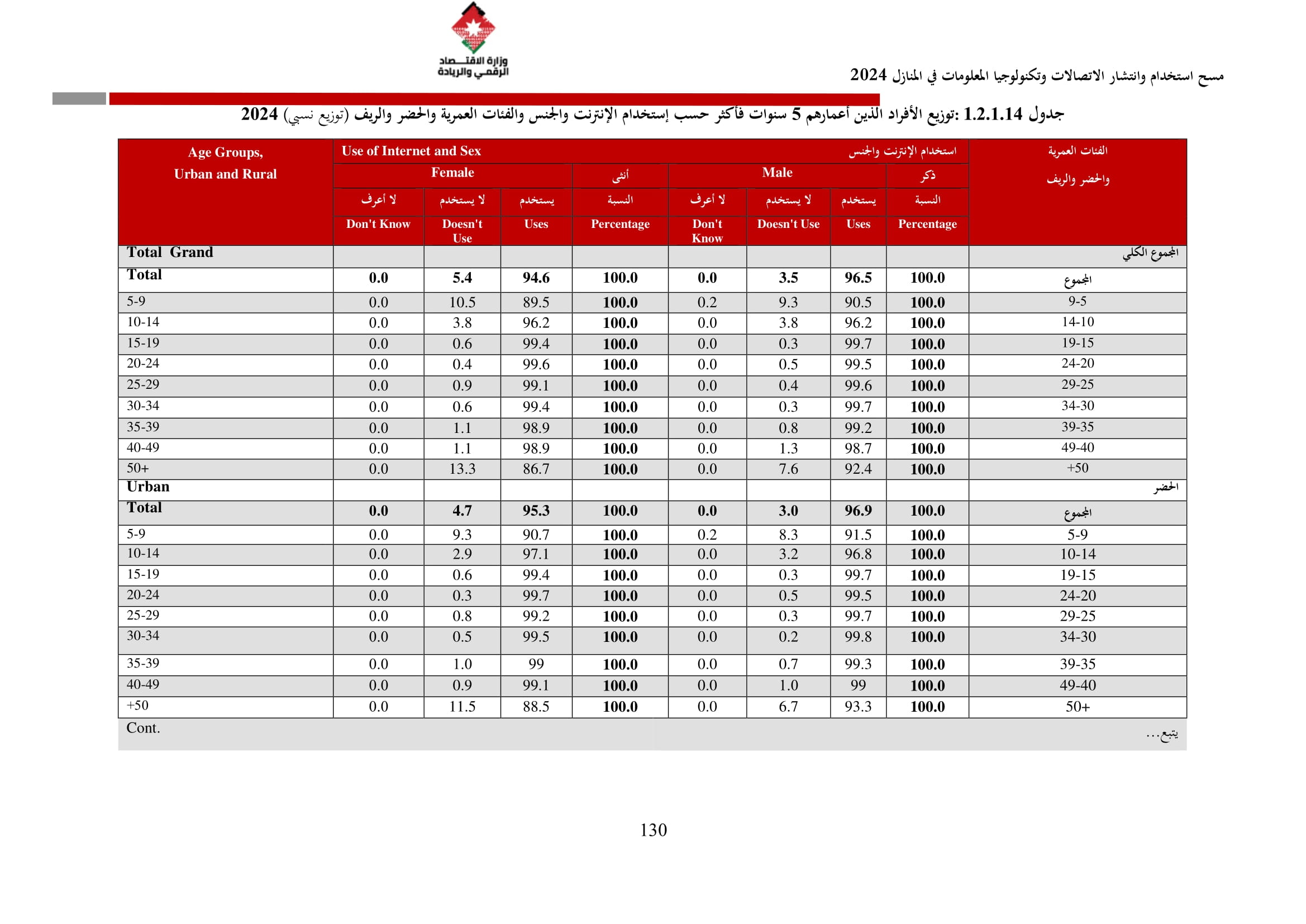 وتُظهر نتائج المسح أن الأُسر الأُردنية وأفرادها أكثر اتصالًا من أي وقت مضى، حيث بلغت نسبة الأُسر الأُردنية التي يتوفر لديها خدمة إنترنت في المنازل 96.5%، متجاوزةً هذه النسبة في محافظة العاصمة حاجز 98%، فيما ارتفعت نسبة الأفراد الذين استخدموا الانترنت من 92.5% عام 2023 إلى 95.6% عام 2024، متجاوزةً بذلك المتوسط العالمي البالغ 67.6%، والمتوسط للمنطقة العربية البالغ 69.6%. وأظهر المسح أن 94.8% من الأفراد يستخدمون الإنترنت بشكل يومي.