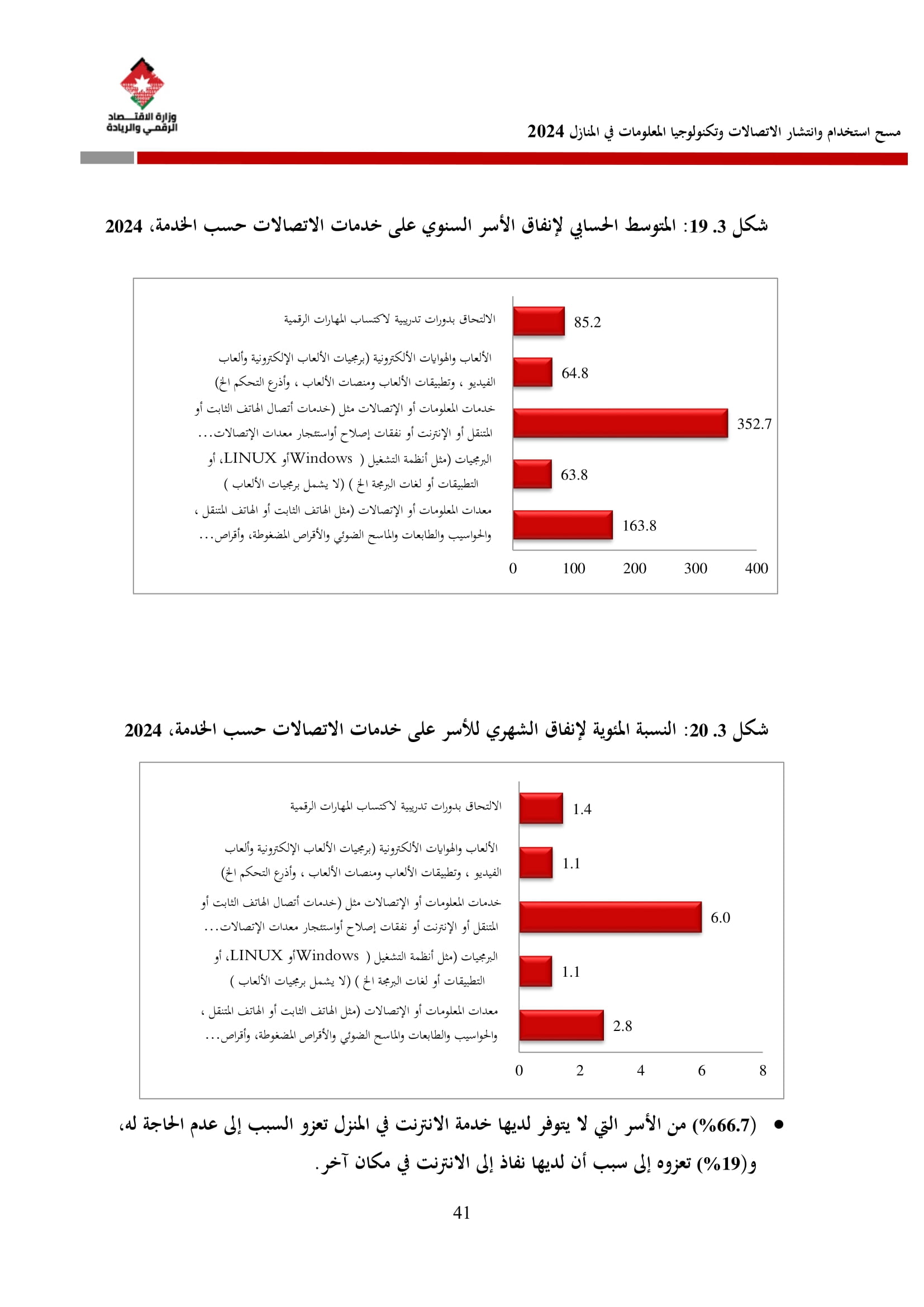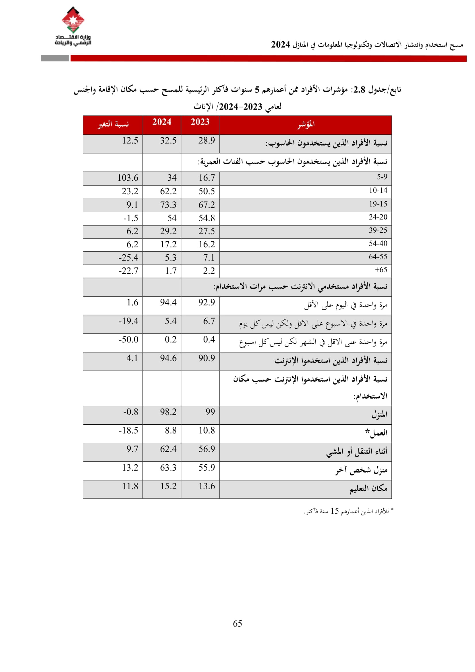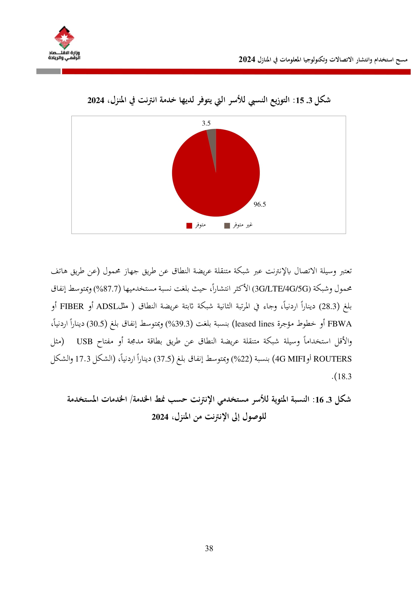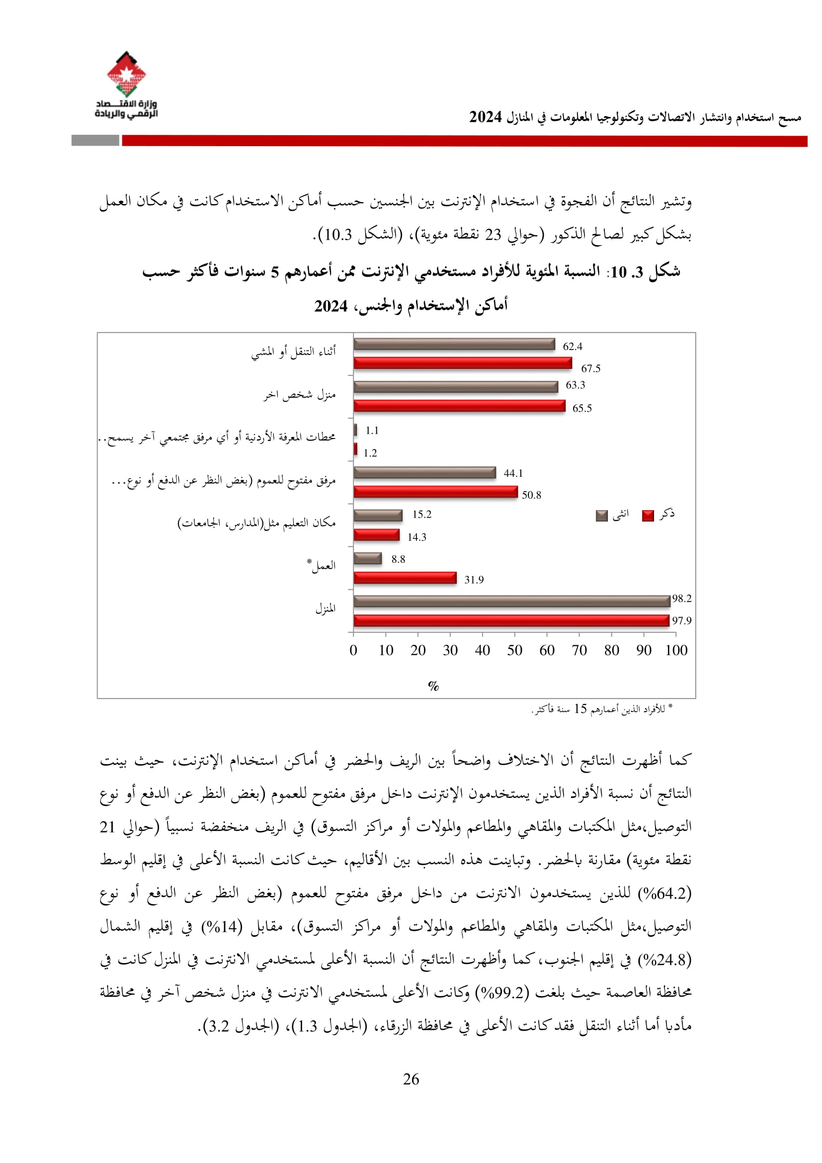 وتُظهر نتائج المسح أن الأُسر الأُردنية وأفرادها أكثر اتصالًا من أي وقت مضى، حيث بلغت نسبة الأُسر الأُردنية التي يتوفر لديها خدمة إنترنت في المنازل 96.5%، متجاوزةً هذه النسبة في محافظة العاصمة حاجز 98%، فيما ارتفعت نسبة الأفراد الذين استخدموا الانترنت من 92.5% عام 2023 إلى 95.6% عام 2024، متجاوزةً بذلك المتوسط العالمي البالغ 67.6%، والمتوسط للمنطقة العربية البالغ 69.6%. وأظهر المسح أن 94.8% من الأفراد يستخدمون الإنترنت بشكل يومي.