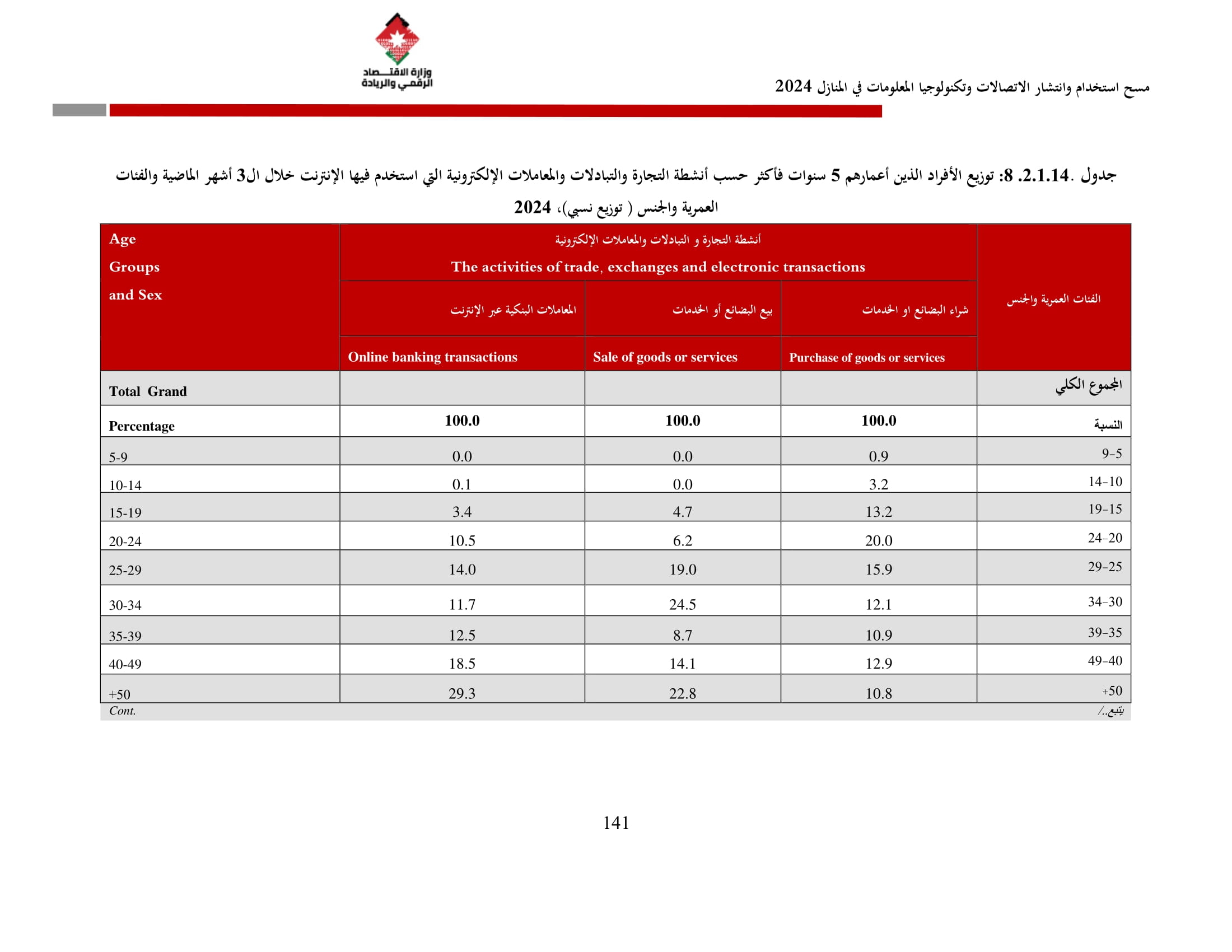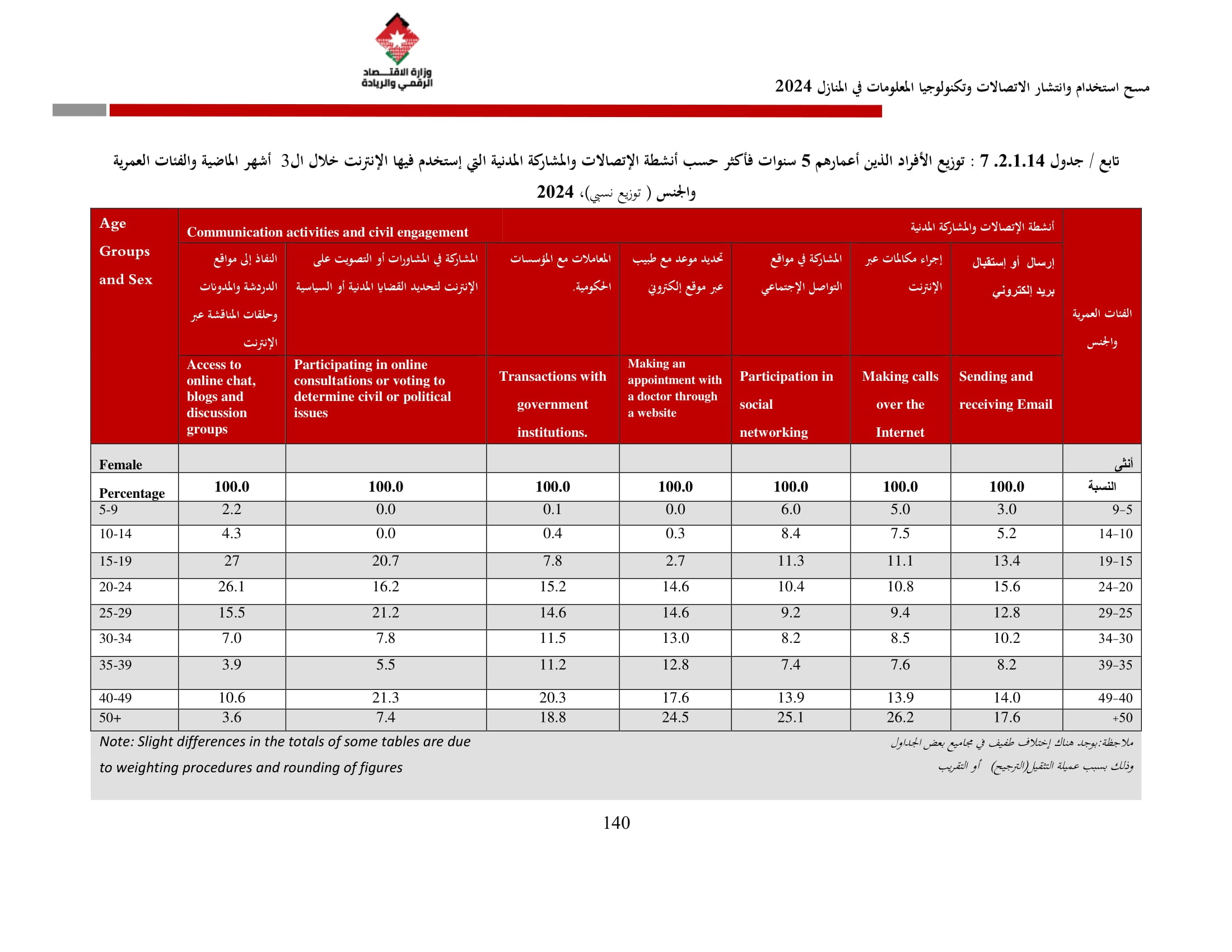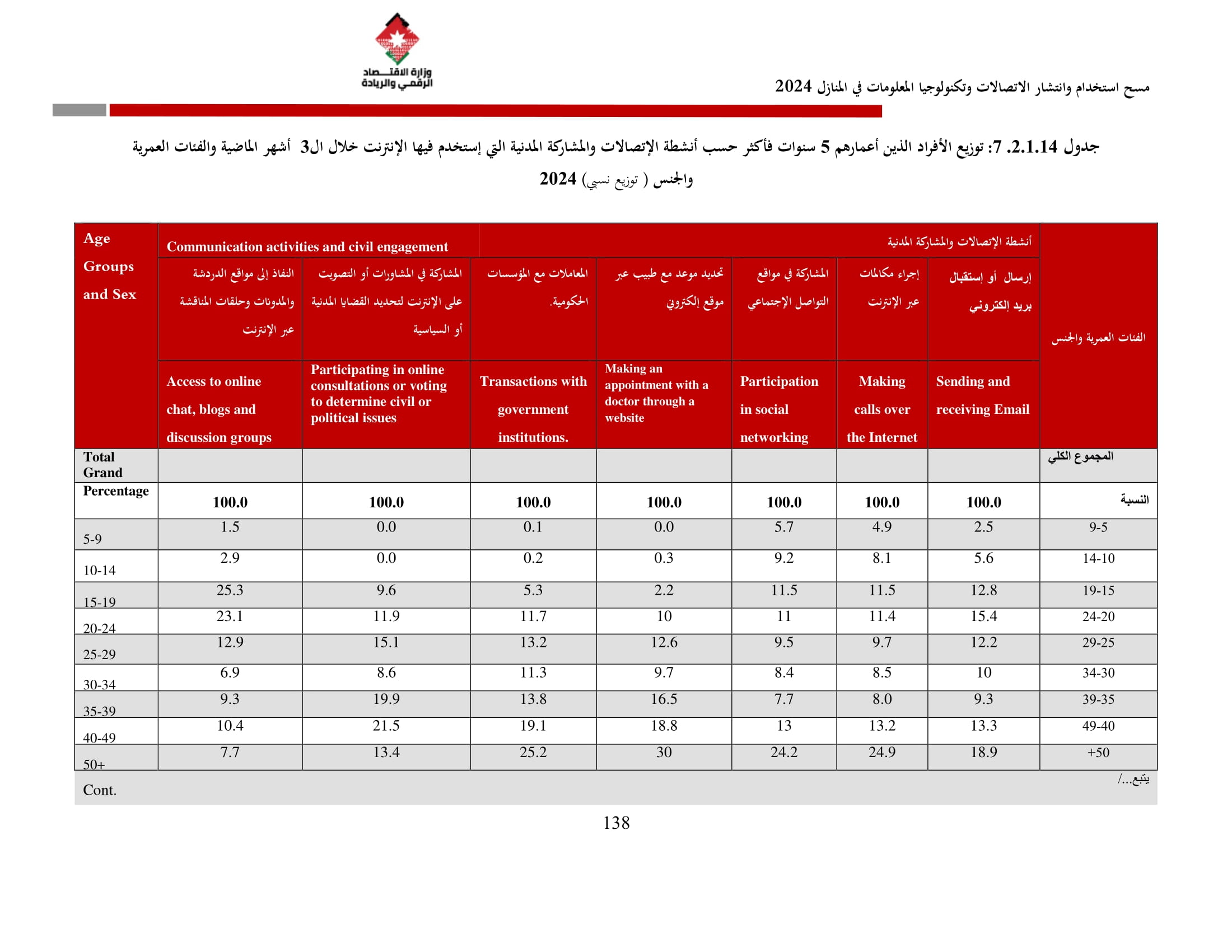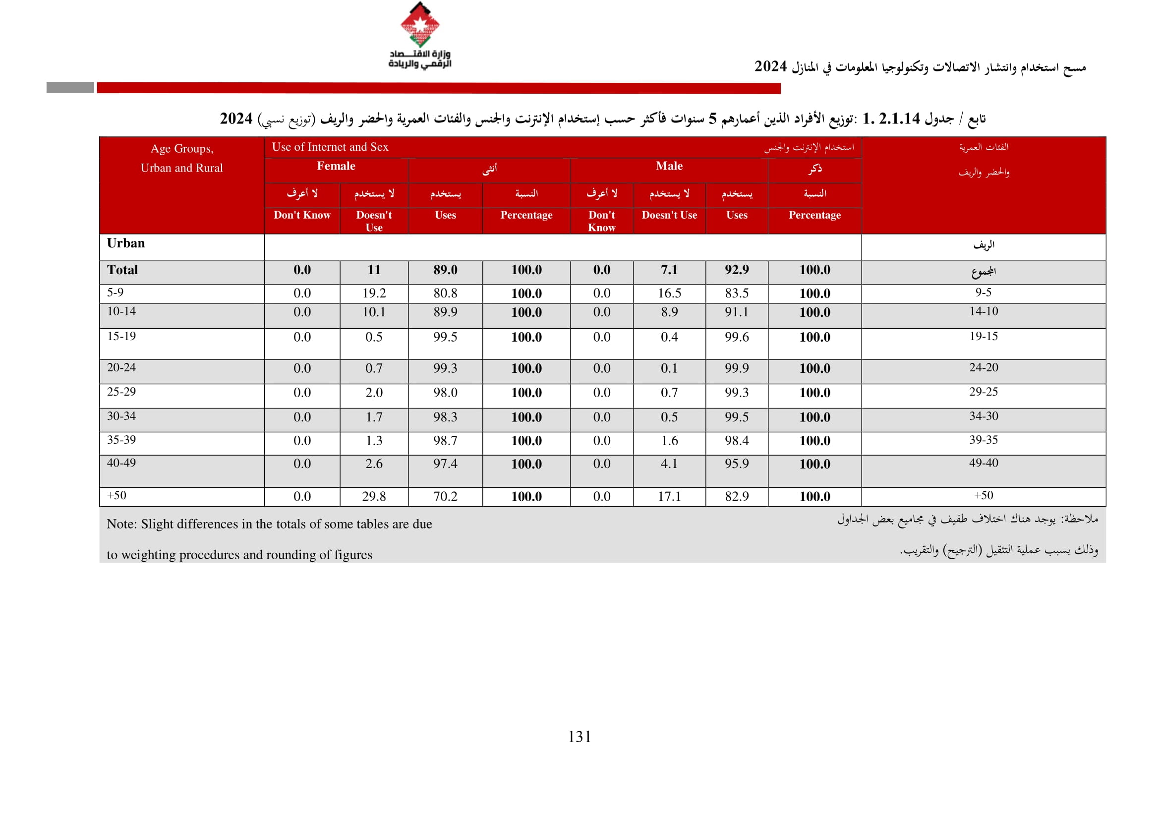 وتُظهر نتائج المسح أن الأُسر الأُردنية وأفرادها أكثر اتصالًا من أي وقت مضى، حيث بلغت نسبة الأُسر الأُردنية التي يتوفر لديها خدمة إنترنت في المنازل 96.5%، متجاوزةً هذه النسبة في محافظة العاصمة حاجز 98%، فيما ارتفعت نسبة الأفراد الذين استخدموا الانترنت من 92.5% عام 2023 إلى 95.6% عام 2024، متجاوزةً بذلك المتوسط العالمي البالغ 67.6%، والمتوسط للمنطقة العربية البالغ 69.6%. وأظهر المسح أن 94.8% من الأفراد يستخدمون الإنترنت بشكل يومي.
