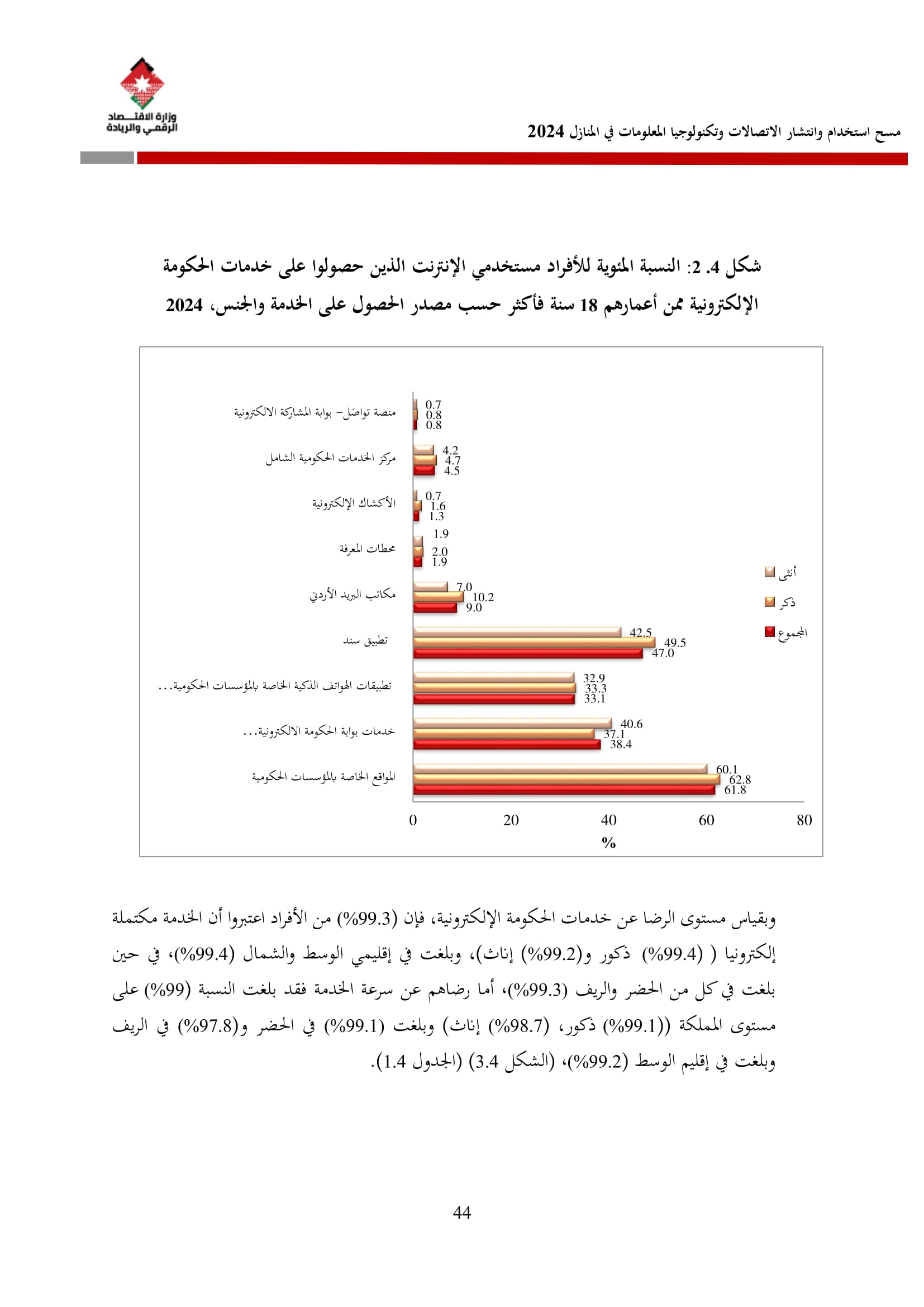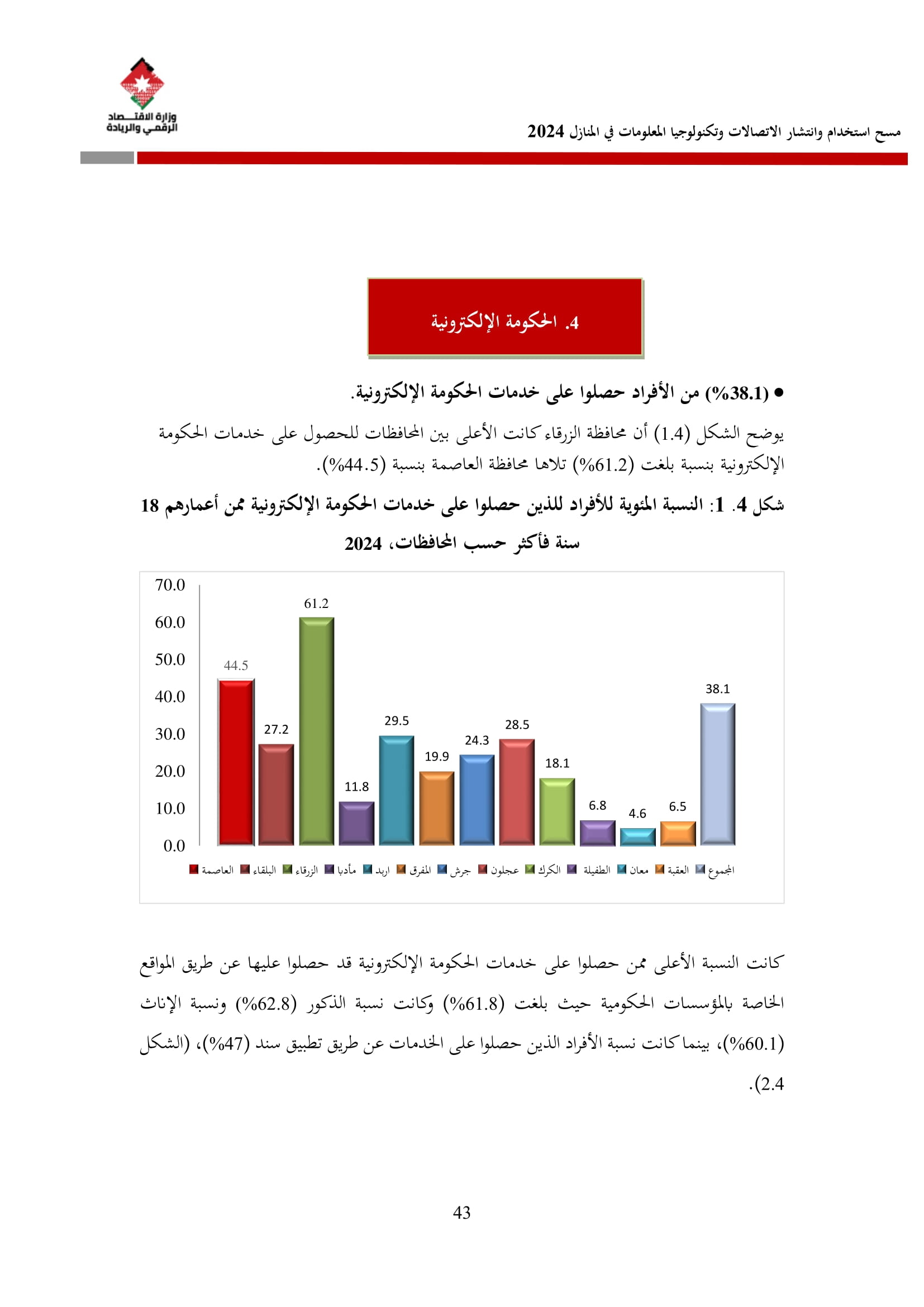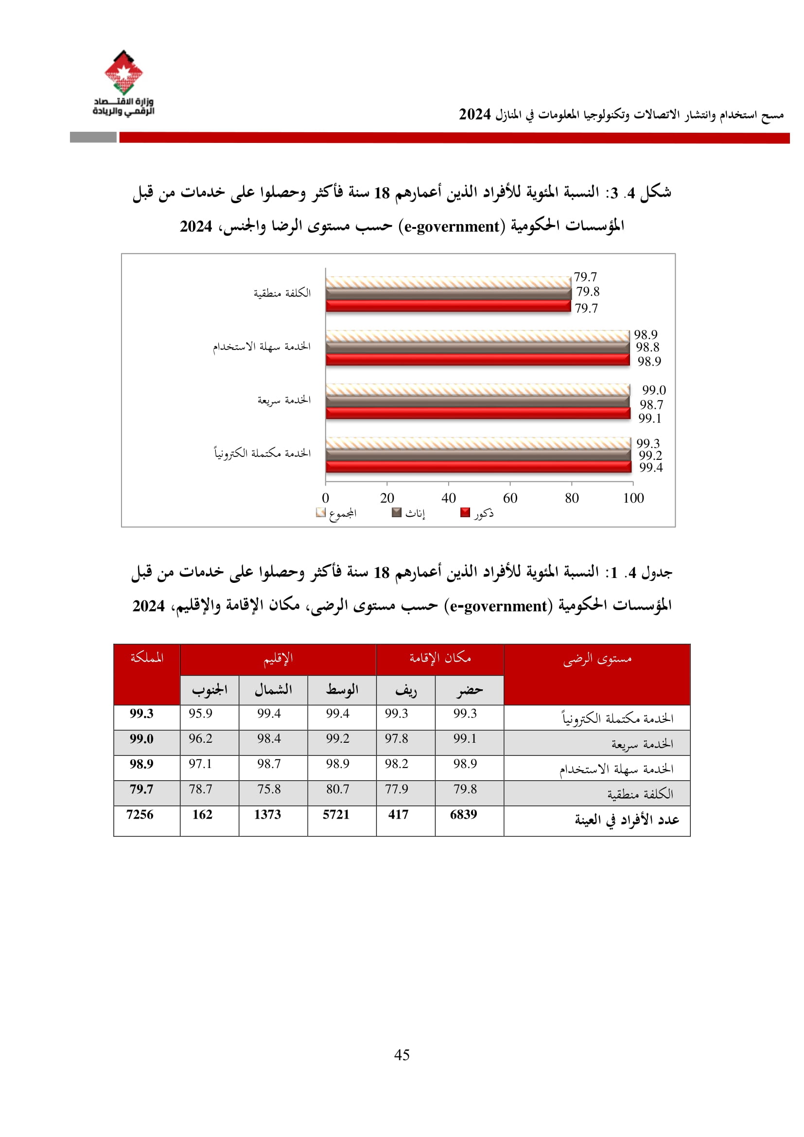 وفيما يتعلق بخدمات الحكومة الإلكترونية، فقد أظهرت نتائج المسح أن نسبة الأفراد الذين حصلوا على إحدى هذه الخدمات قد بلغت 38.1%، حيث عبر 98.9% منهم عن سهولة استخدامها، وأكد 99.0% سرعة تقديمها، بينما اعتبر 99.3% أنها مكتملة إلكترونيًا.