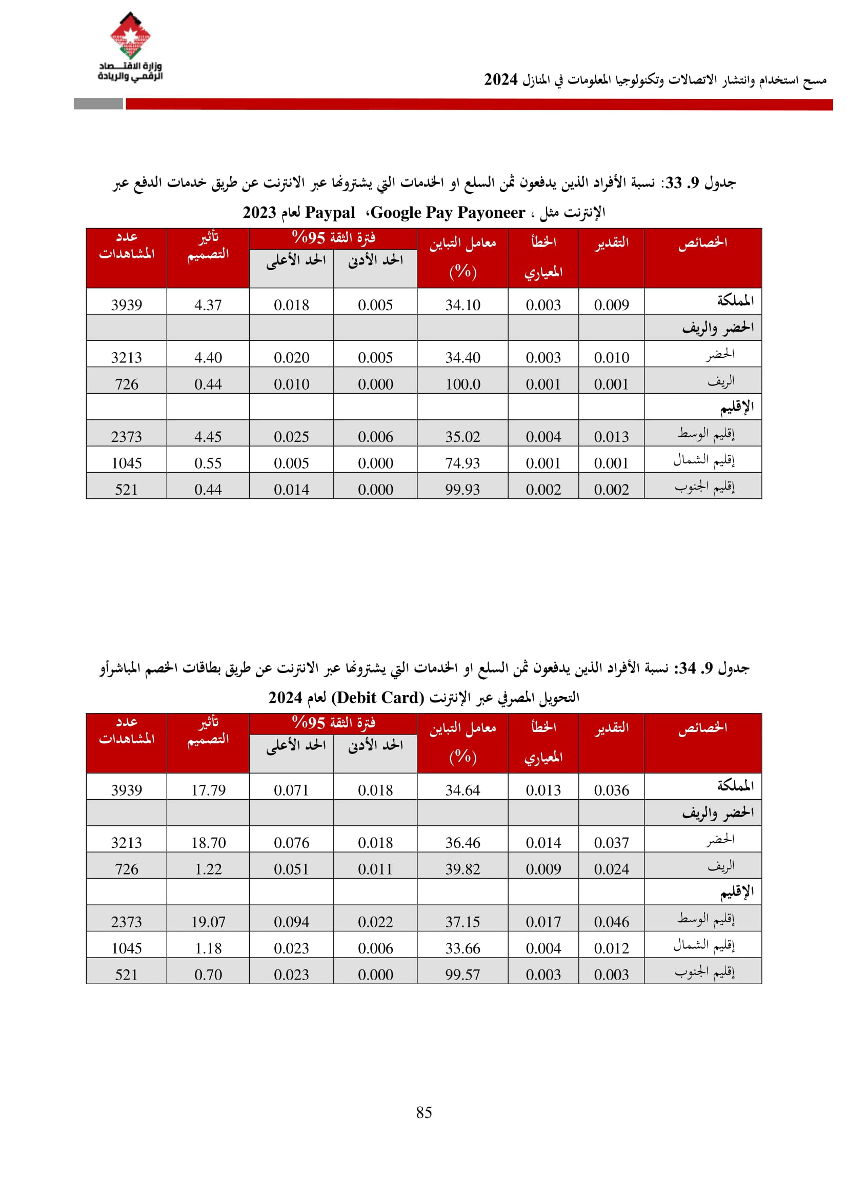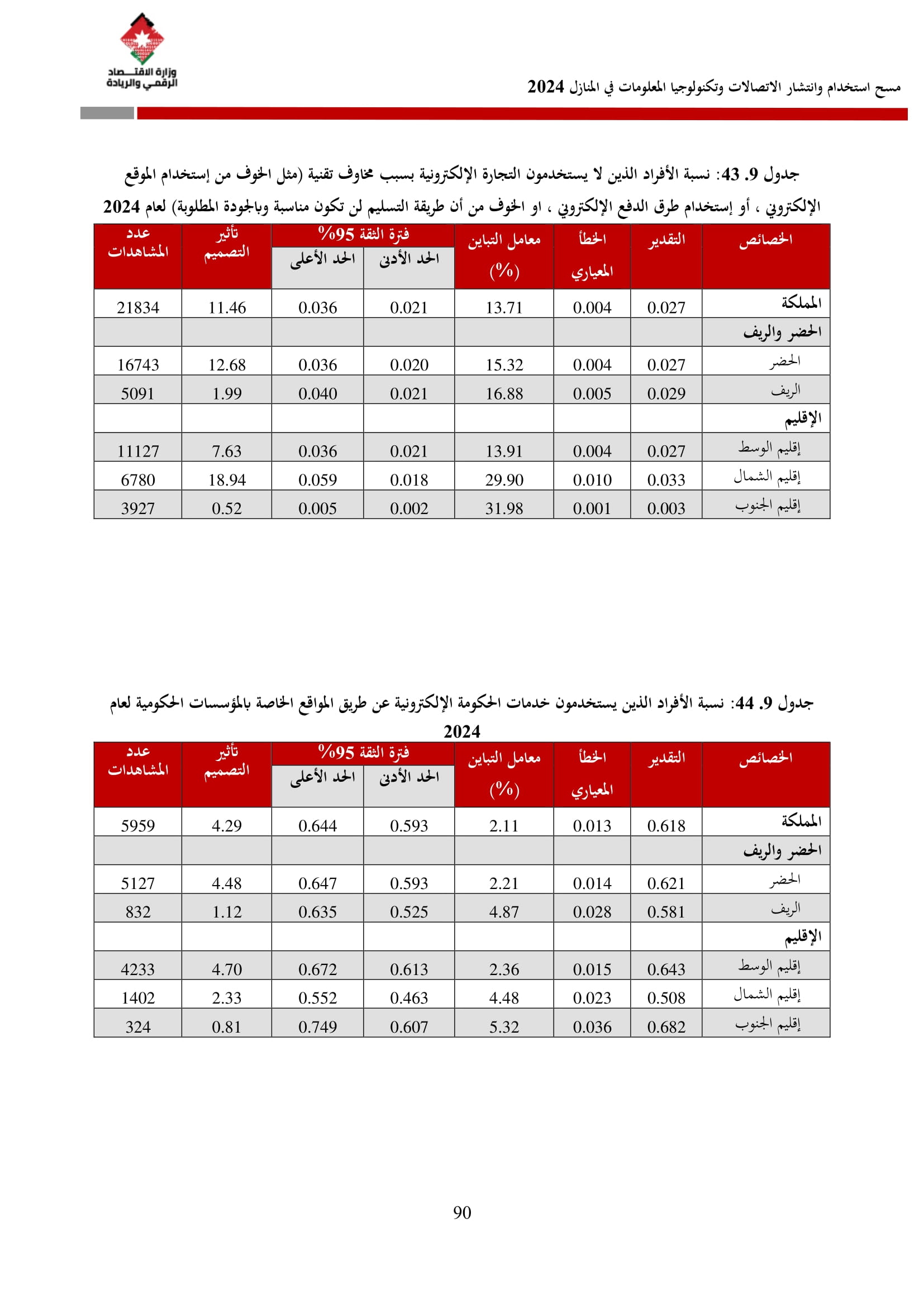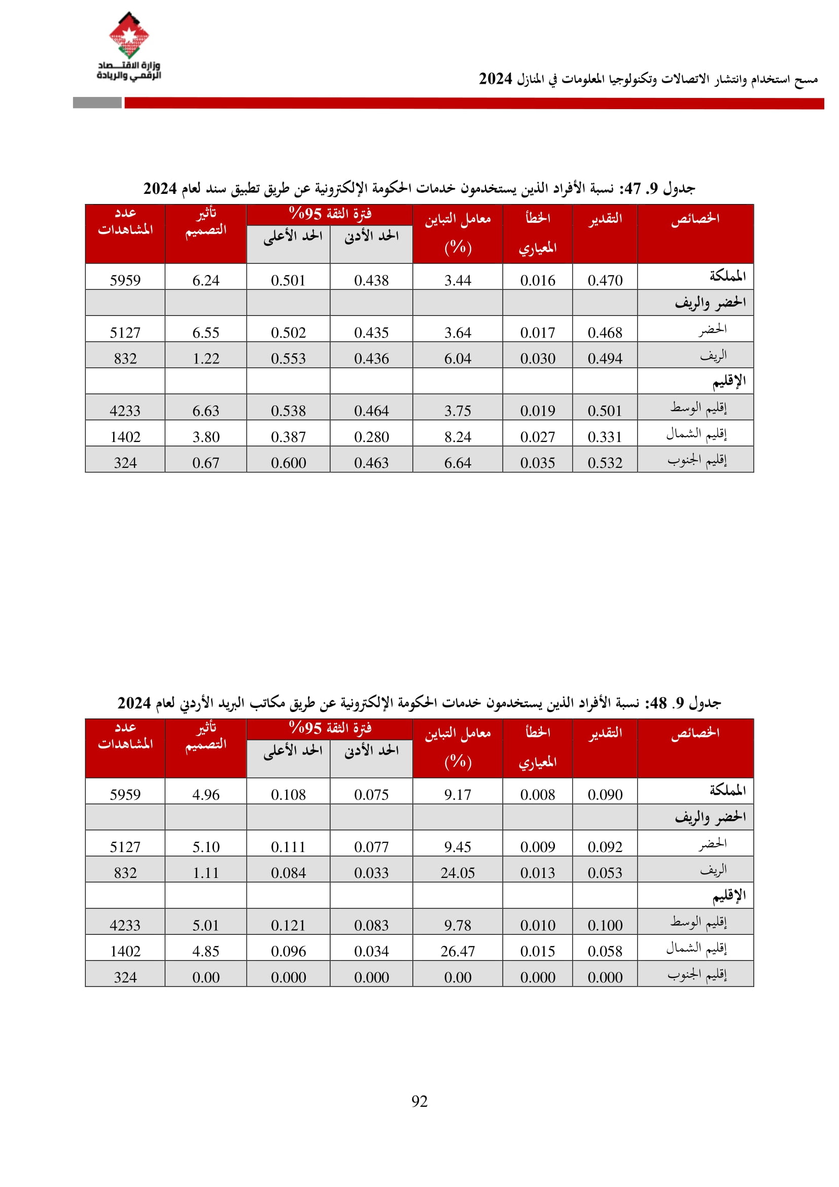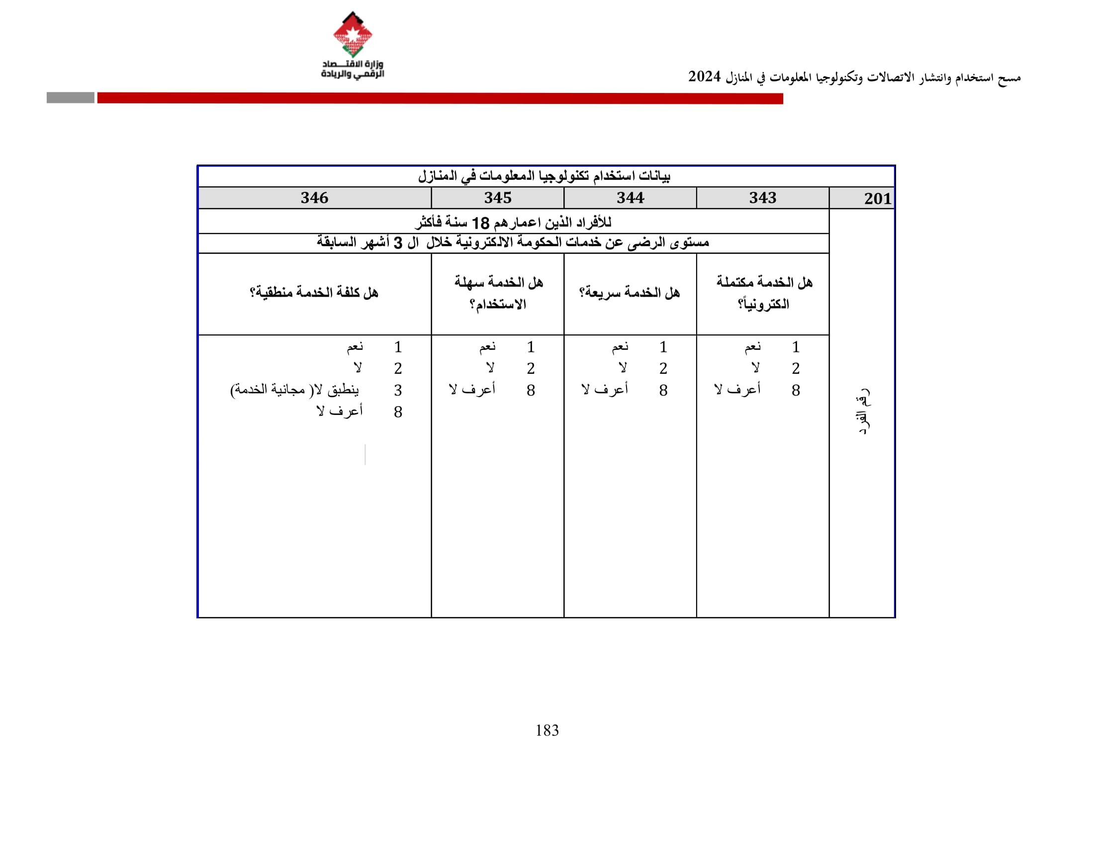 وفيما يتعلق بخدمات الحكومة الإلكترونية، فقد أظهرت نتائج المسح أن نسبة الأفراد الذين حصلوا على إحدى هذه الخدمات قد بلغت 38.1%، حيث عبر 98.9% منهم عن سهولة استخدامها، وأكد 99.0% سرعة تقديمها، بينما اعتبر 99.3% أنها مكتملة إلكترونيًا.