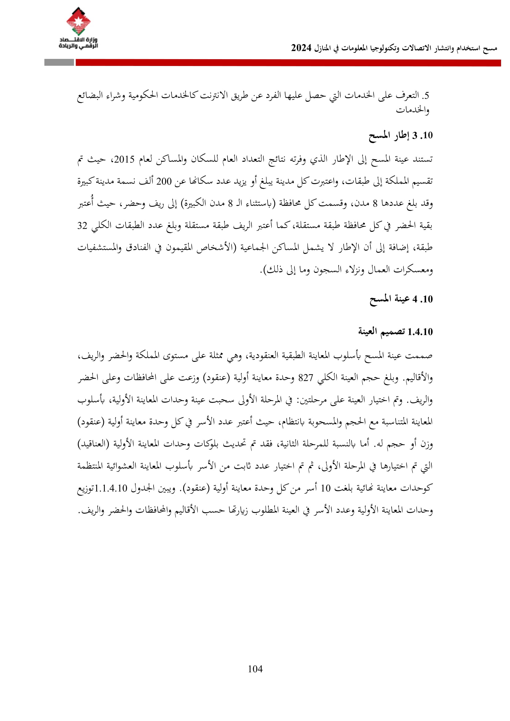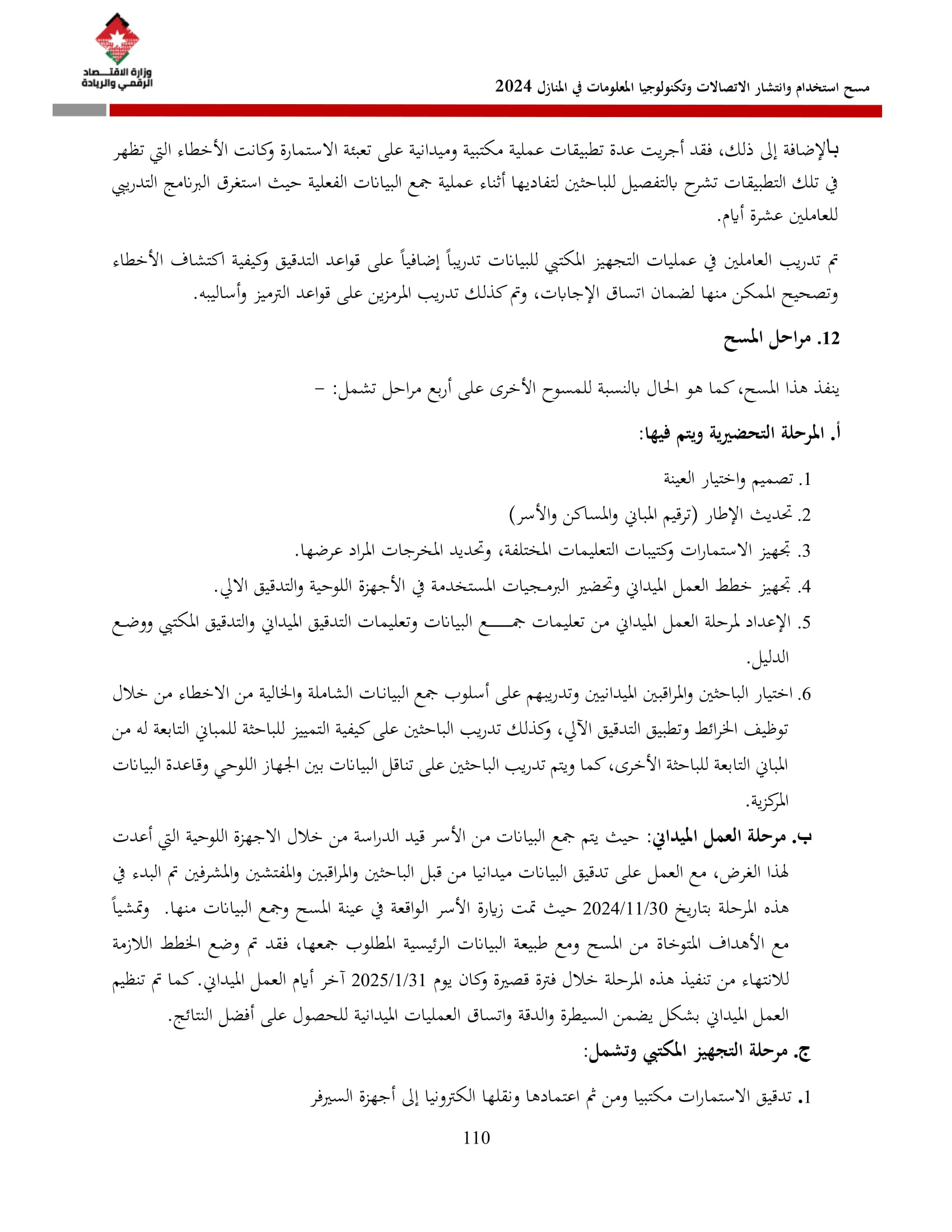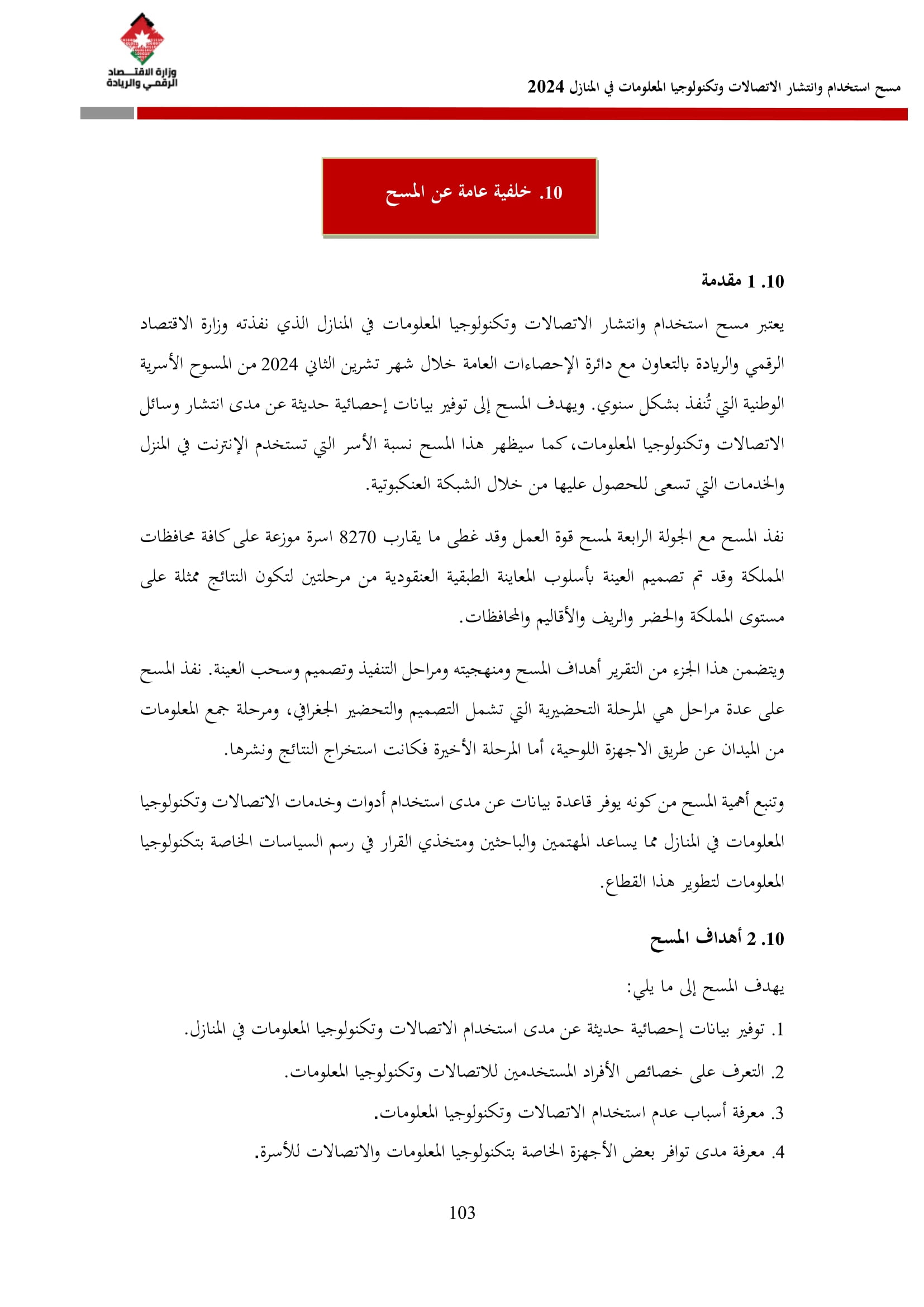 يُذكر أن المسح الذي يُنفذ سنويًا منذ عام 2007 بالتعاون مع دائرة الإحصاءات العامة شمل في نسخته لعام 2024 عينة بلغت 8270 أسرة، جُمعت بما يضمن التمثيل على مستوى المملكة وأقاليمها الثلاثة (شمال، وسط، جنوب) وعلى مستوى المحافظات، وبالاعتماد على إطار التعداد العام للسكان والمساكن لعام 2015.
