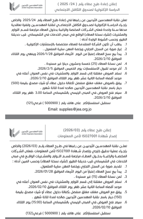 عطاءات صادرة عن نقابة المهندسين الاردنيين
