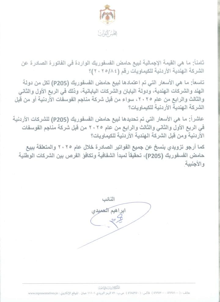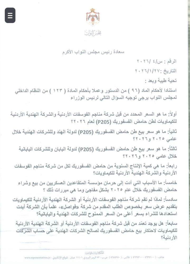 عمون - وجّه النائب إبراهيم الحميدي سؤالًا نيابيًا إلى رئيس الوزراء، استنادًا لأحكام المادة (96) من الدستور والمادة (123) من النظام الداخلي لمجلس النواب، حول آليات تسعير وبيع حامض الفسفوريك (P205) من قبل شركة مناجم الفوسفات الأردنية والشركة الهندية الأردنية للكيماويات. |