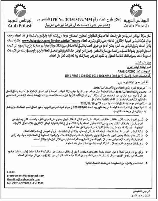 عطاء صادر عن شركة البوتاس العربية