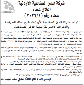 عطاء شراء خدمات الحراسة والاشراف الامني لشركة المدن الصناعية
