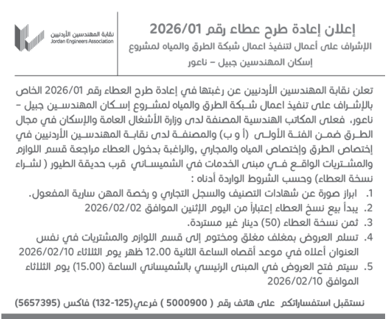 عطاء صادر عن نقابة المهندسين الاردنيين