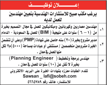 يرغب مكتب صبح للاستشارات الهندسية بتعيين مهندسين
