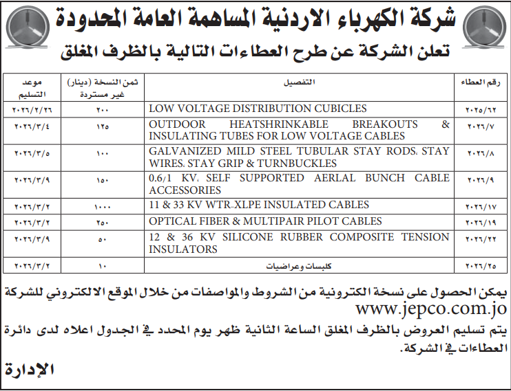 عطاءات صادرة عن شركة الكهرباء الاردنية المساهمة العامة