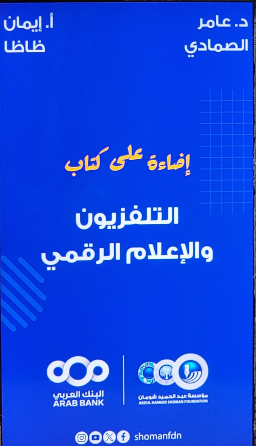 عمون - اقامت مؤسسة عبدالحميد شومان مساء الاربعاء ندوة للاضاءة على كتاب الدكتور عامر الصمادي الصادر حديثا بعنوان -التلفزيون والاعلام الرقمي، بحضور نخبة من المثقفين والاعلاميين ورواد مؤسسة شومان وقدمته الاعلامية ايمان ظاظا .