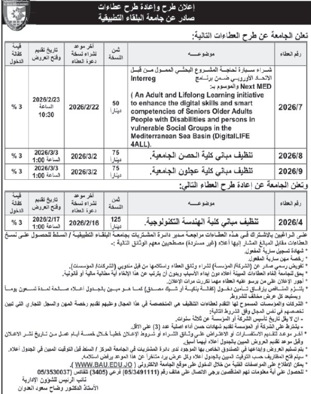 عطاءات صادرة عن جامعة البلقاء التطبيقية