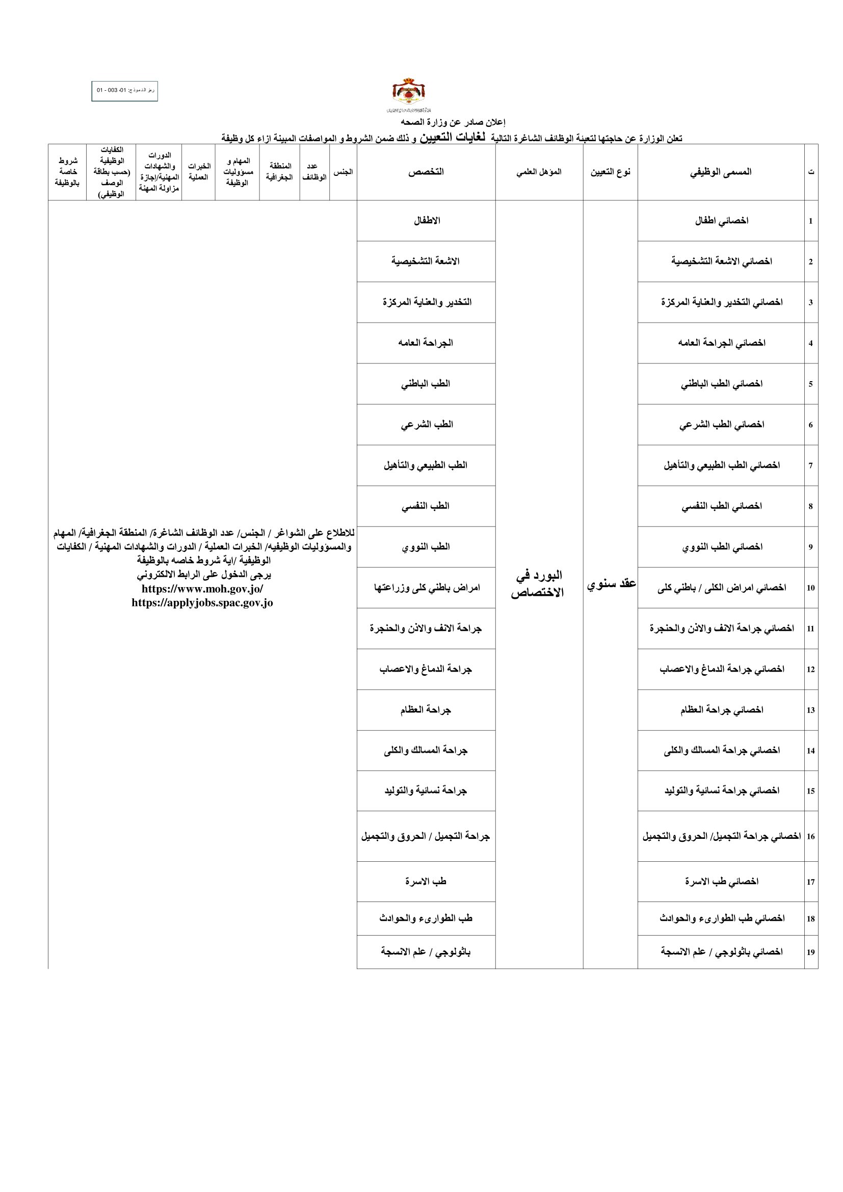عمون - أعلنت وزارة الصحة عن حاجتها لتعيين اطباء اخصائيين من كافة التخصصات العامة والفرعية.