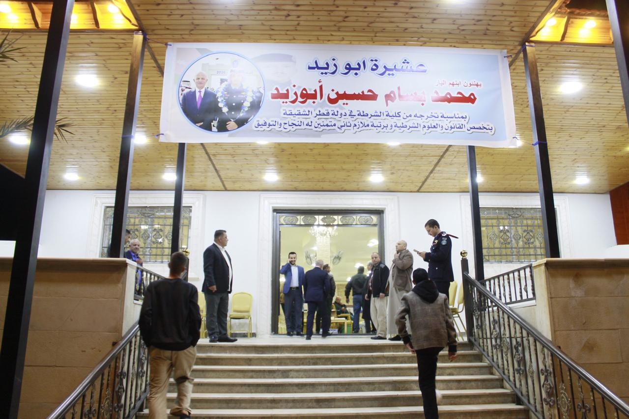عمون - أقام اللواء المتقاعد بسام حسين أبو زيد حفل استقبال في ديوان عشيرة أبو زيد بمناسبة تخرج نجله محمد من كلية الشرطة في دولة قطر الشقيقة برتبة ملازم ثاني وحصوله على درجة البكالوريوس في القانون ودبلوم في العلوم الشرطية. |