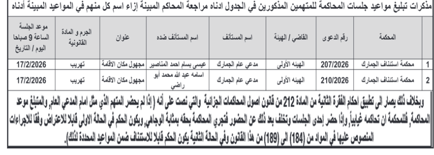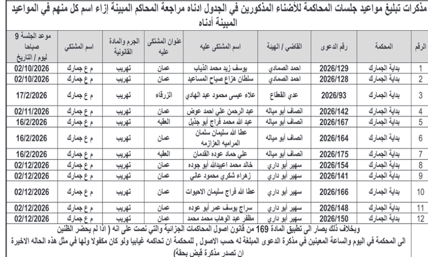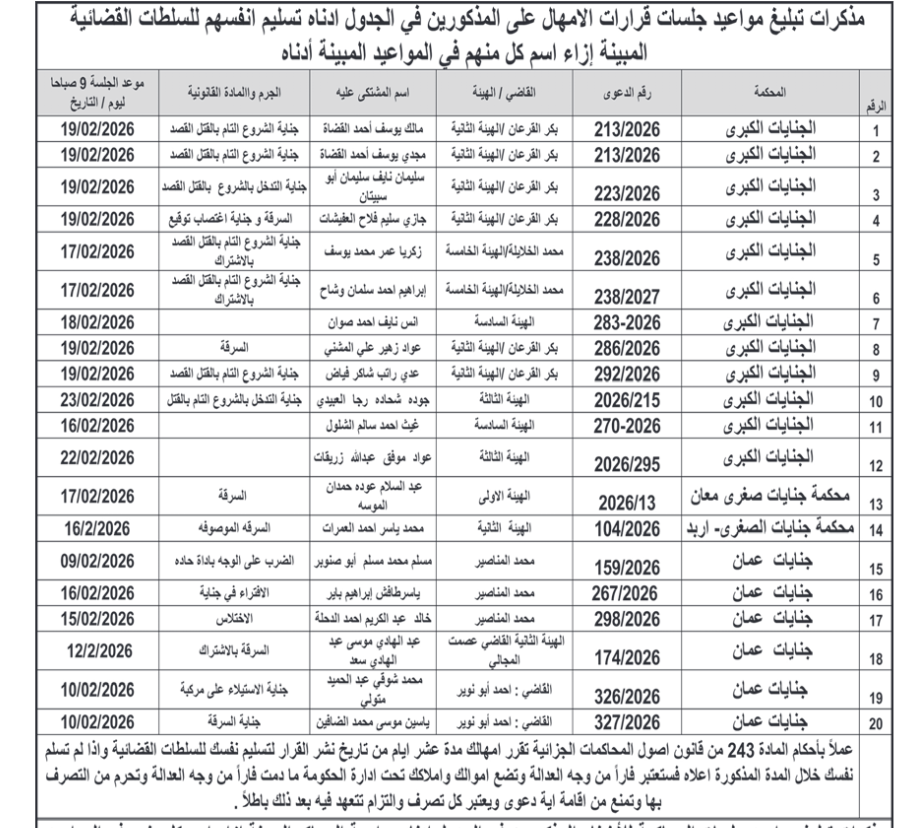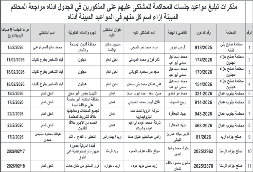 عمون - اصدرت اليوم الاثنين، مذكرات تبليغ بمواعيد جلسات المحاكمة لمشتكى عليهم في المحاكم النظامية.