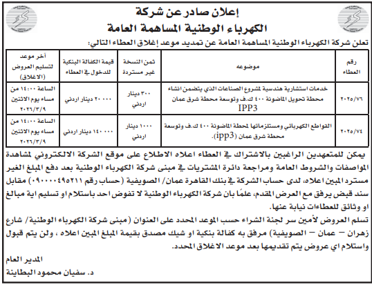 عطاءات صادرة عن شركة الكهرباء الوطنية