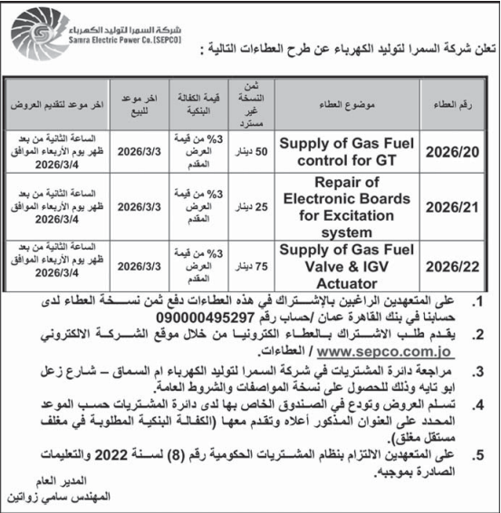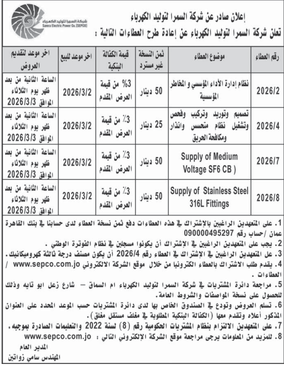 عطاءات صادرة عن شركة السمرا لتوليد الكهرباء
