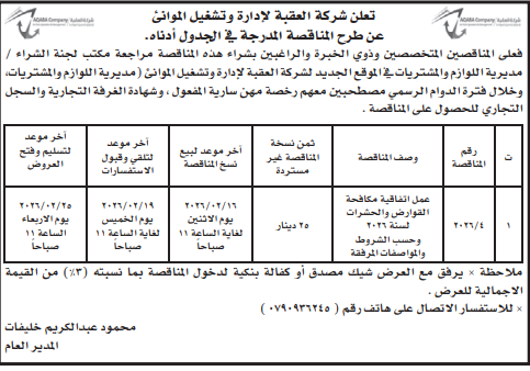 عطاء صادر عن شركة العقبة لادارة وتشغيل الموانئ