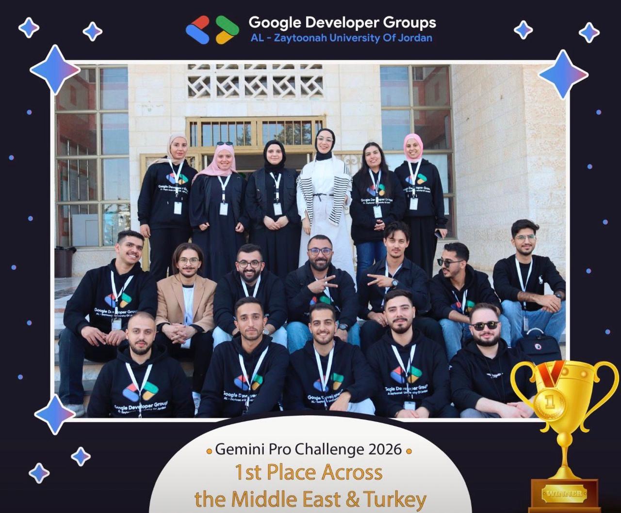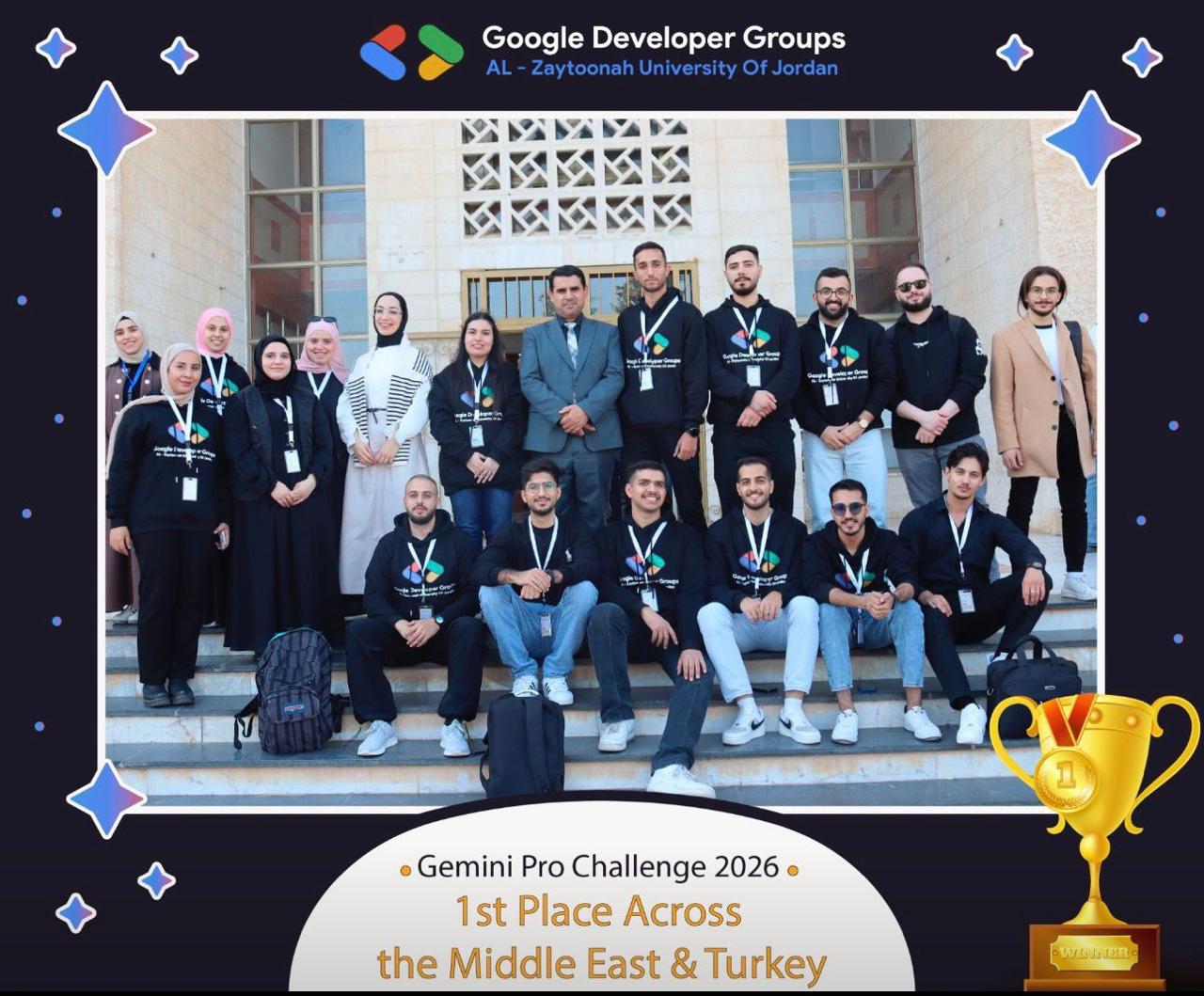 وجاء فوز الجامعة ثمرةً لجهود فريق GDG جامعة الزيتونة الأردنية بقيادة الطالبة هدى بني مصطفى، وبدعم وتنظيم من قسم هندسة البرمجيات ورئيسه الدكتور وائل الزيادات، إلى جانب روح العمل الجماعي والتفاني الذي أظهره مجتمع الجامعة، ما أسهم في تعزيز مكانة الجامعة إقليميًا وترسيخ دورها في نشر ثقافة الذكاء الاصطناعي بين الشباب الأردني. وتُوّج هذا التميّز بحصول جامعة الزيتونة الأردنية على جائزة المركز الأول، والمتمثلة في زيارة علمية إلى مكاتب Google في دبي، للاطلاع على أحدث التقنيات العالمية ضمن منظومة الريادة والابتكار.